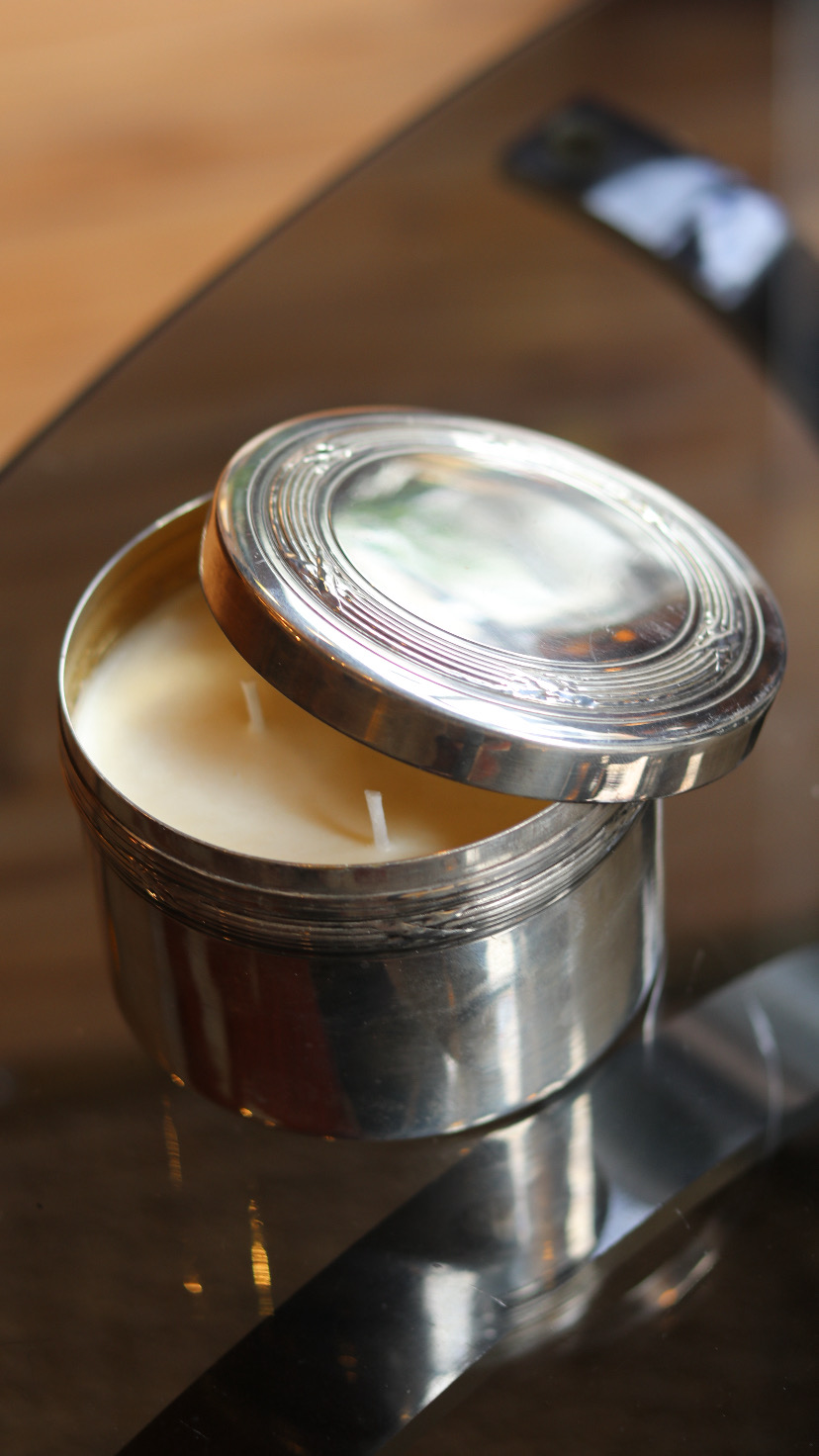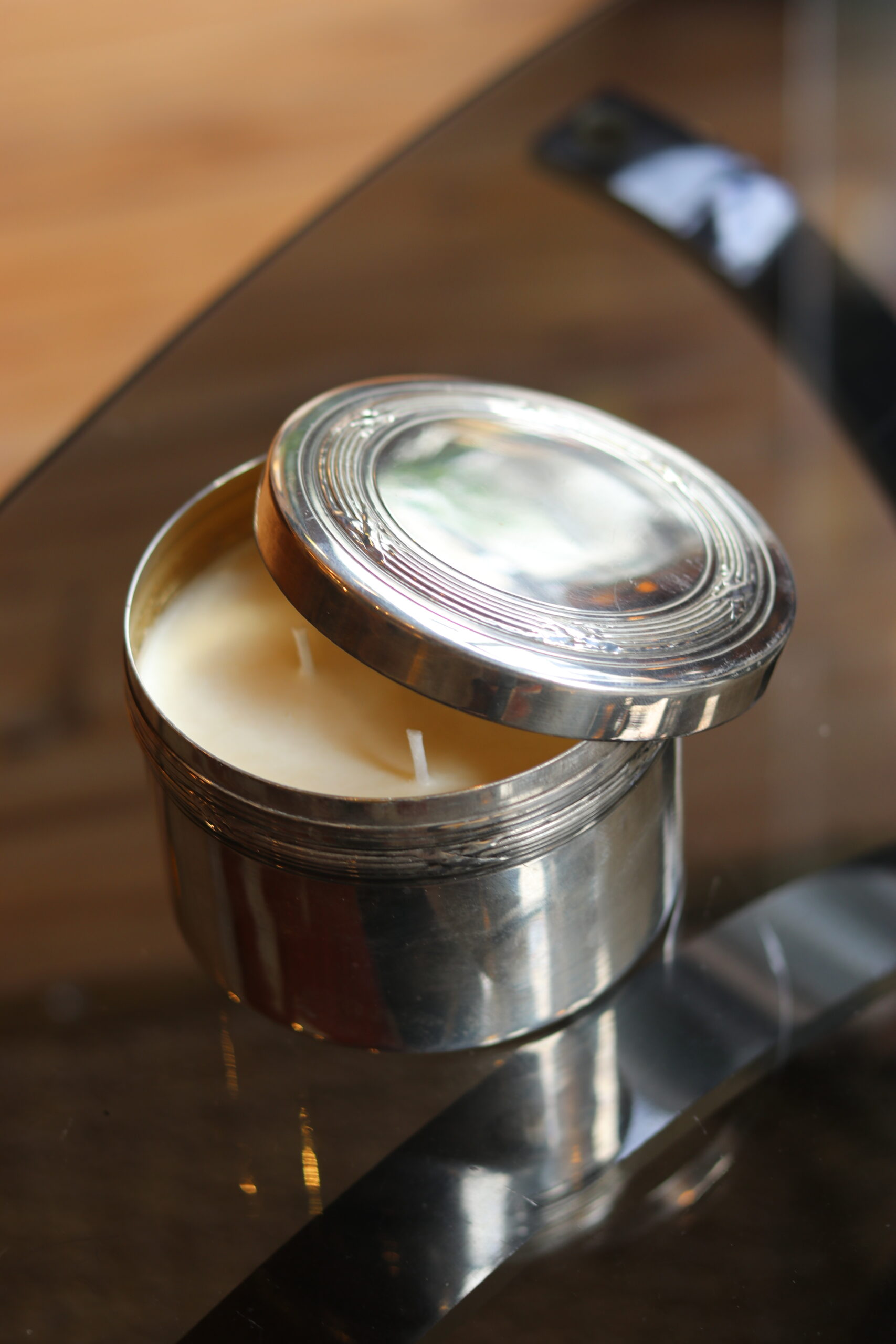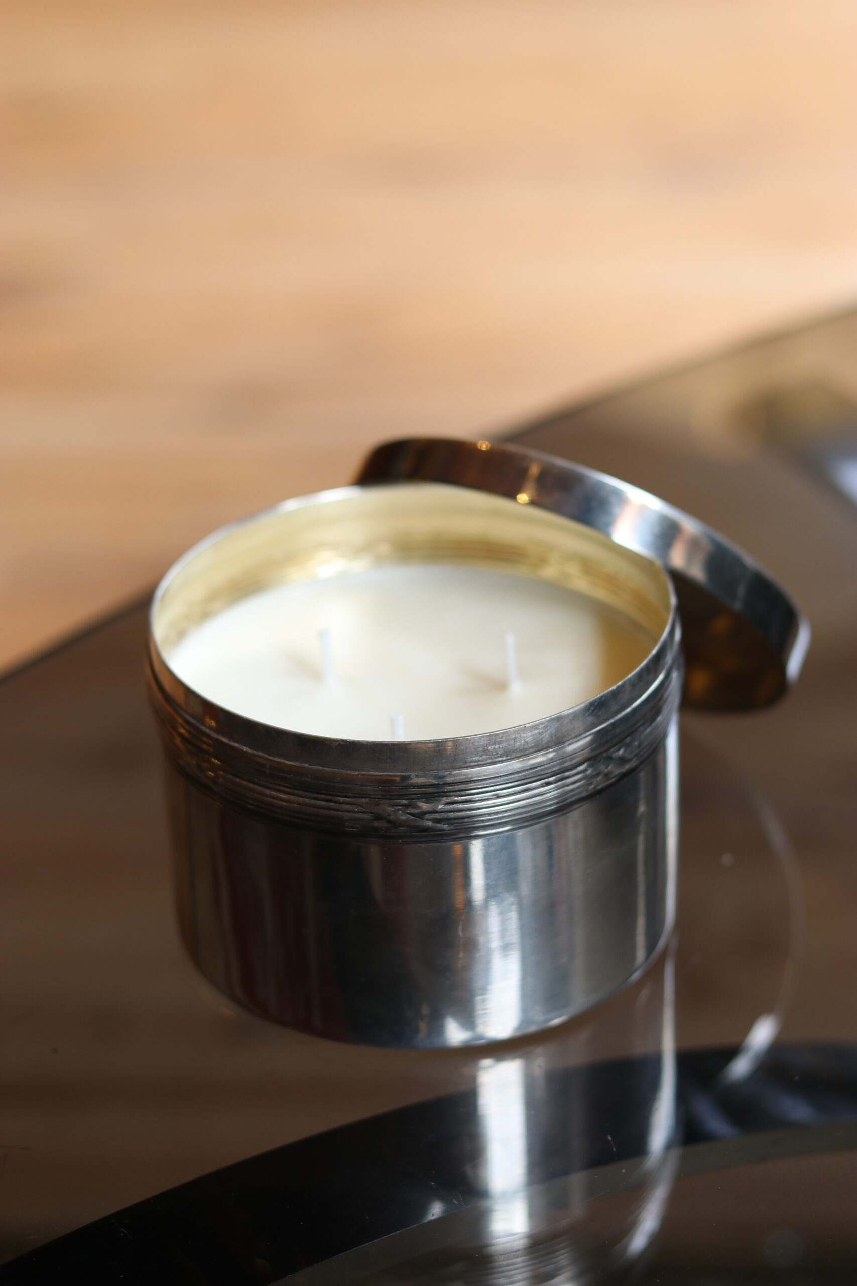 Bougie à la cire de soja, coulée dans une bonbonnière en métal argenté, parfum Cèdre du Liban, H: 9cm x 11cm
