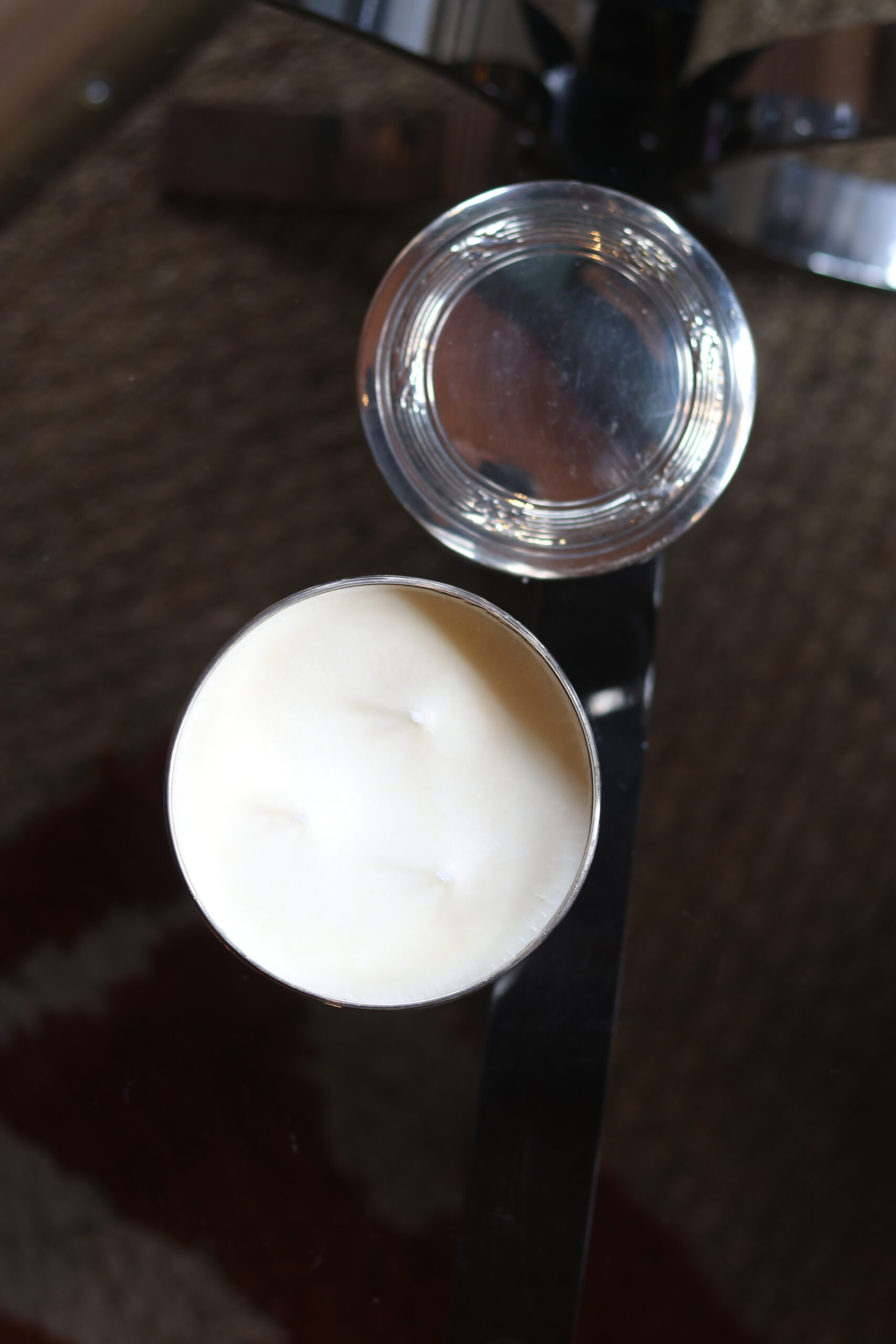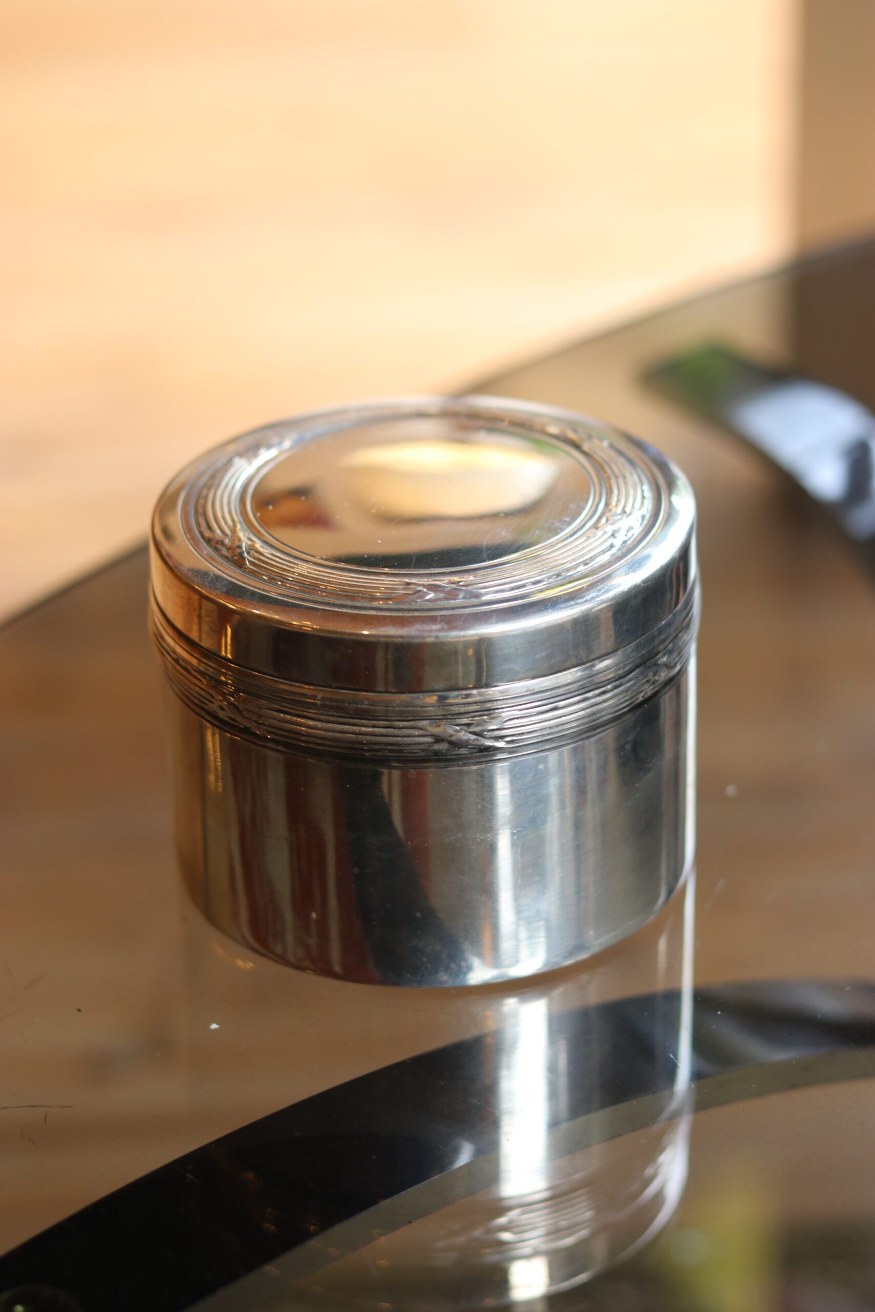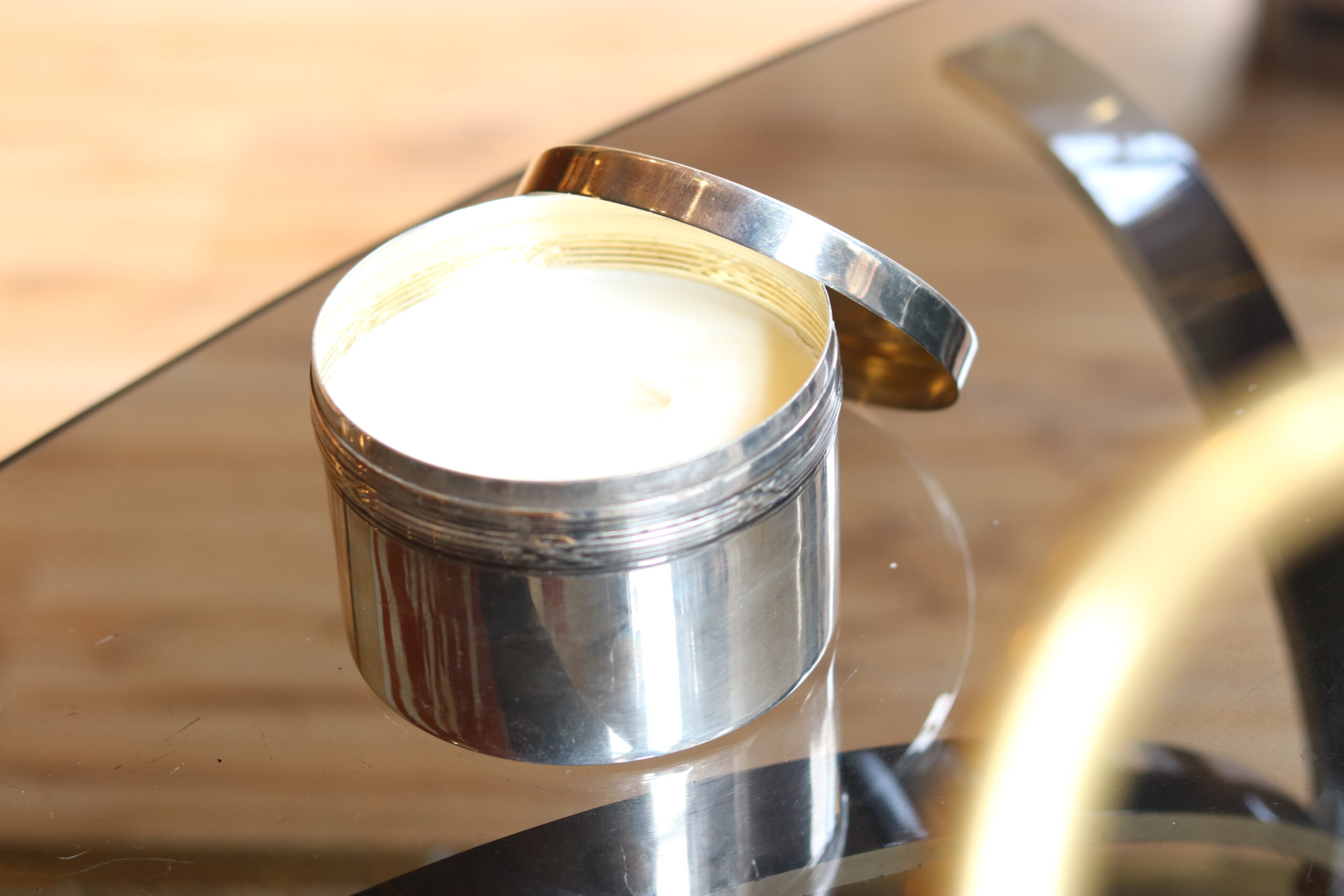 Bougie à la cire de soja, coulée dans une bonbonnière en métal argenté, parfum Cèdre du Liban, H: 9cm x 11cm