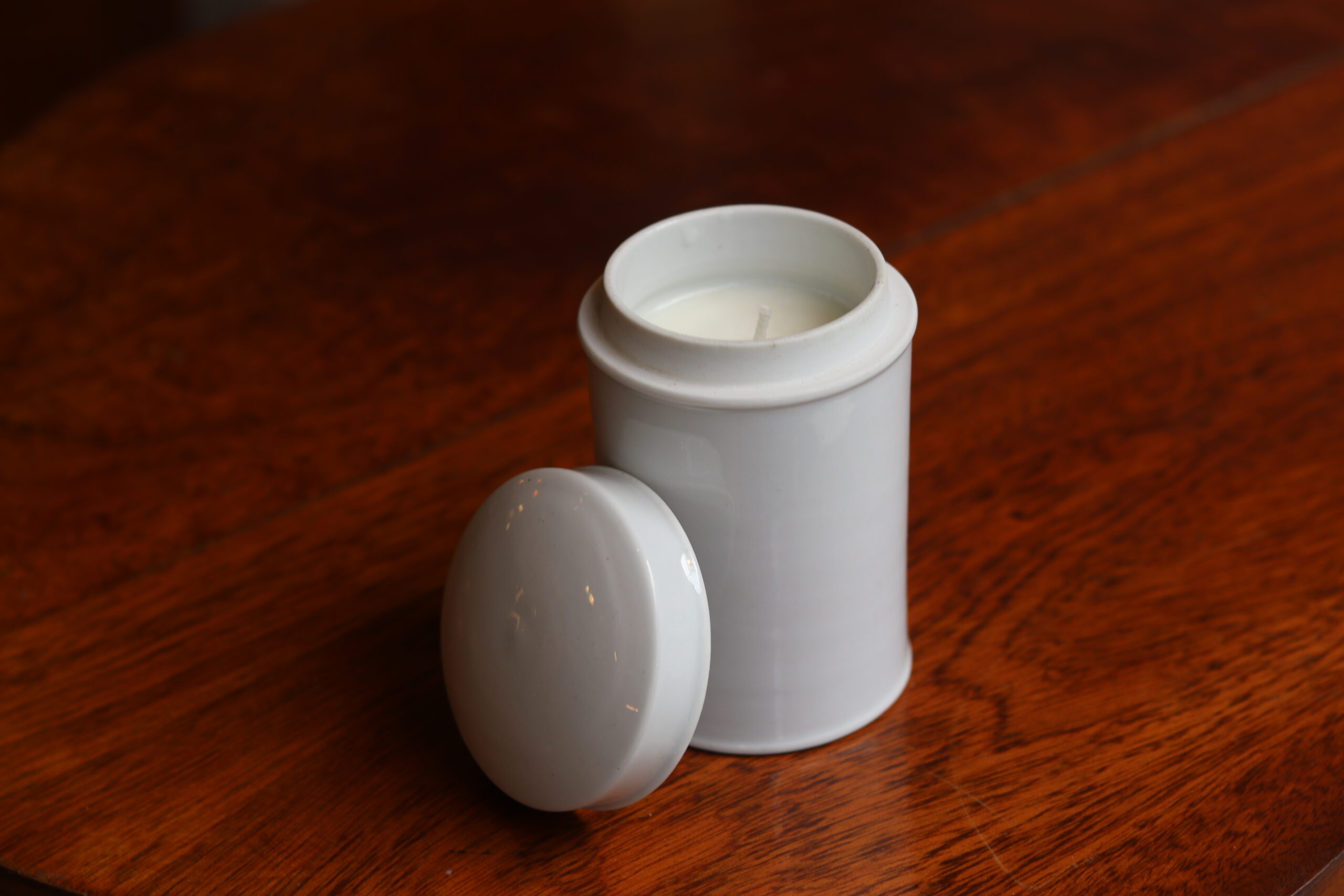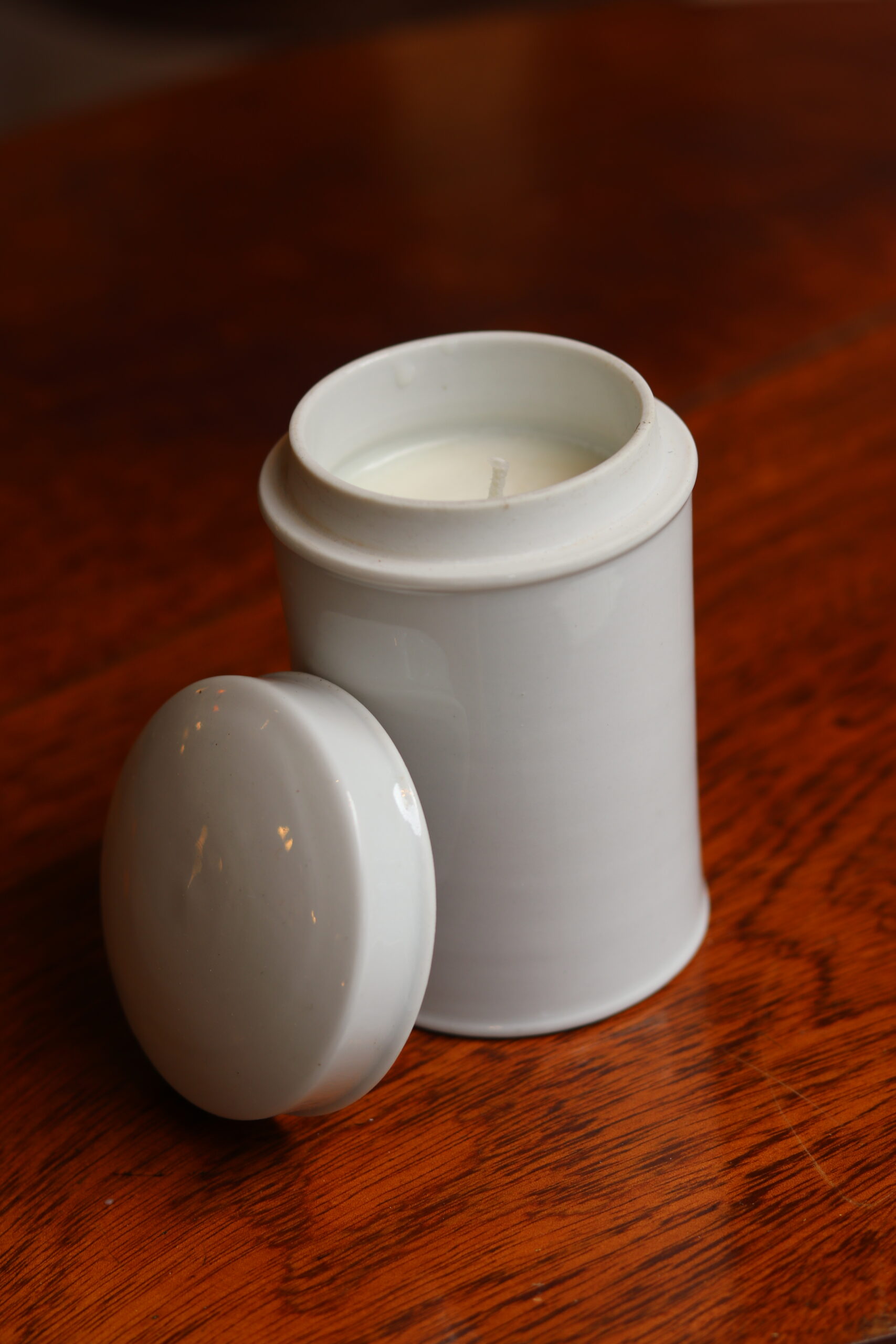 Bougie cire de soja parfumé dans ancien pot de pharmacie, début XXe (années 30).