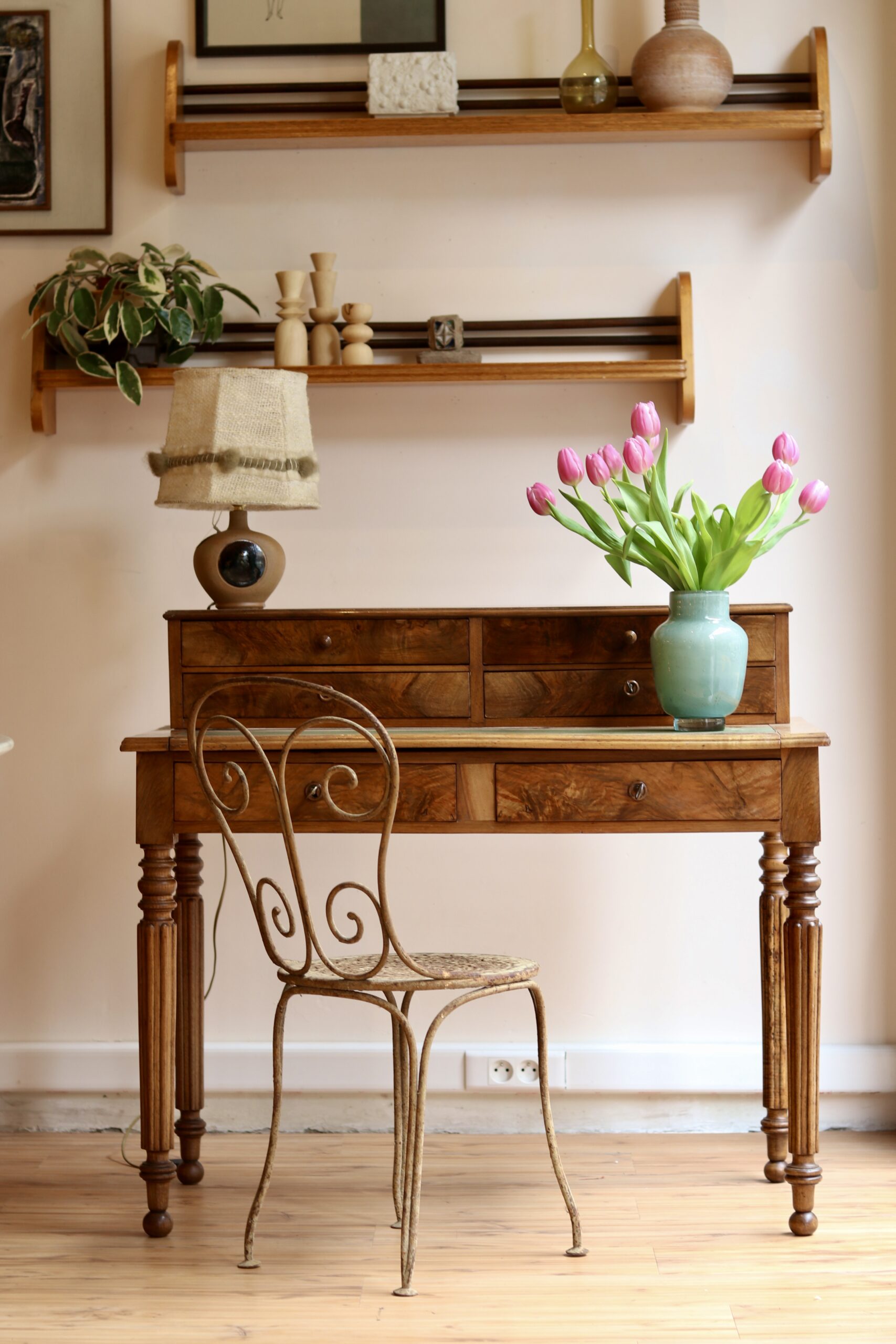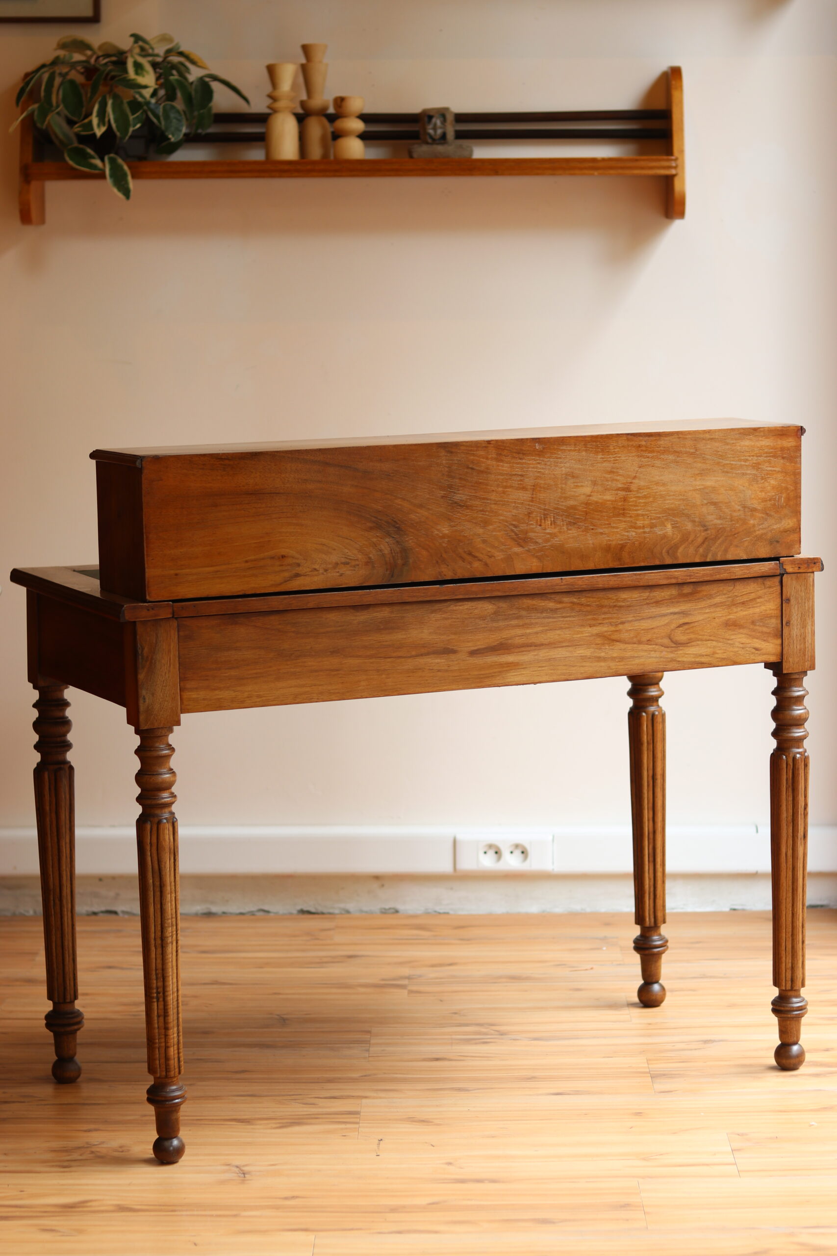 Reposant sur des pieds tournés à cannelures, caractéristiques du style Louis-Philippe, ce bureau présente des proportions équilibrées et une allure à la fois sobre et raffinée. Une pièce authentique, idéale pour apporter du cachet à un intérieur tout en restant parfaitement fonctionnelle.