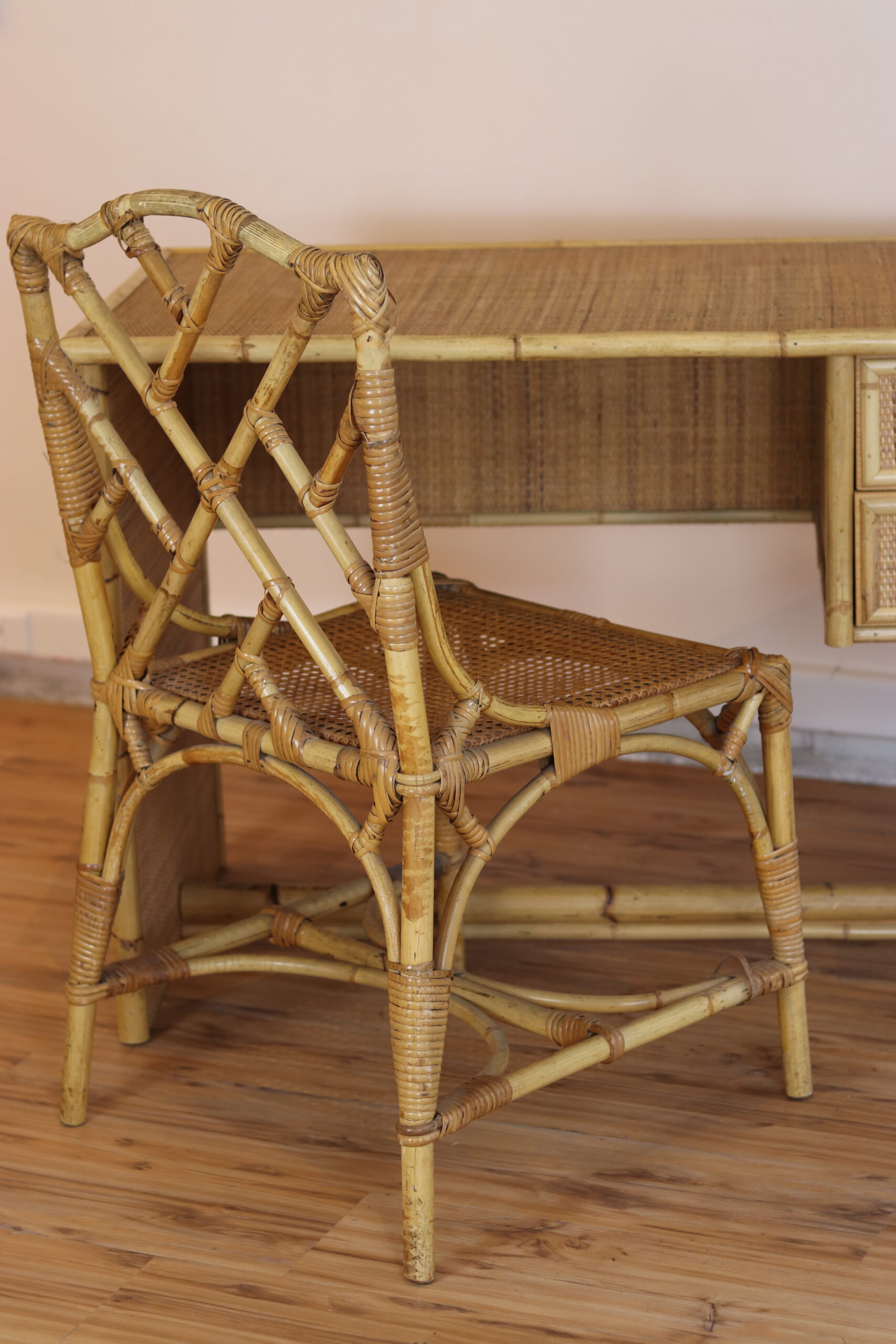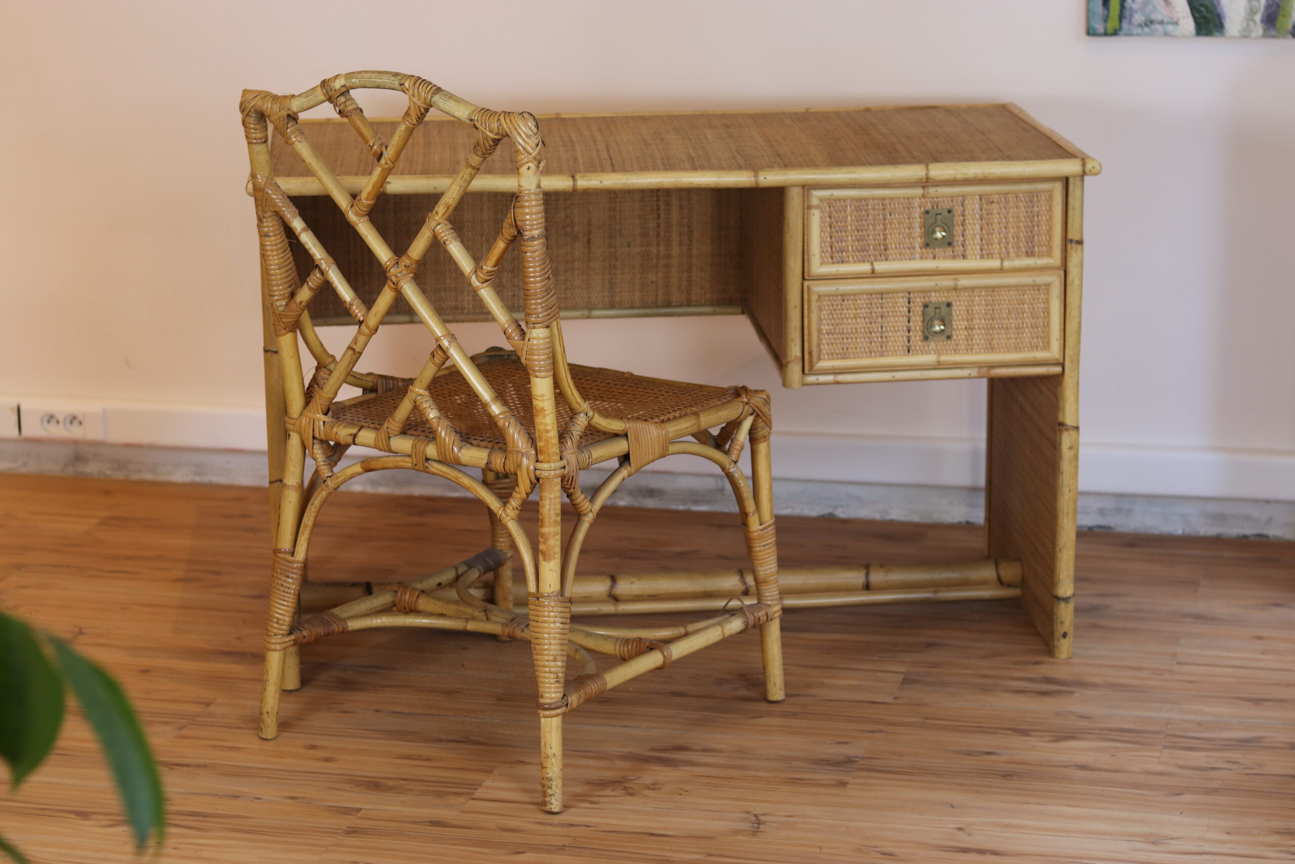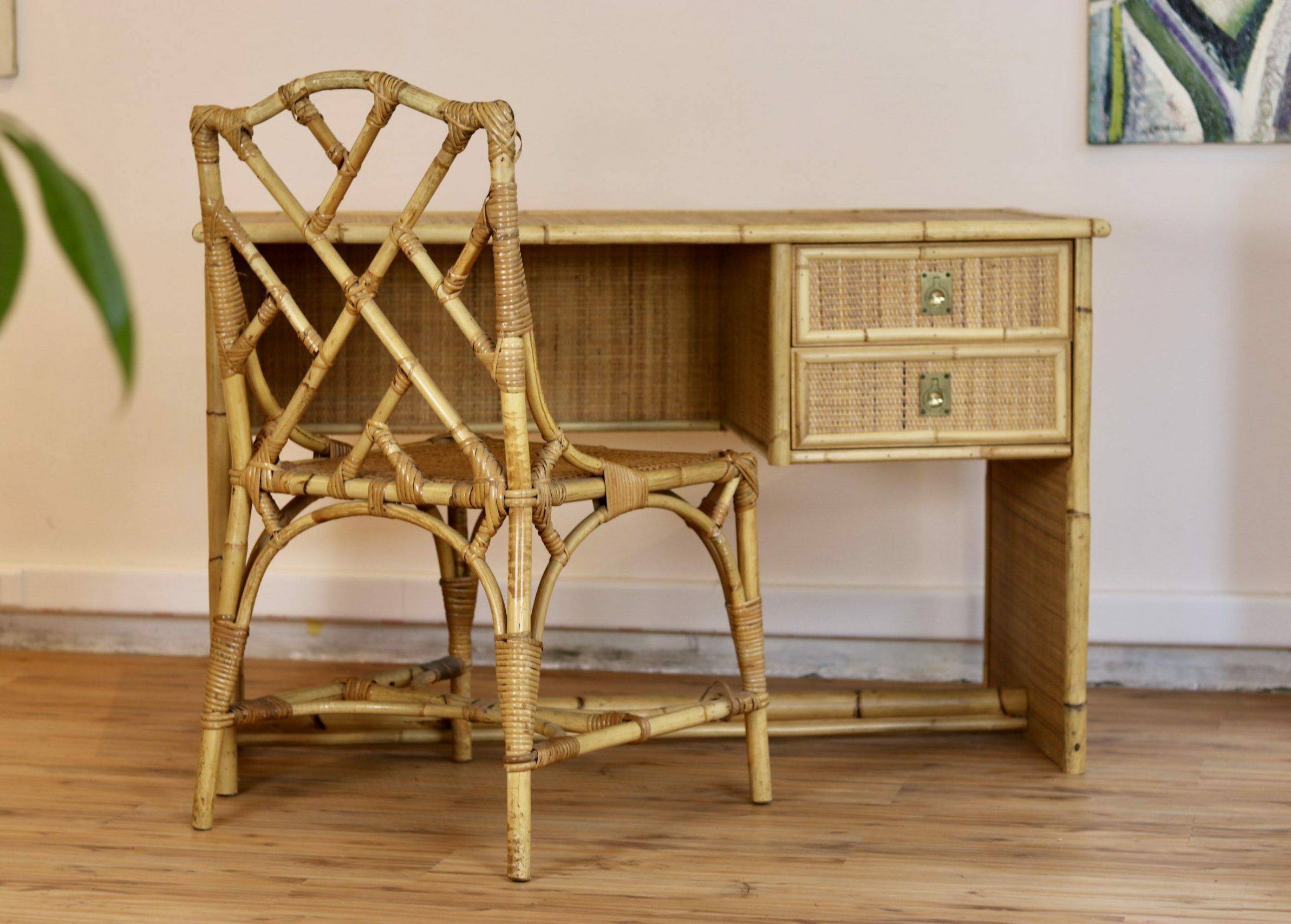 Bureau vintage signée Dal Vera (Italie, années 70) en bambou & rotin, longueur 120 cm – profondeur 59 cm – hauteur 75 cm. Accompagné d’une chaise en canage bambou/rotin.