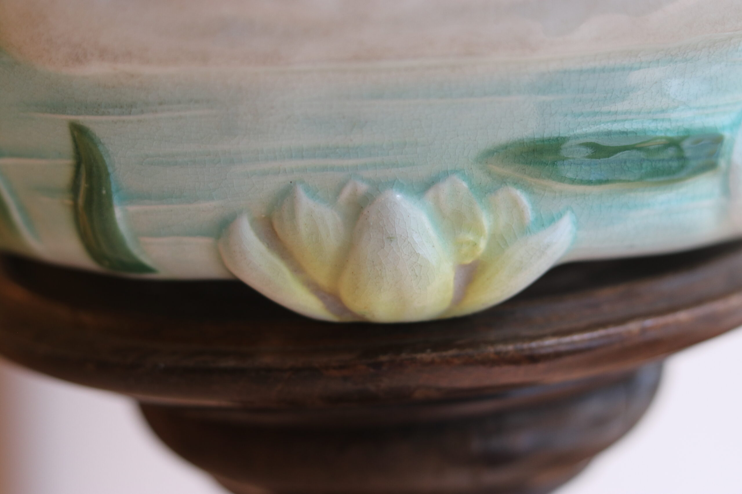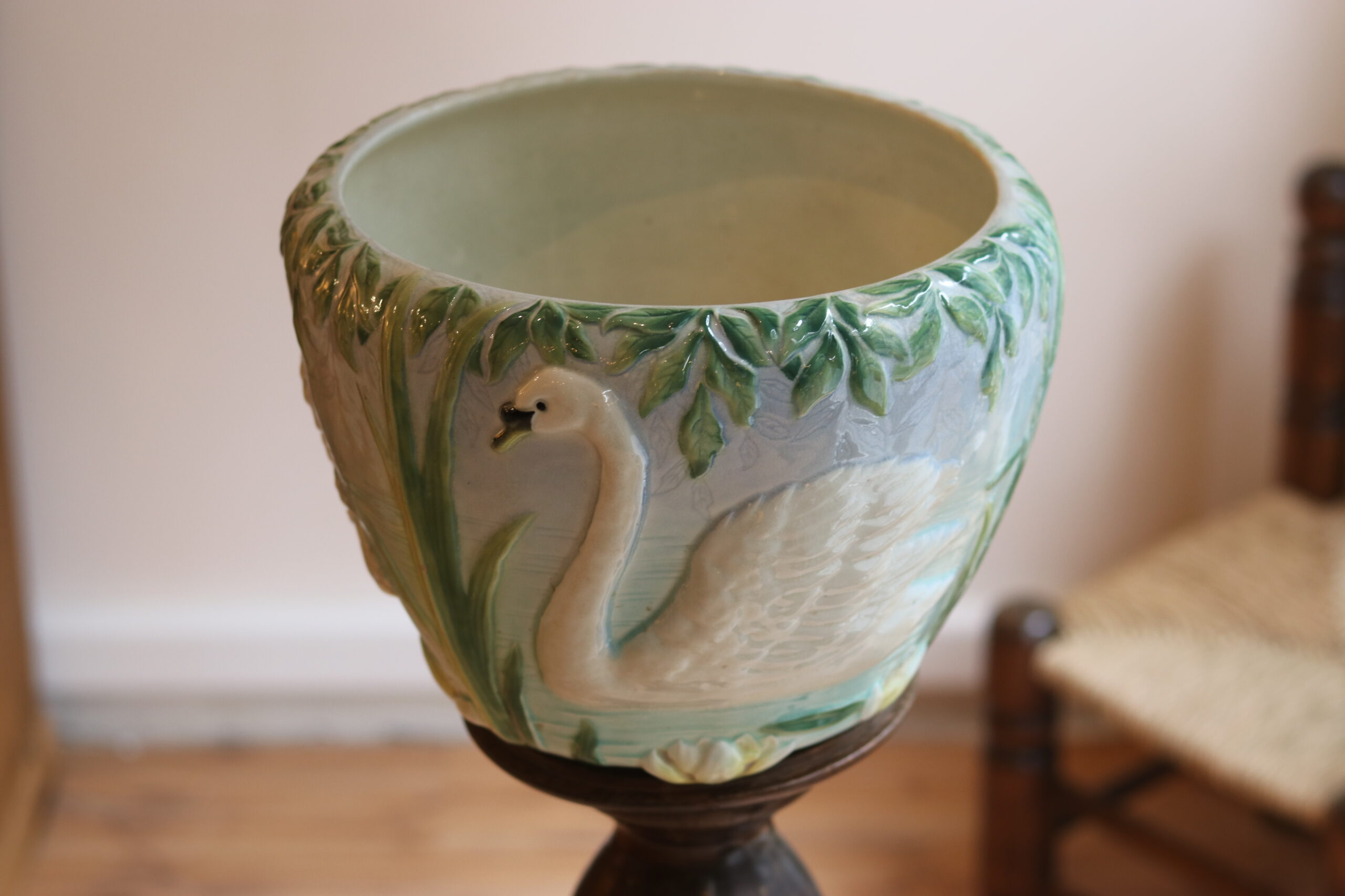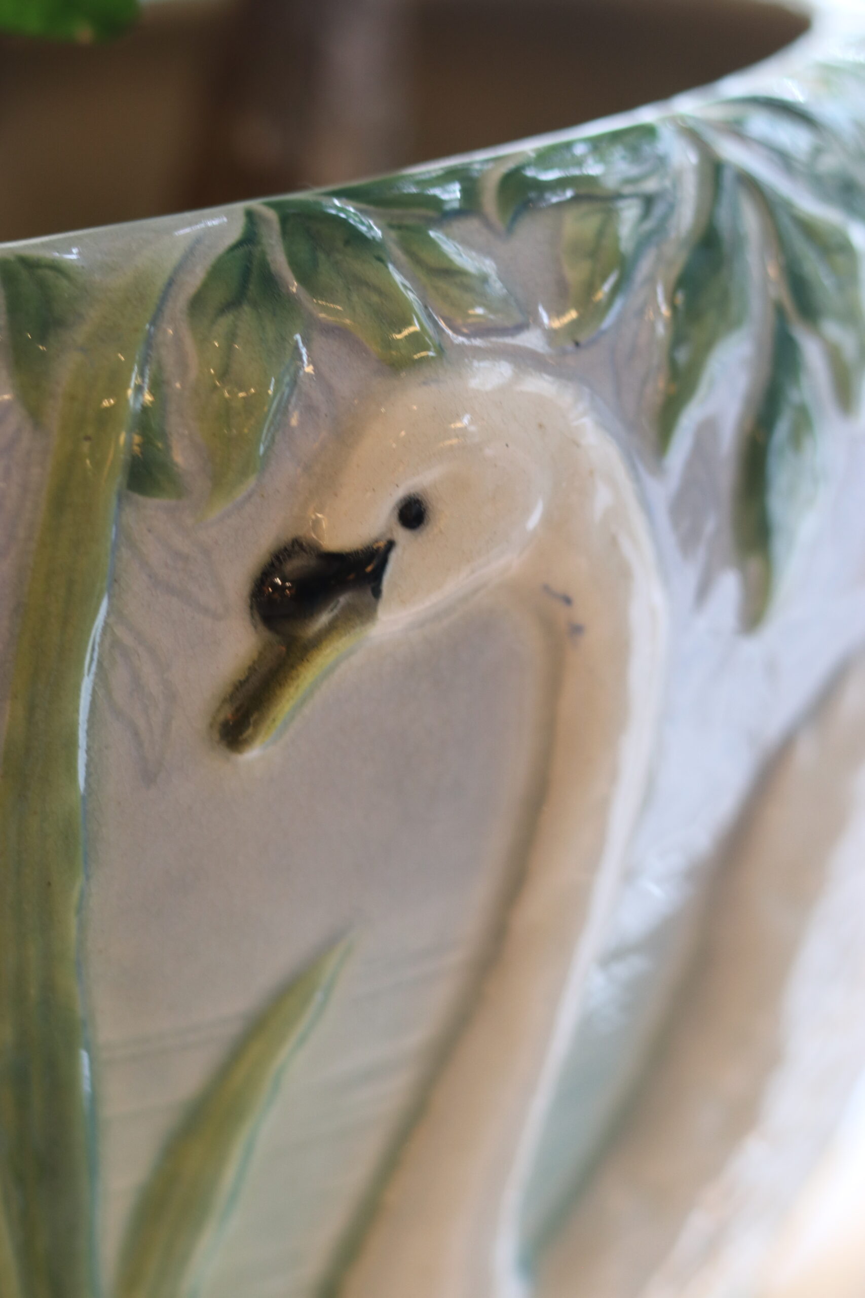 Superbe cache-pot en barbotine d’époque et de style Art Nouveau, réalisé vers 1900 par la prestigieuse manufacture française de Saint-Clément. Le décor en haut relief représente une scène aquatique: cygnes glissant sur l’eau, nénuphars, roseaux et frondaisons stylisées — un vocabulaire typiquement naturaliste et poétique de cette époque. La pièce est signée et se distingue par une très belle qualité de modelage ainsi que par une palette douce mêlant verts, bleus et blancs, qui met en valeur le mouvement des cygnes et la délicatesse de l’eau. Avec ses dimensions généreuses (23 cm de hauteur, 31 cm de diamètre) et son excellent état de conservation, il constitue une pièce décorative remarquable, idéale pour accueillir une plante ou être simplement exposé.