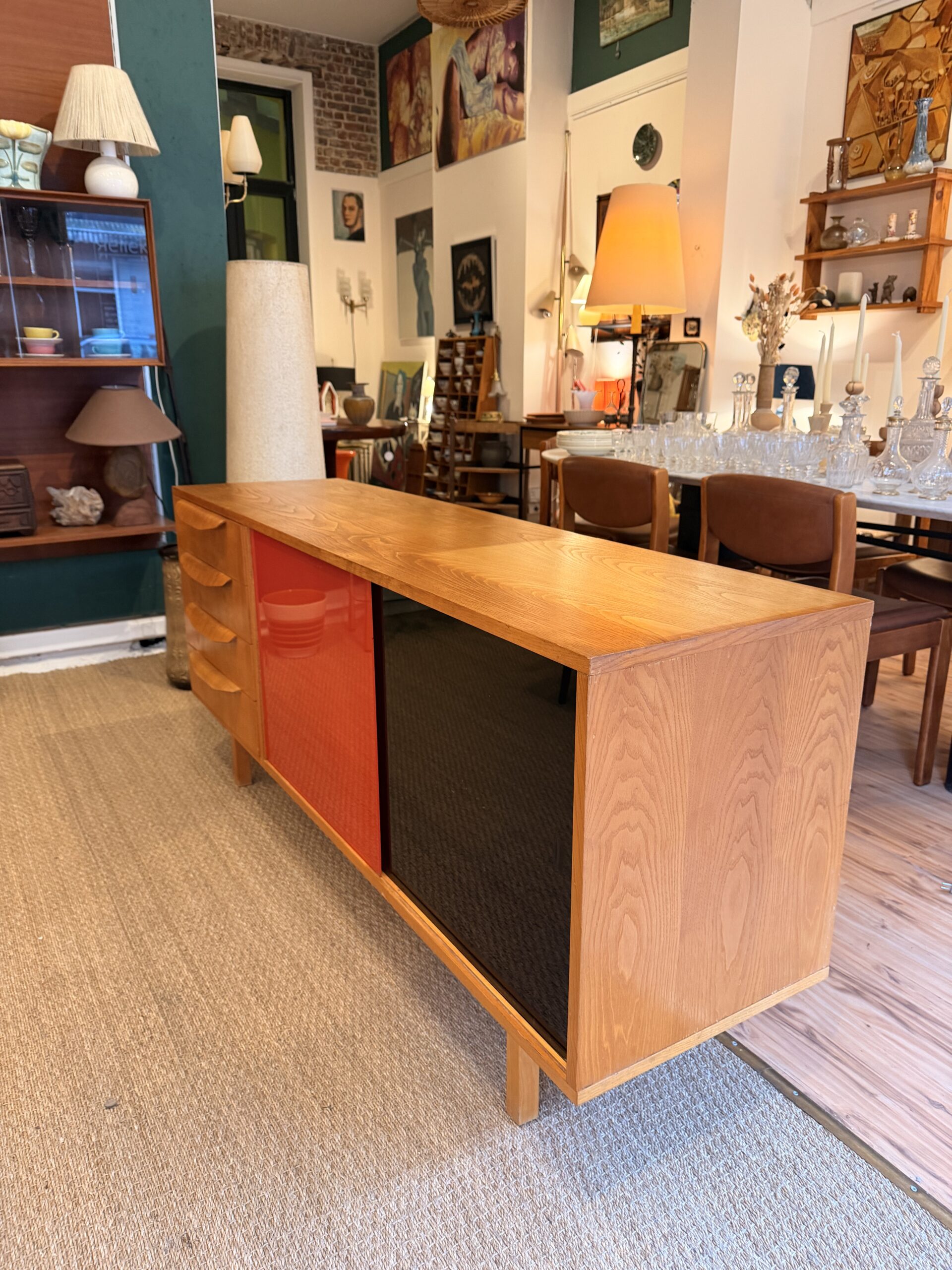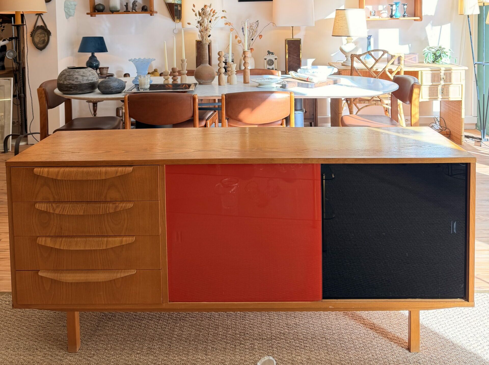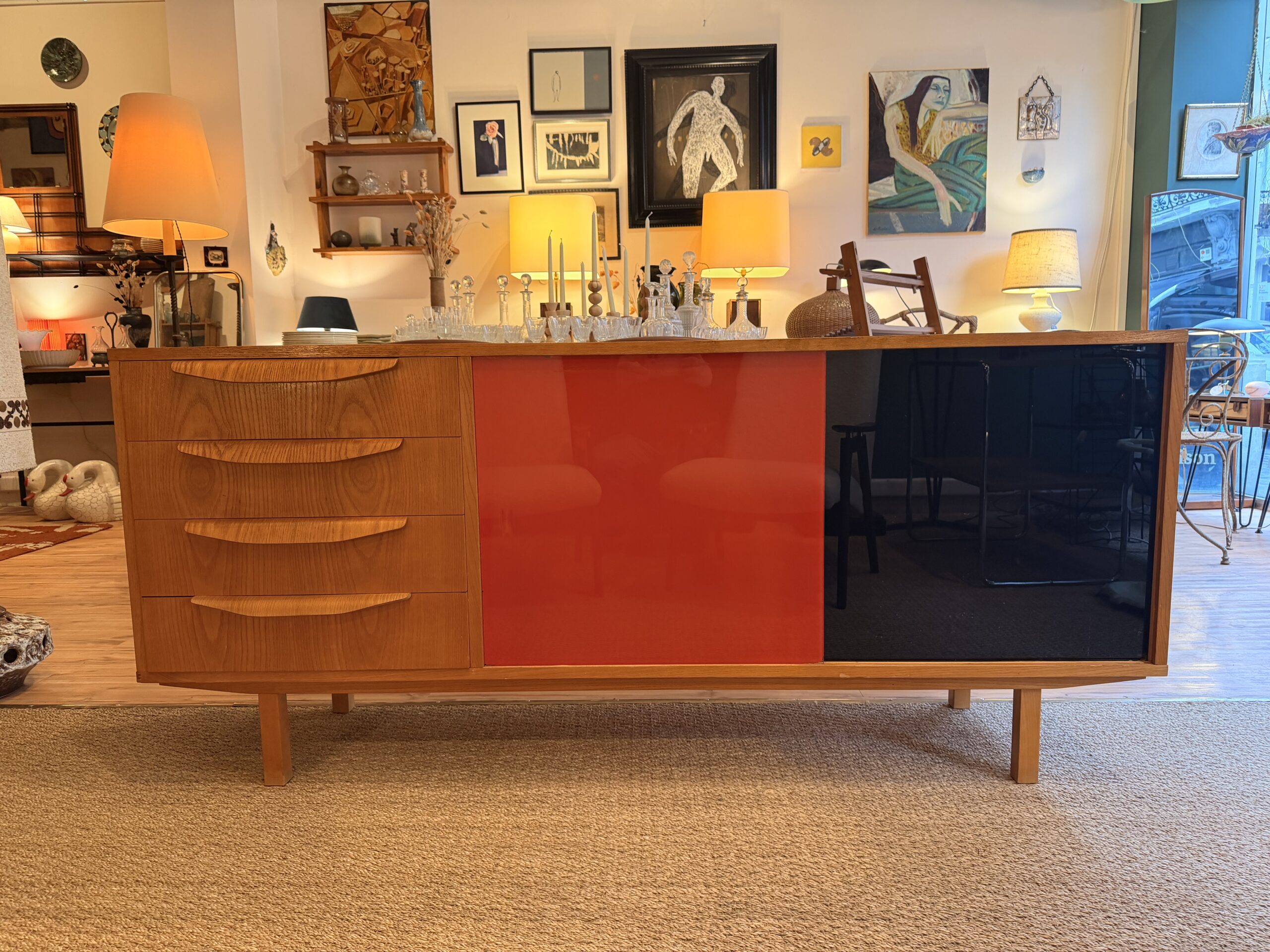 Enfilade vintage années 60 en bois (probablement placage chêne), avec 4 tiroirs et 2 portes vitrées colorées rouge et noire.