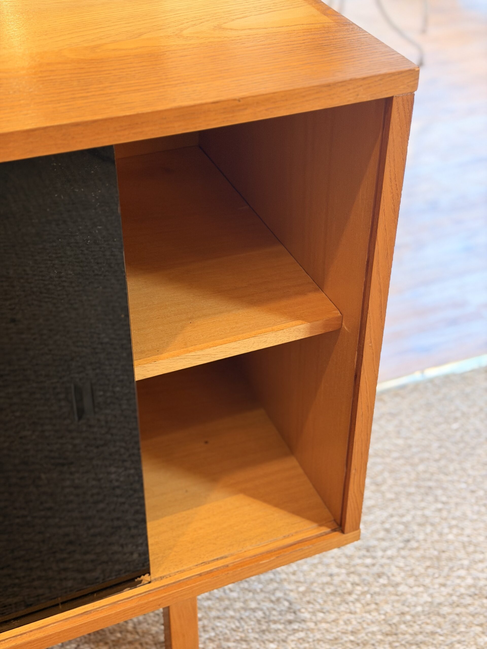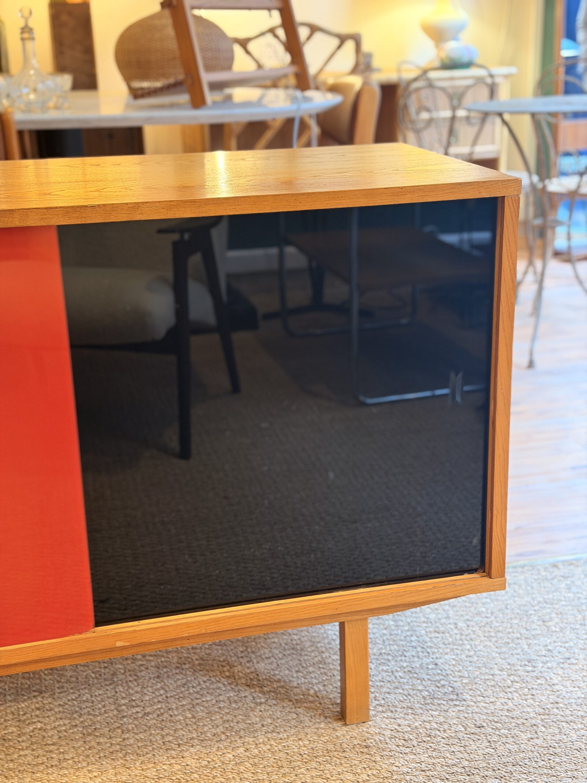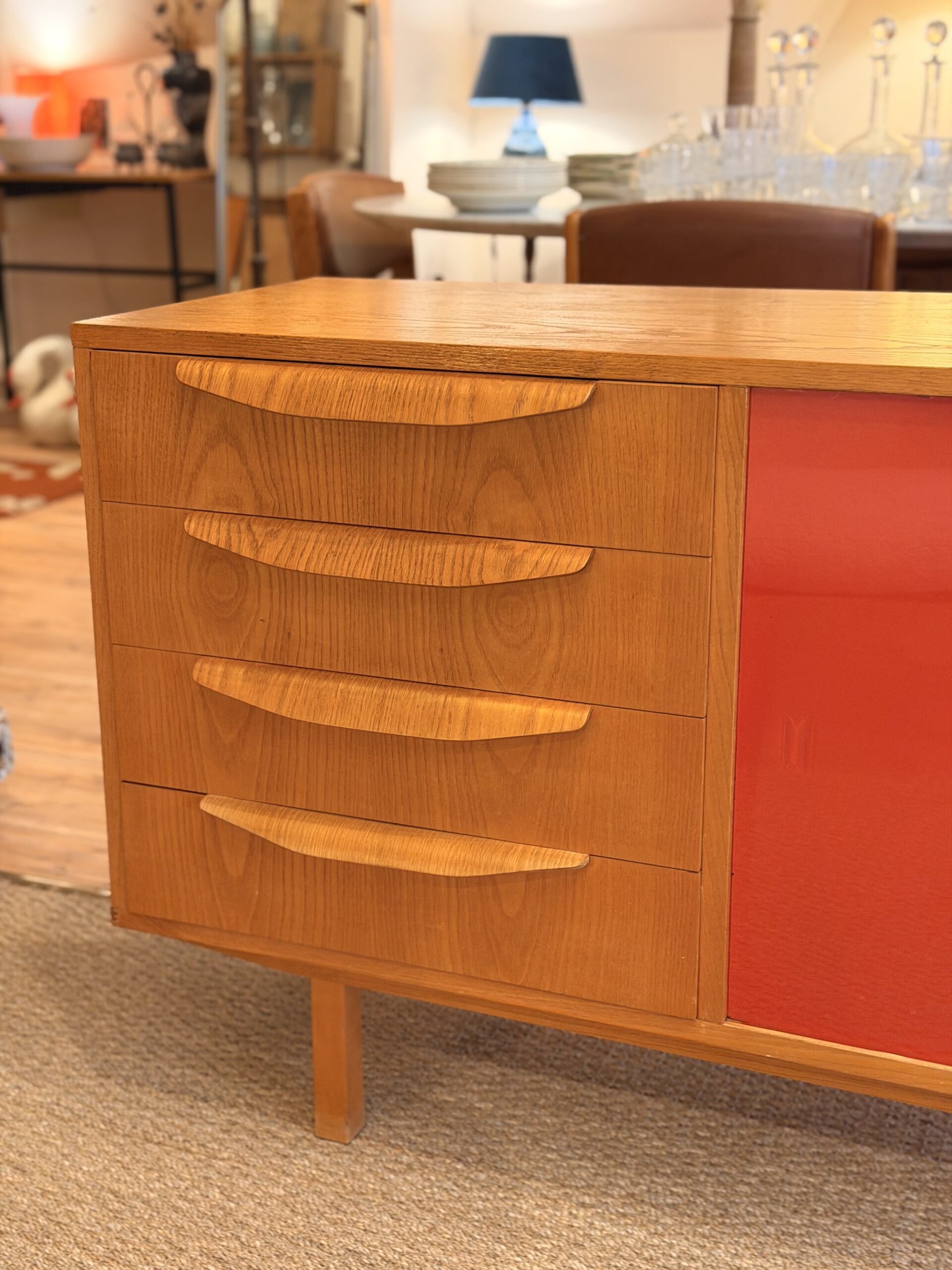 Enfilade vintage années 60 en bois (probablement placage chêne), avec 4 tiroirs et 2 portes vitrées colorées rouge et noire.