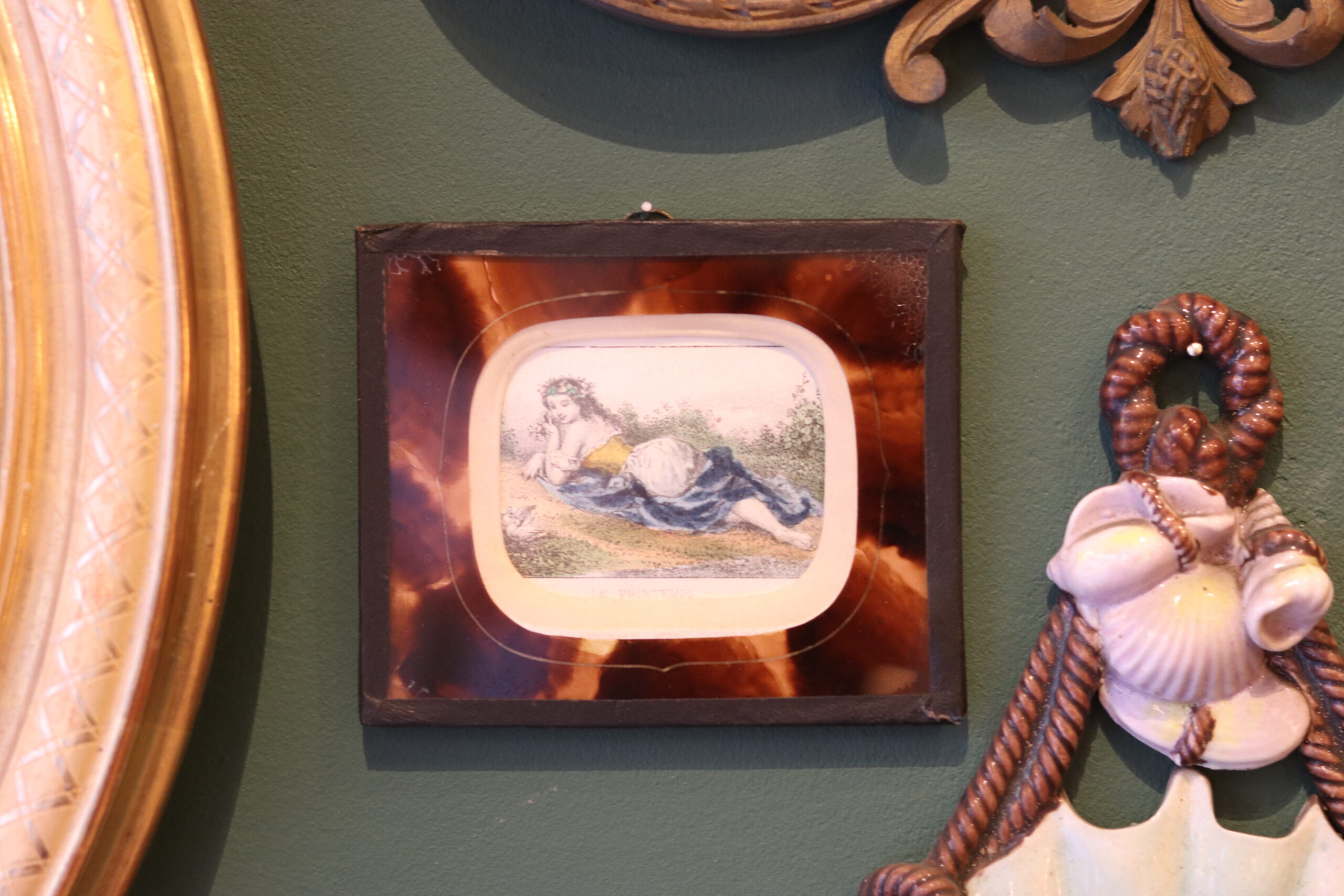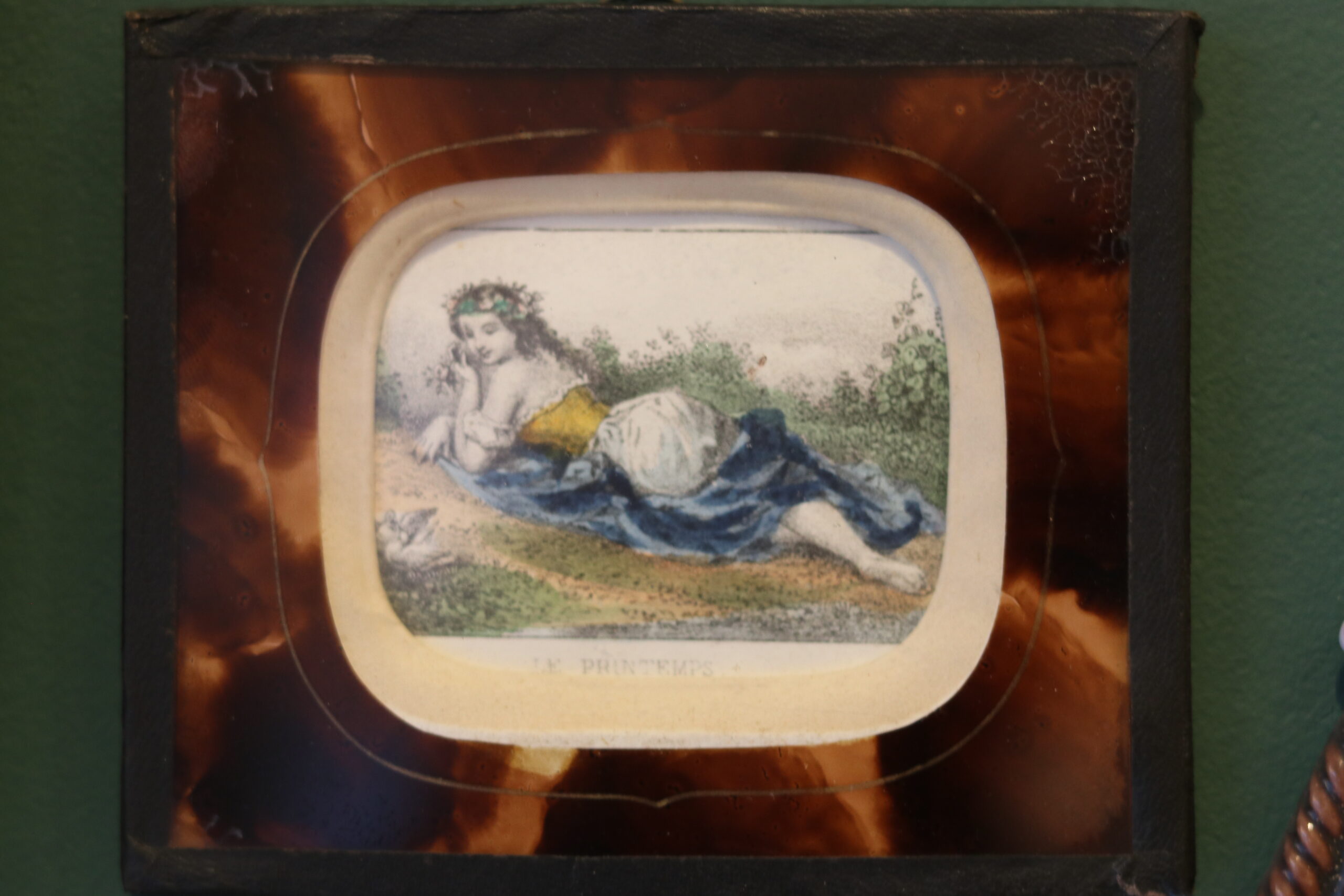 Gravure miniature rehaussée à l’aquarelle Le Printemps, fin XIXe, femme allongée.