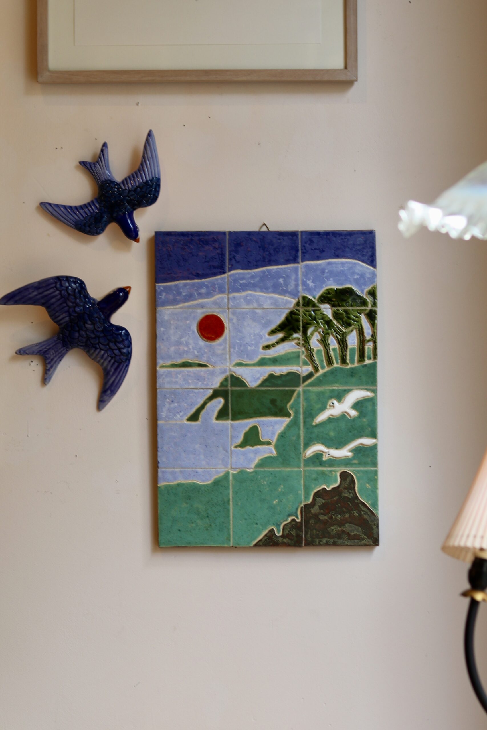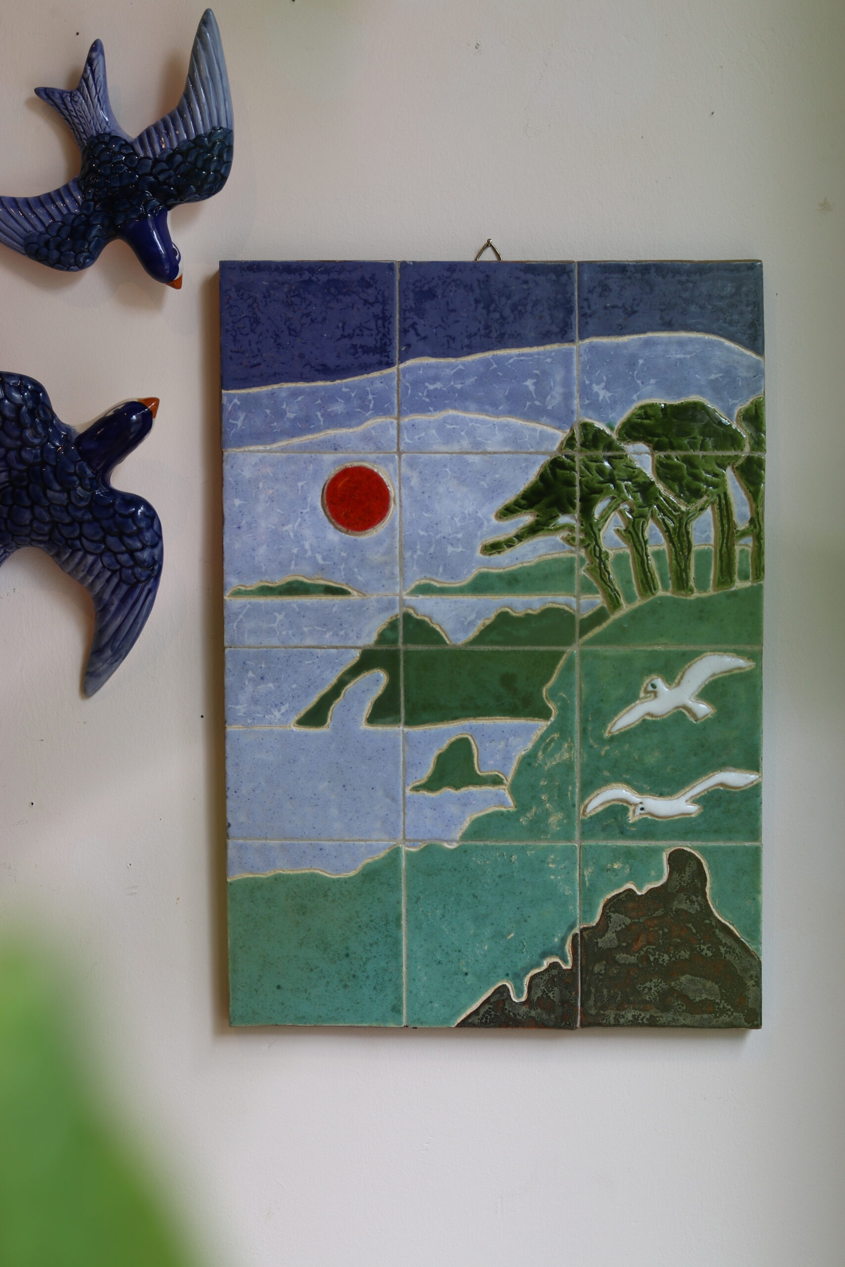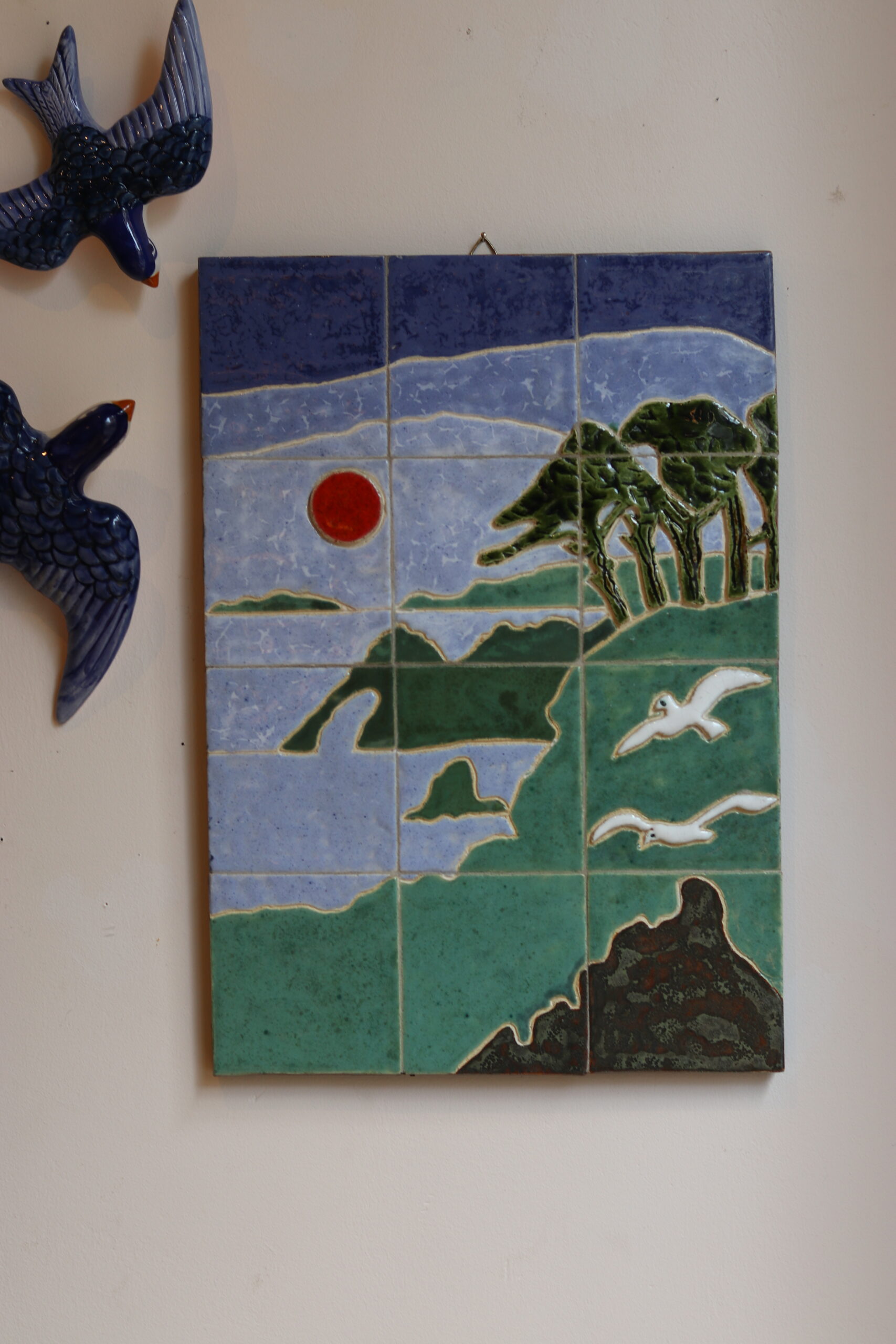 Ce panneau mural en céramique émaillée de Jeannine Weymeers représente un paysage de bord de mer dans un style épuré et poétique, typique des années 1970. La composition joue avec des aplats de couleurs douces – bleu, vert et touches de rouge – évoquant un coucher de soleil sur une côte stylisée, animée par quelques oiseaux en vol et une végétation graphique.
