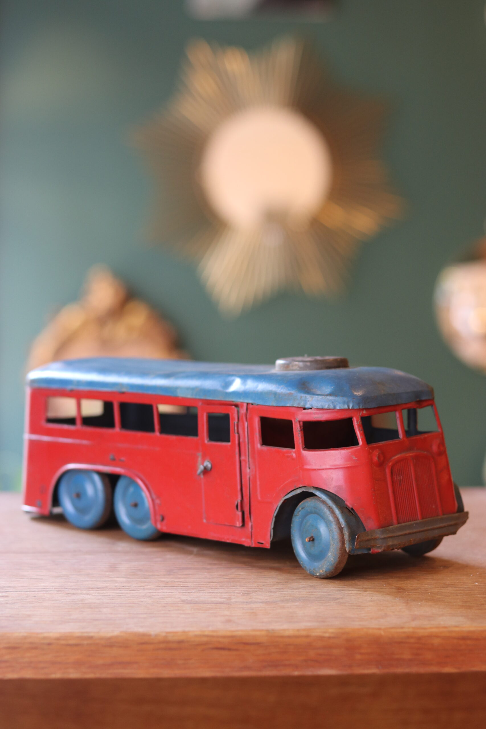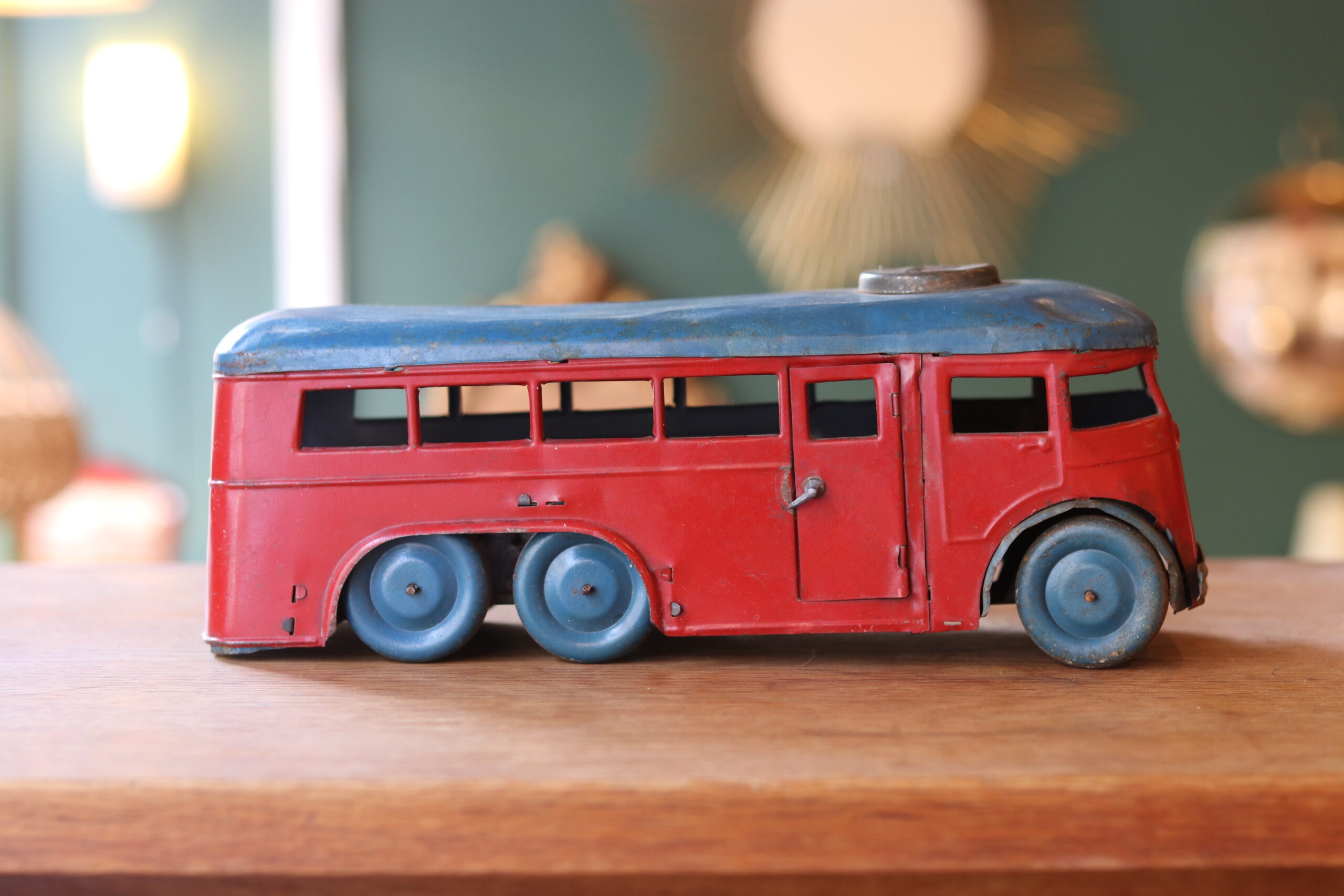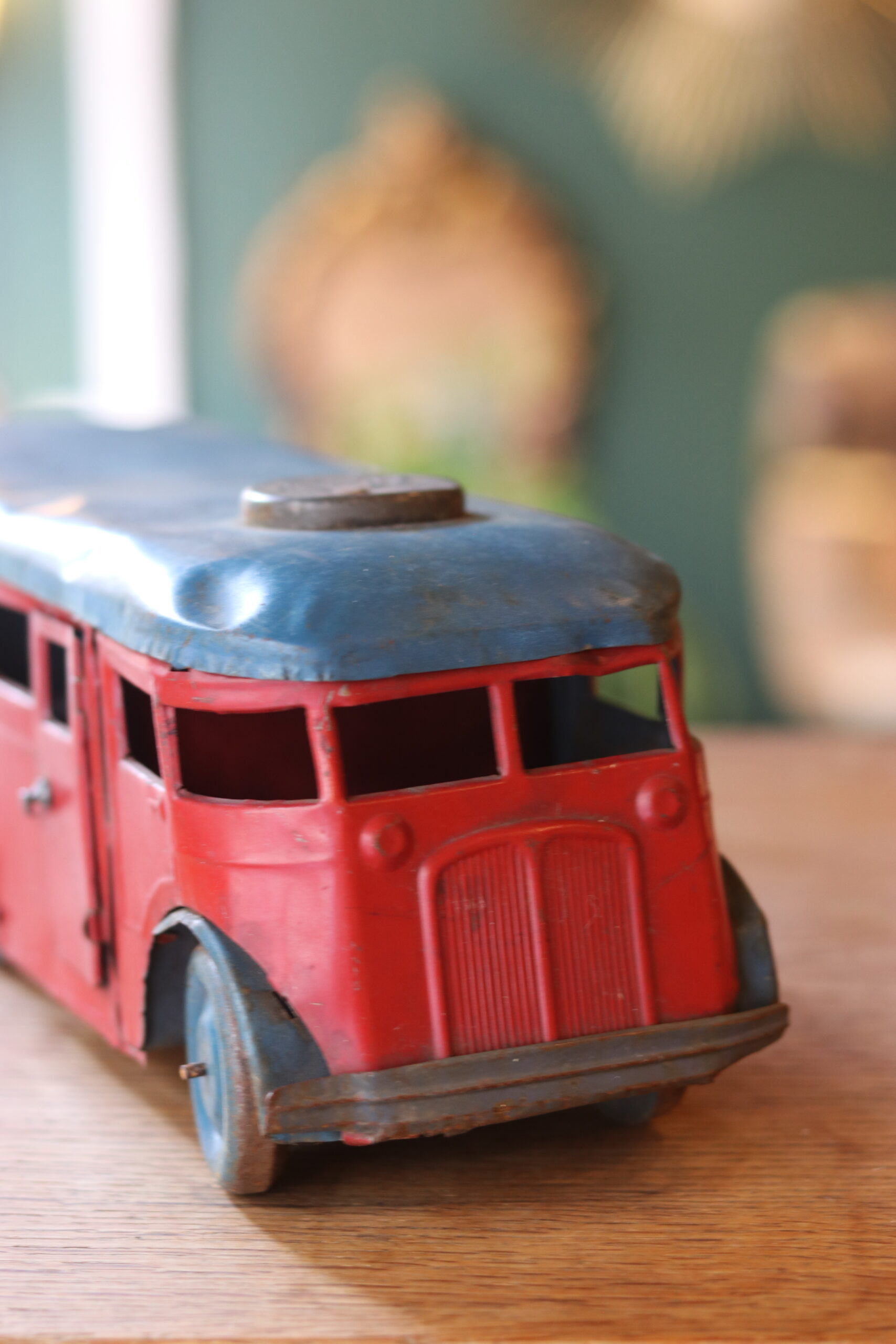 Joustra, trolleybus Renault en tôle (v.1950). 6 roues, 29 cm, mécanisme fonctionnel mais poignée manquante et bosses. Bel objet de collection.