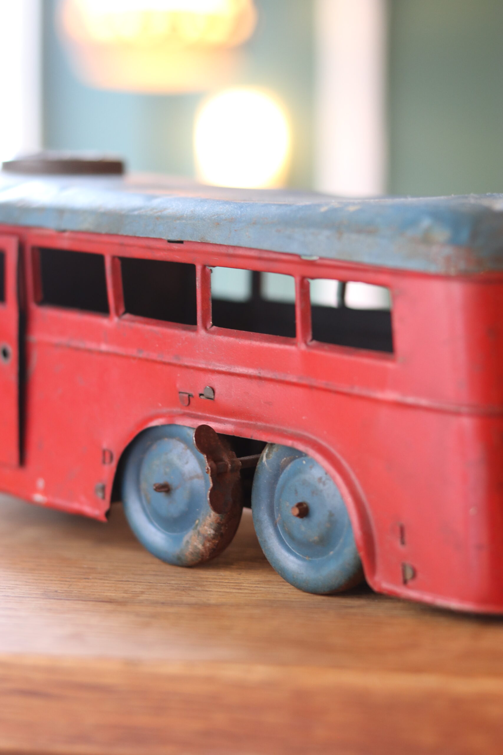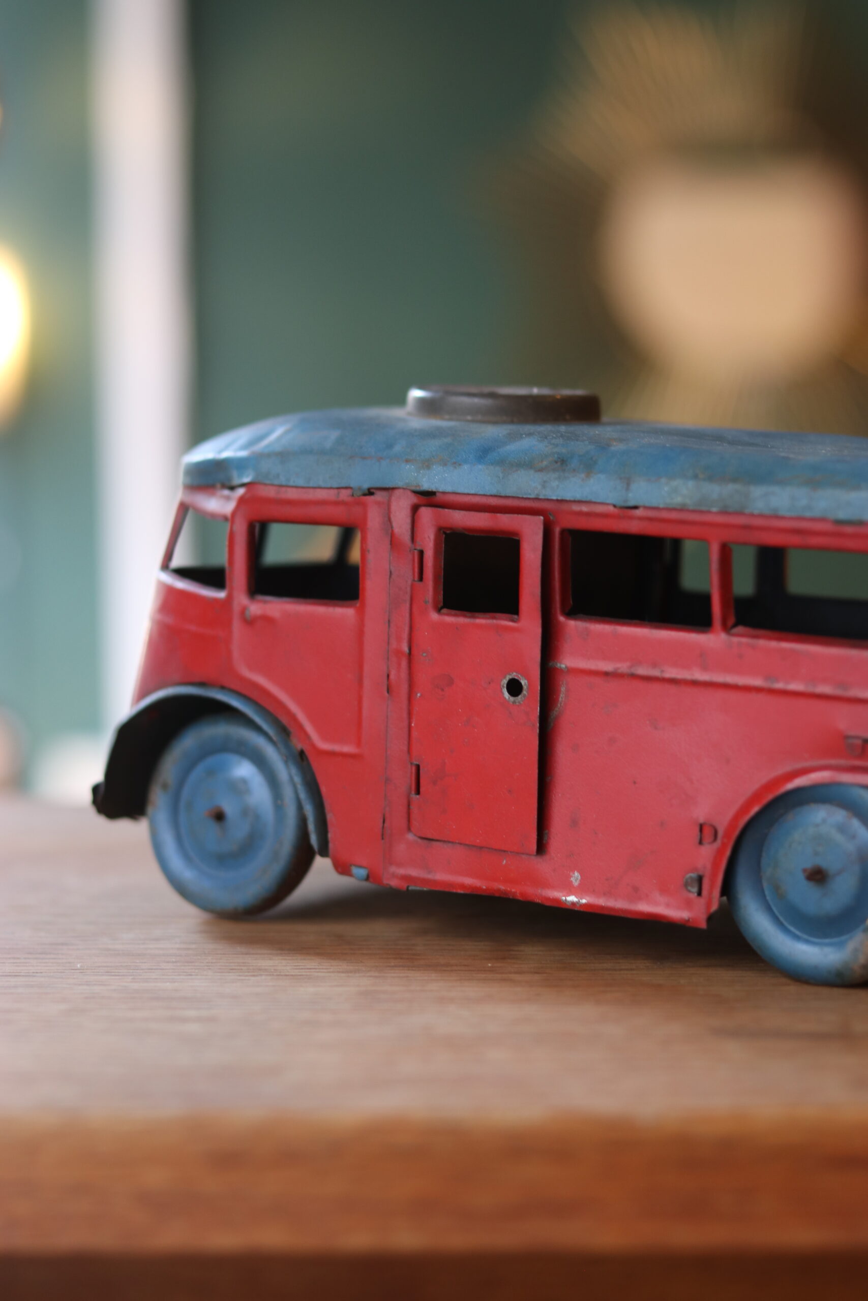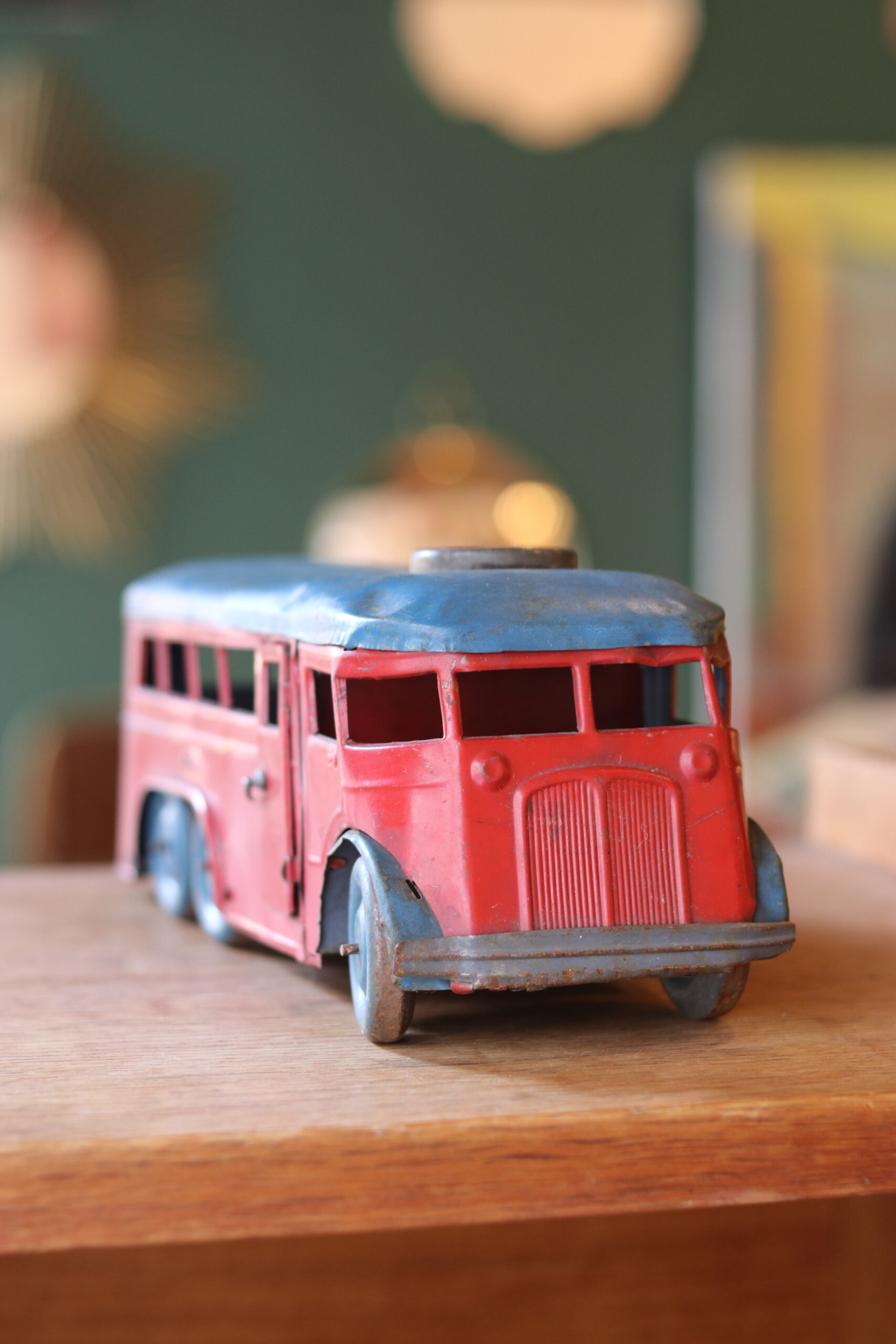 Joustra, trolleybus Renault en tôle (v.1950). 6 roues, 29 cm, mécanisme fonctionnel mais poignée manquante et bosses. Bel objet de collection.