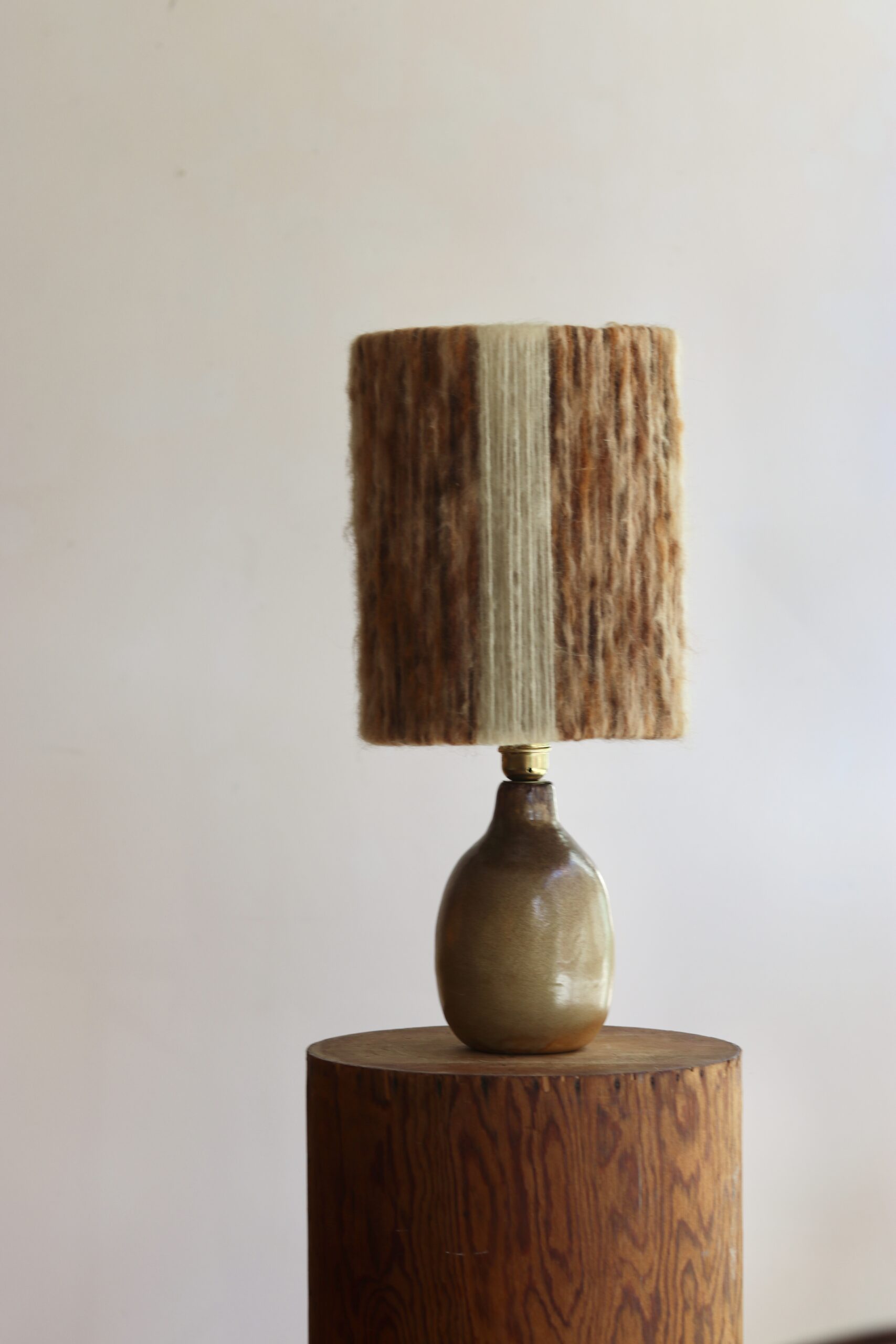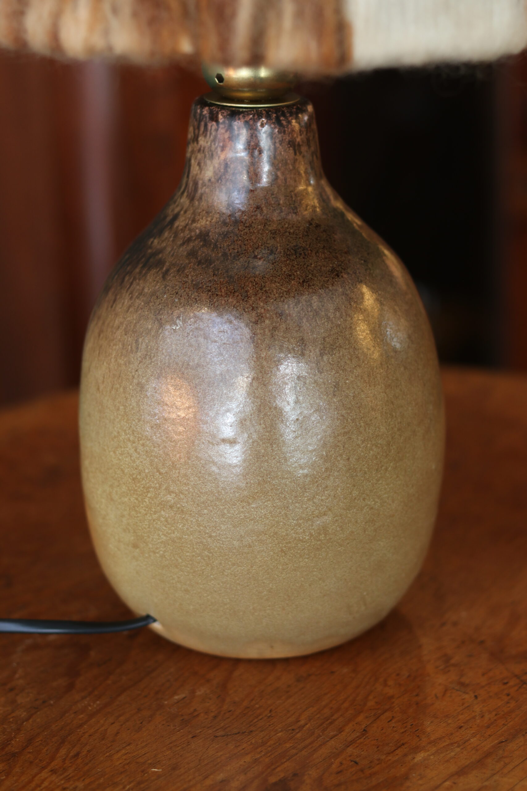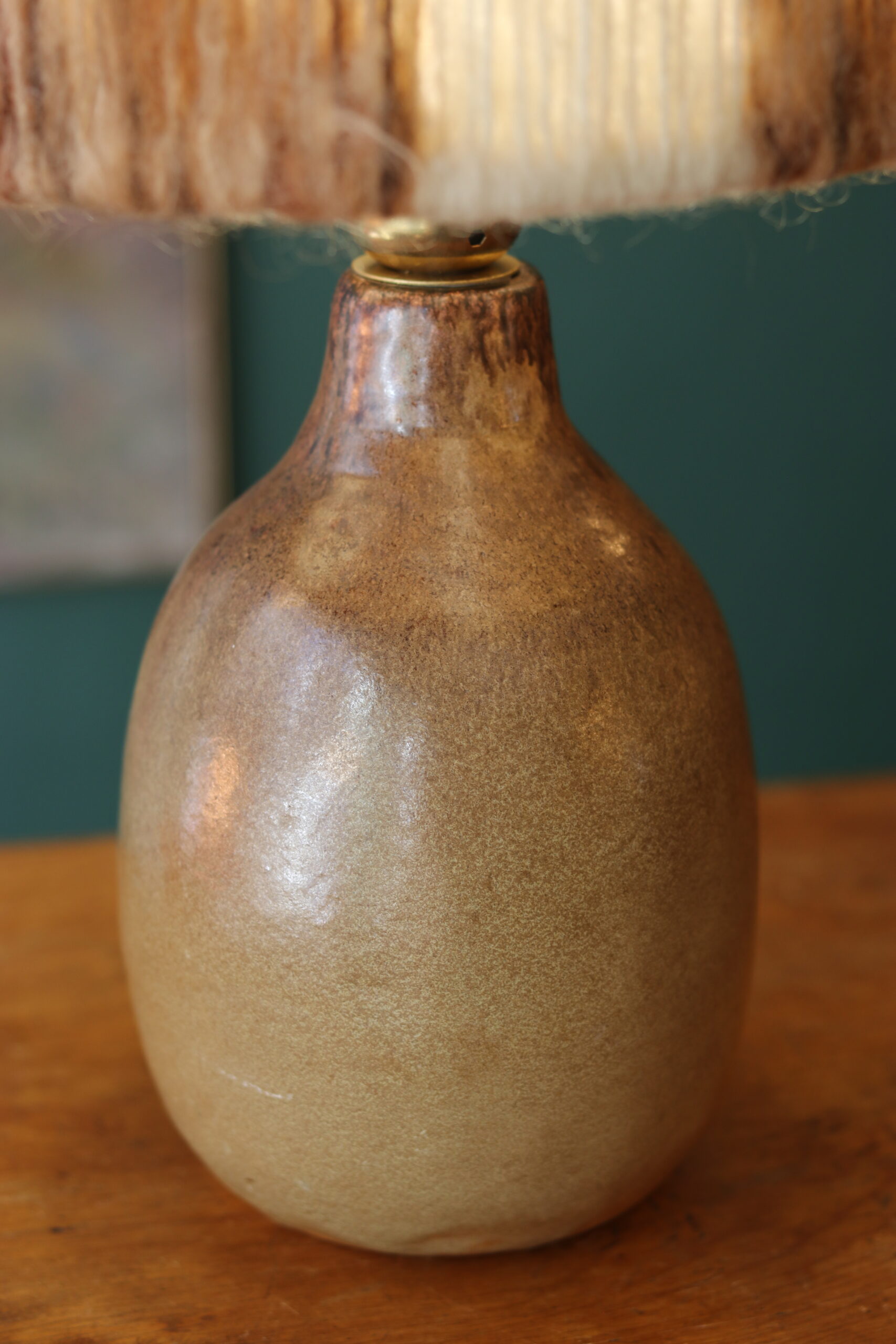 Elle est accompagnée d’un abat-jour en laine d’époque — non d’origine mais particulièrement harmonieux — dont les variations de tons bruns et crème diffusent une lumière douce et chaleureuse.