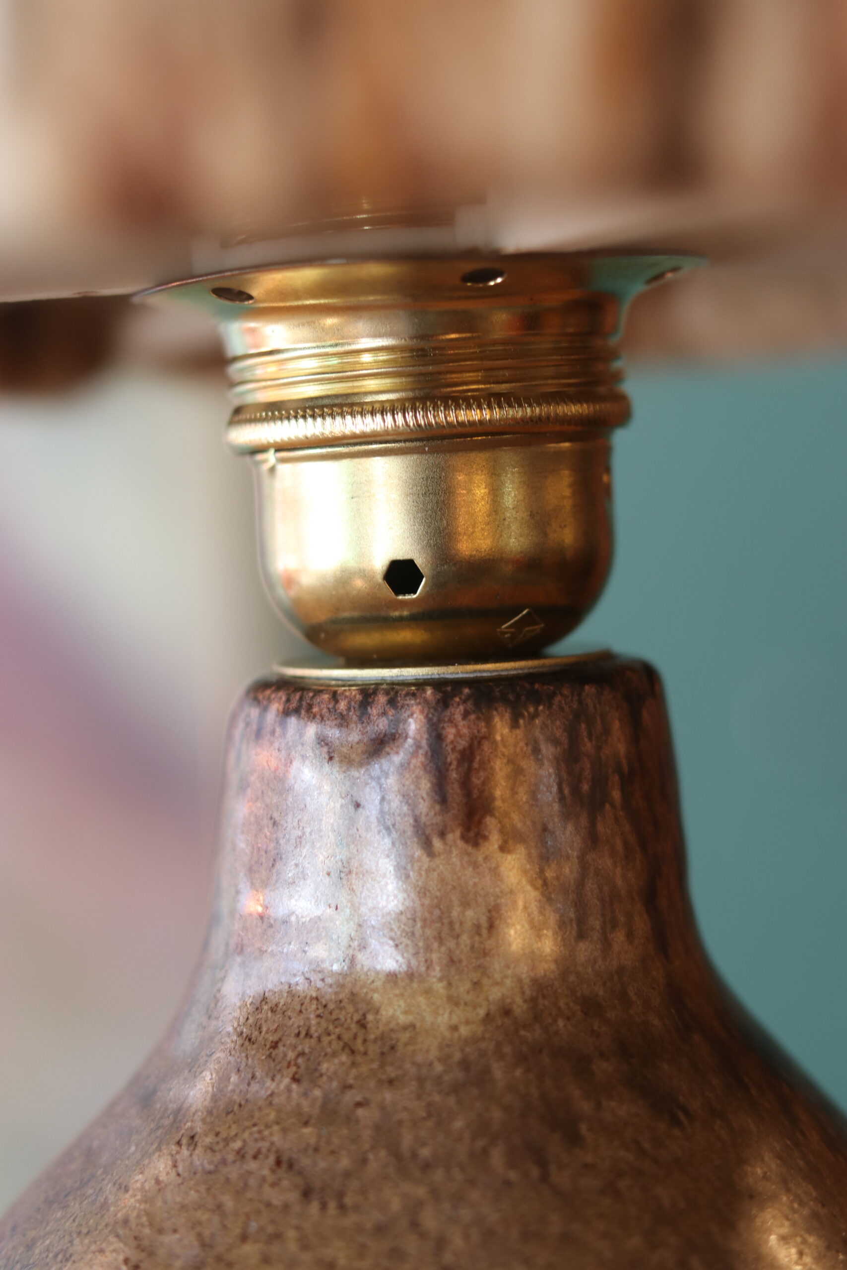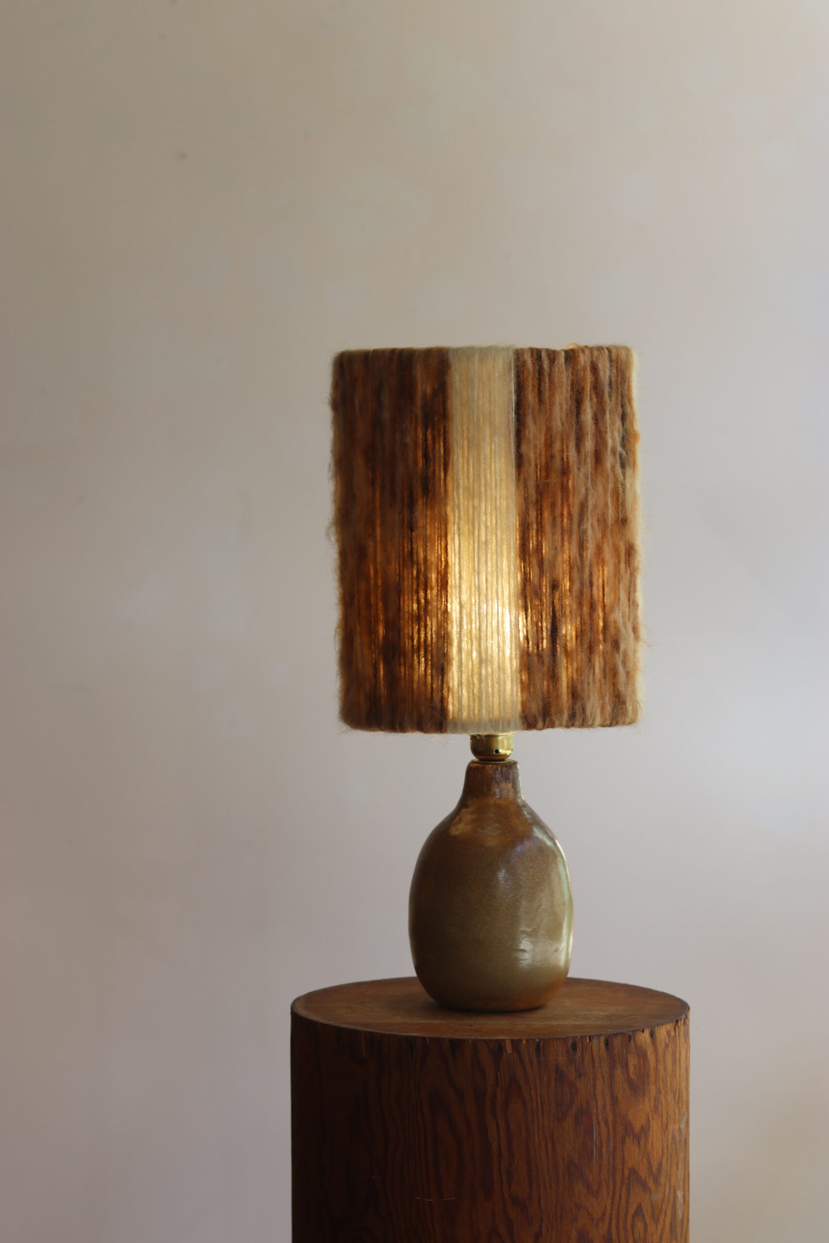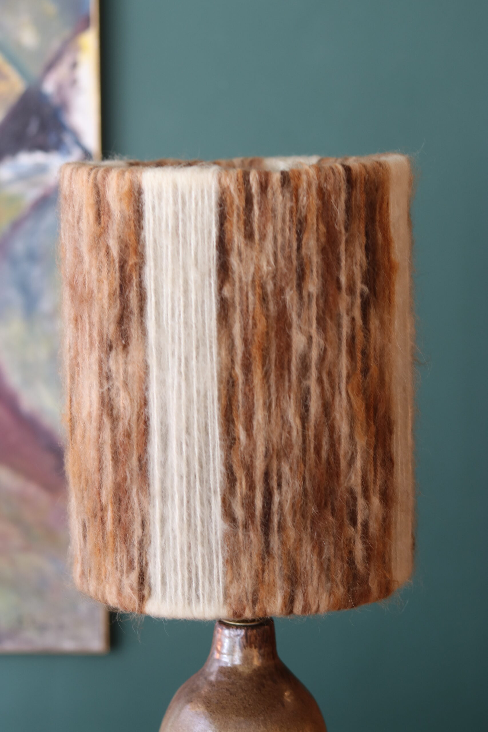 Elle est accompagnée d’un abat-jour en laine d’époque — non d’origine mais particulièrement harmonieux — dont les variations de tons bruns et crème diffusent une lumière douce et chaleureuse.