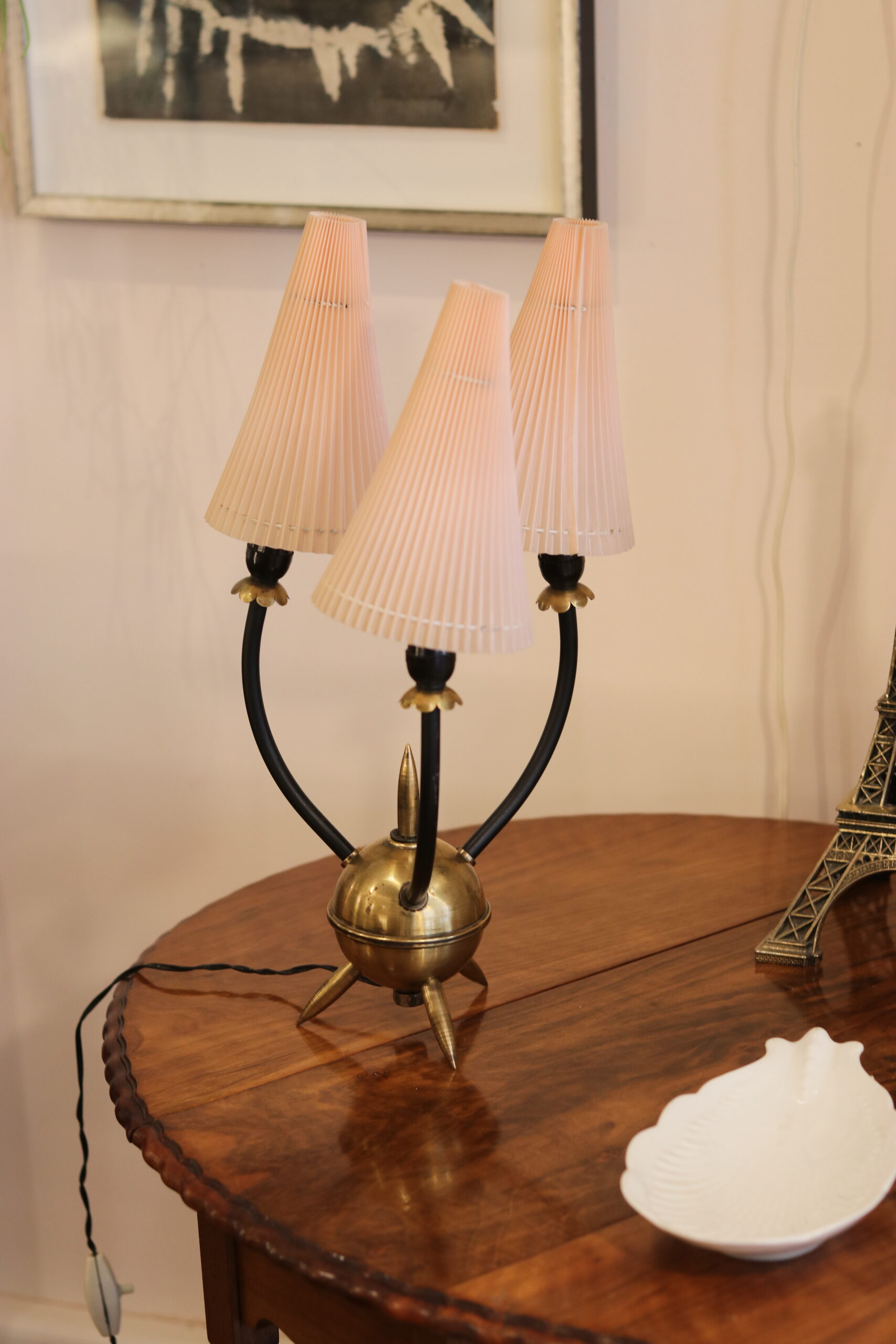 Lampe à poser du début des années 50 au design singulier et sculptural. Son piètement en forme de sphère en laiton est agrémenté de pointes, créant une base presque “spatiale”, typique de l’esthétique atomique d’après-guerre. De cette base émergent trois bras noirs galbés, chacun terminé par une douille ornée d’un délicat détail floral en laiton.