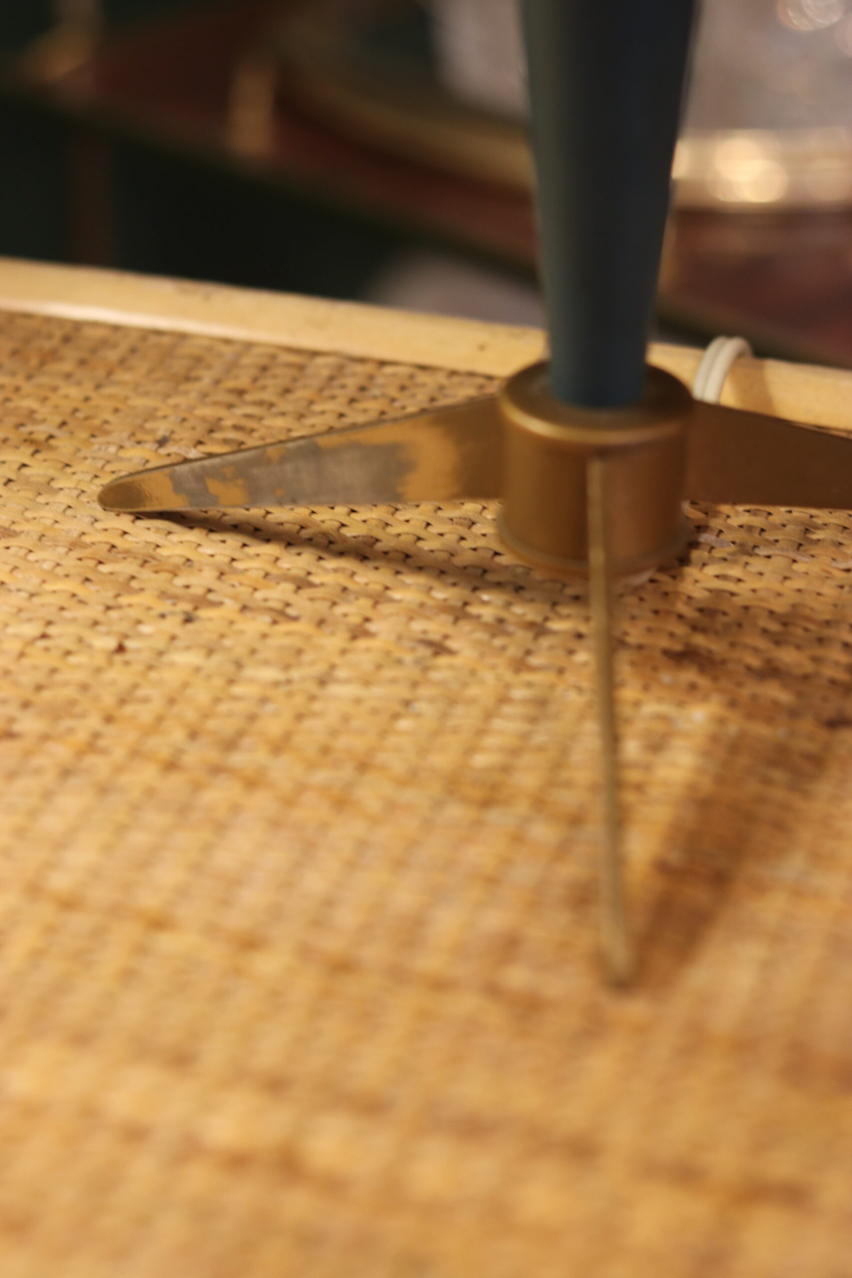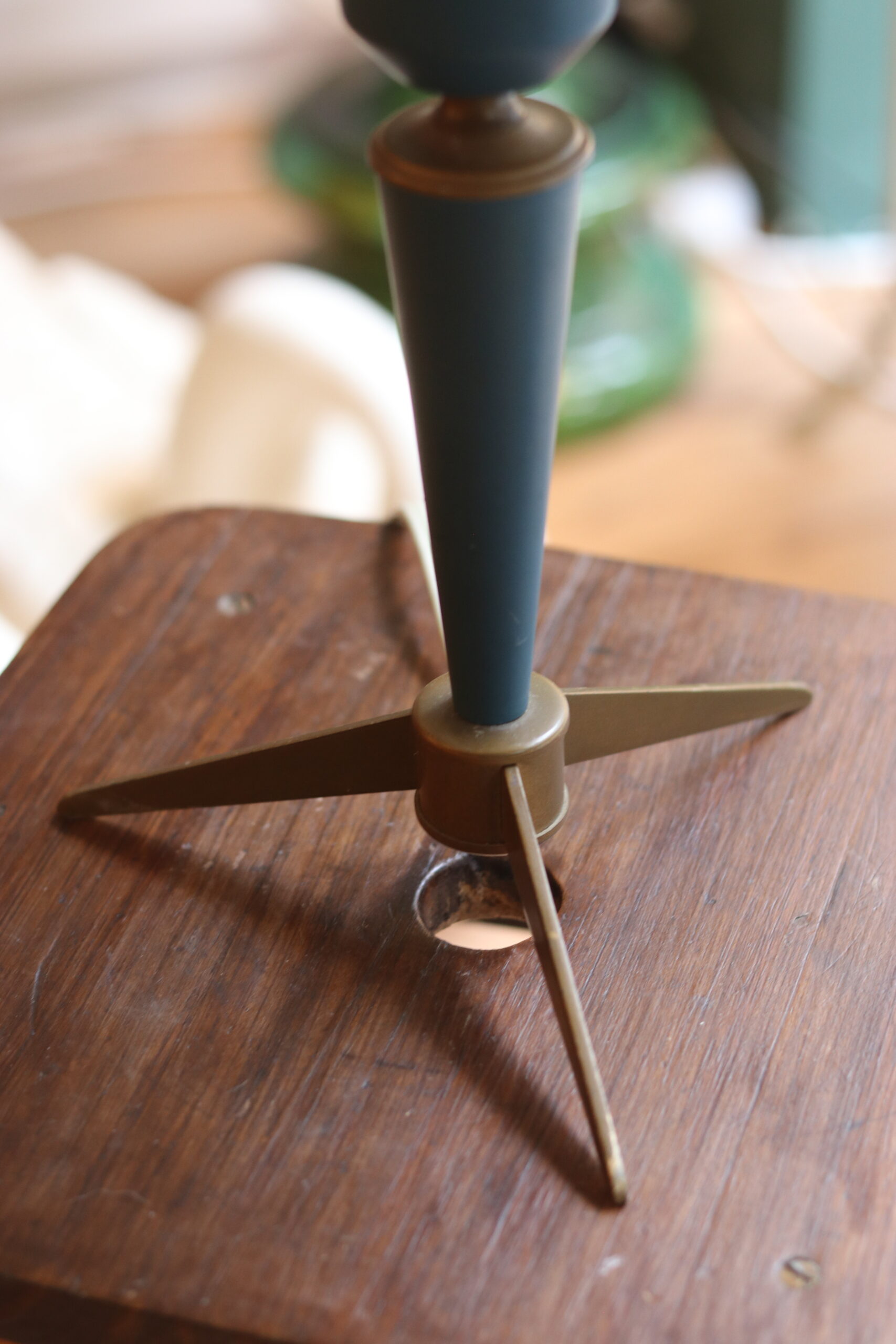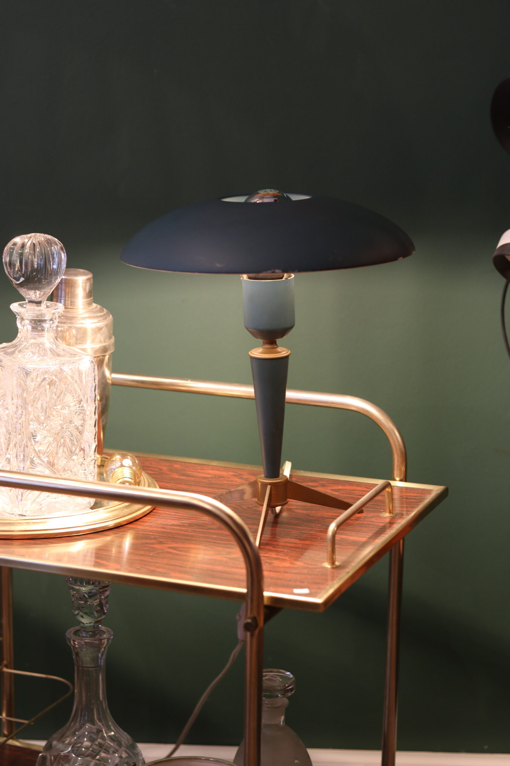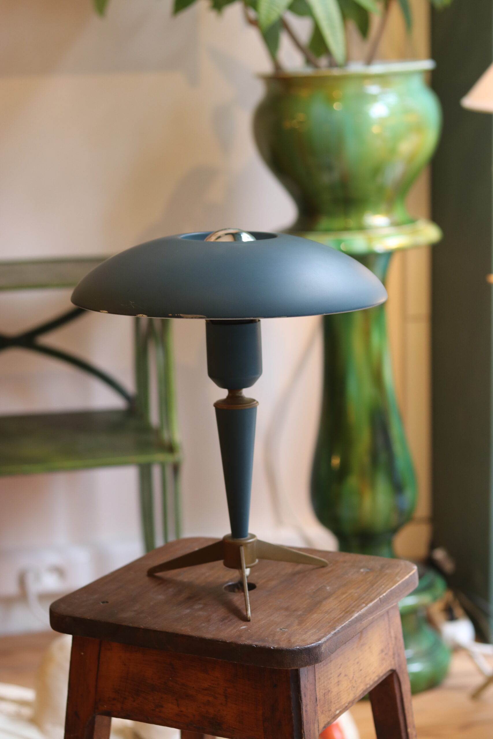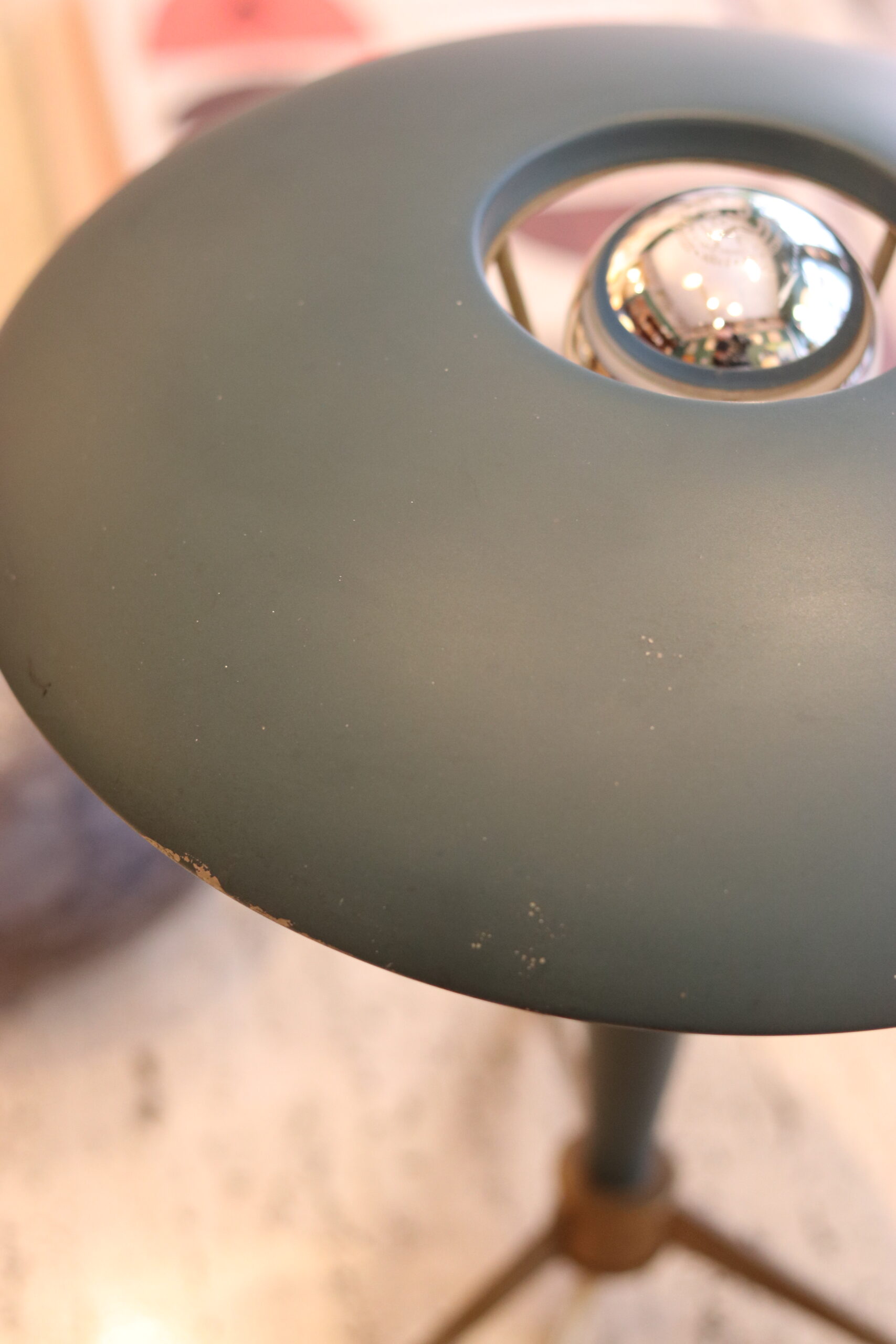 Ce modèle présente une coupole en métal laqué vert, ouverte au sommet pour laisser apparaître l’ampoule, créant un effet lumineux très caractéristique des créations de Kalff. Le fût conique repose sur une base tripode en métal doré, légère et élégante, soulignant l’esthétique moderniste de la lampe.