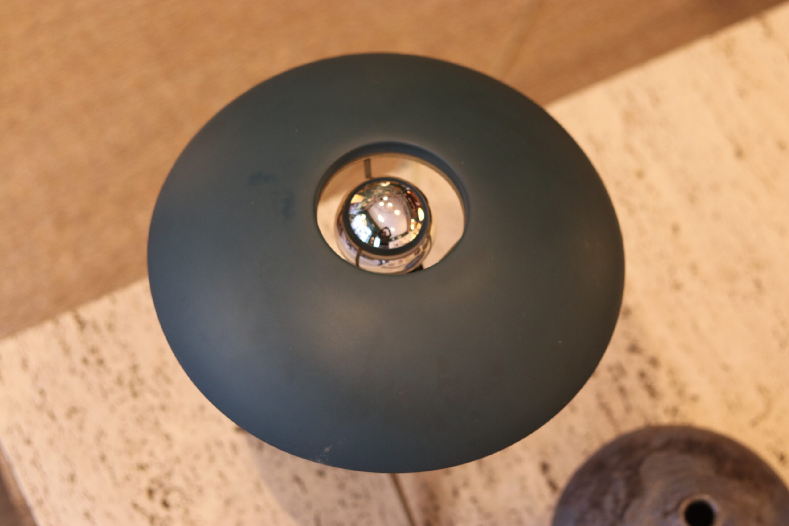 La pièce est en très bon état de conservation, avec quelques traces d’usage : un léger frottement sur l’intérieur d’un pied et un petit manque de peinture sur le rebord de la coupole, sans incidence sur sa stabilité ni son charme. L’électricité fonctionne parfaitement : interrupteur d’origine conservé, fiche et câble remplacés pour plus de sécurité.