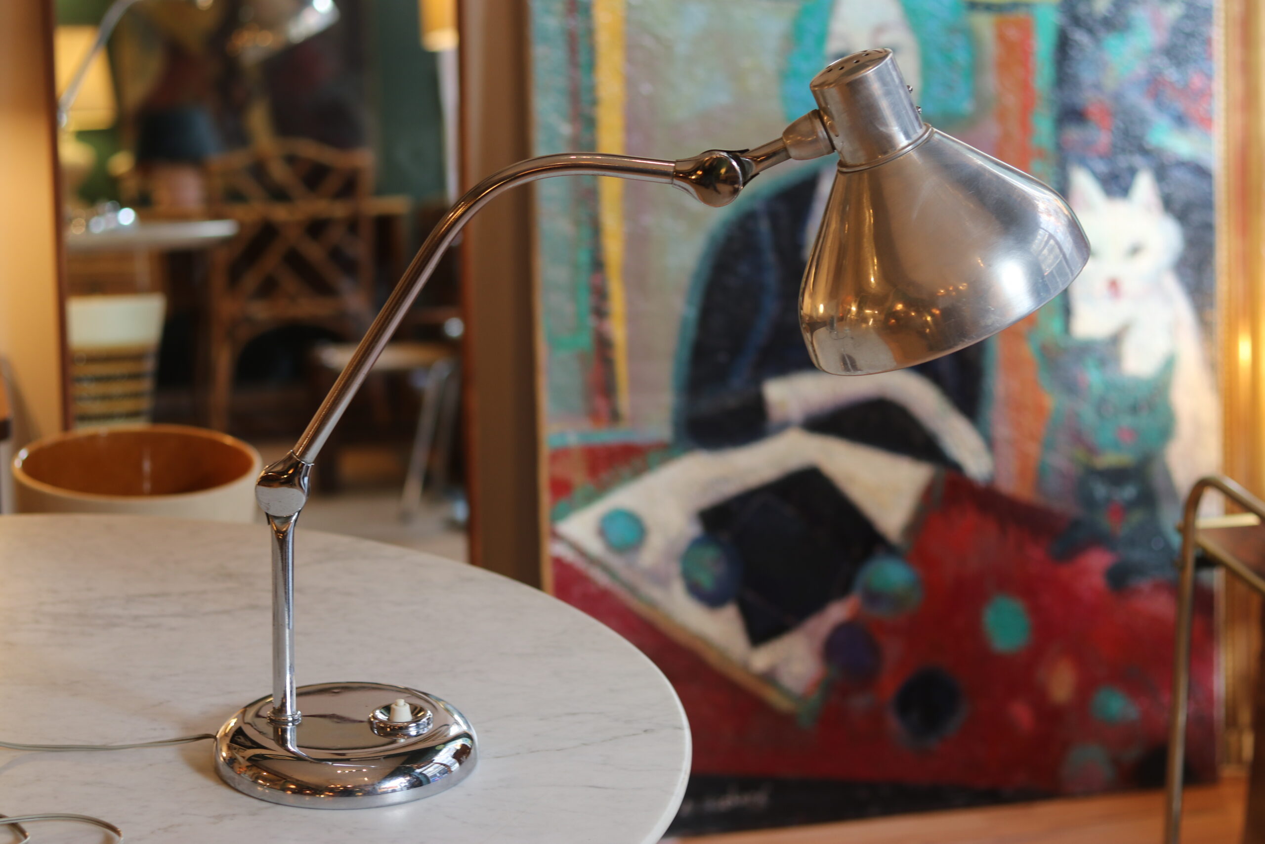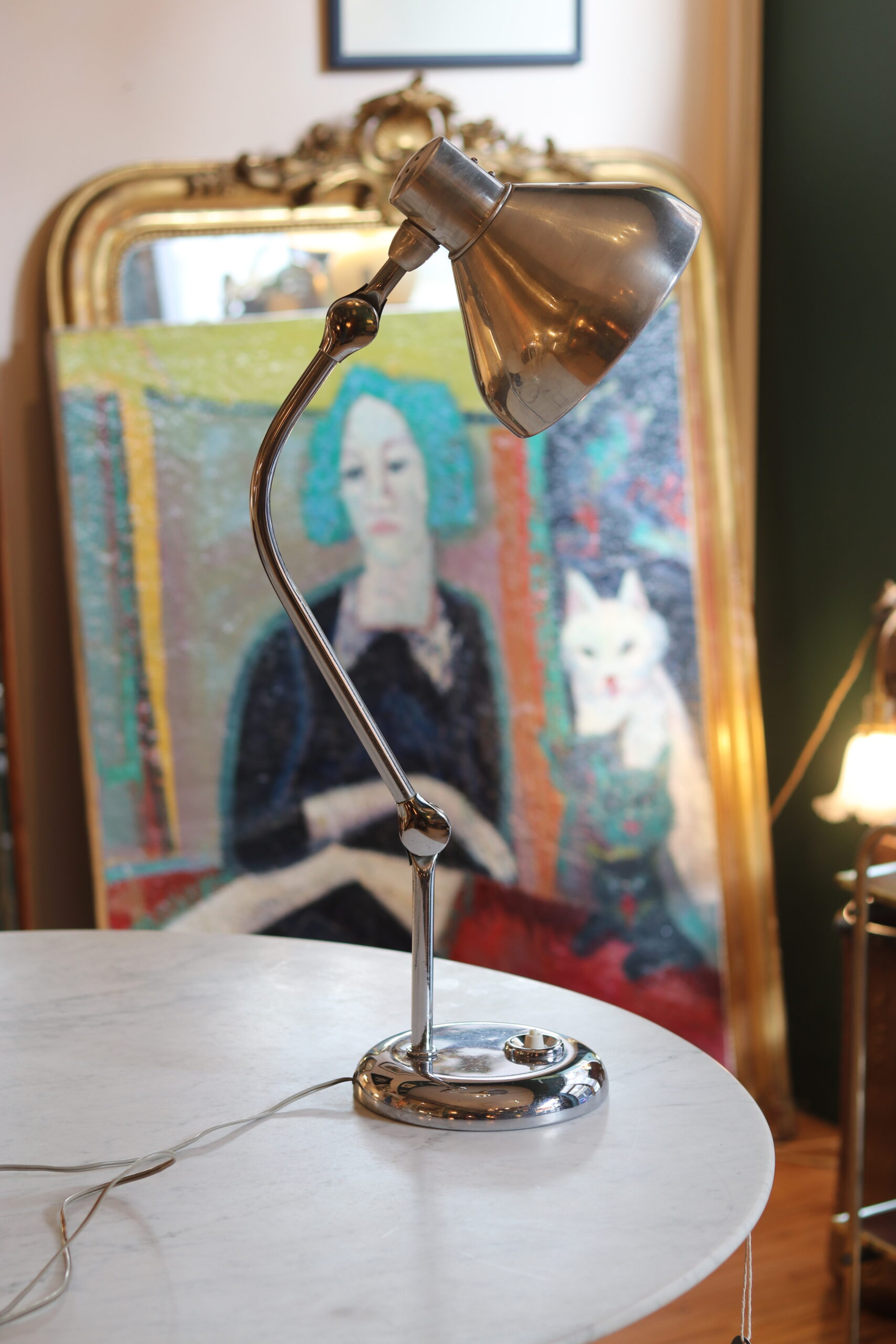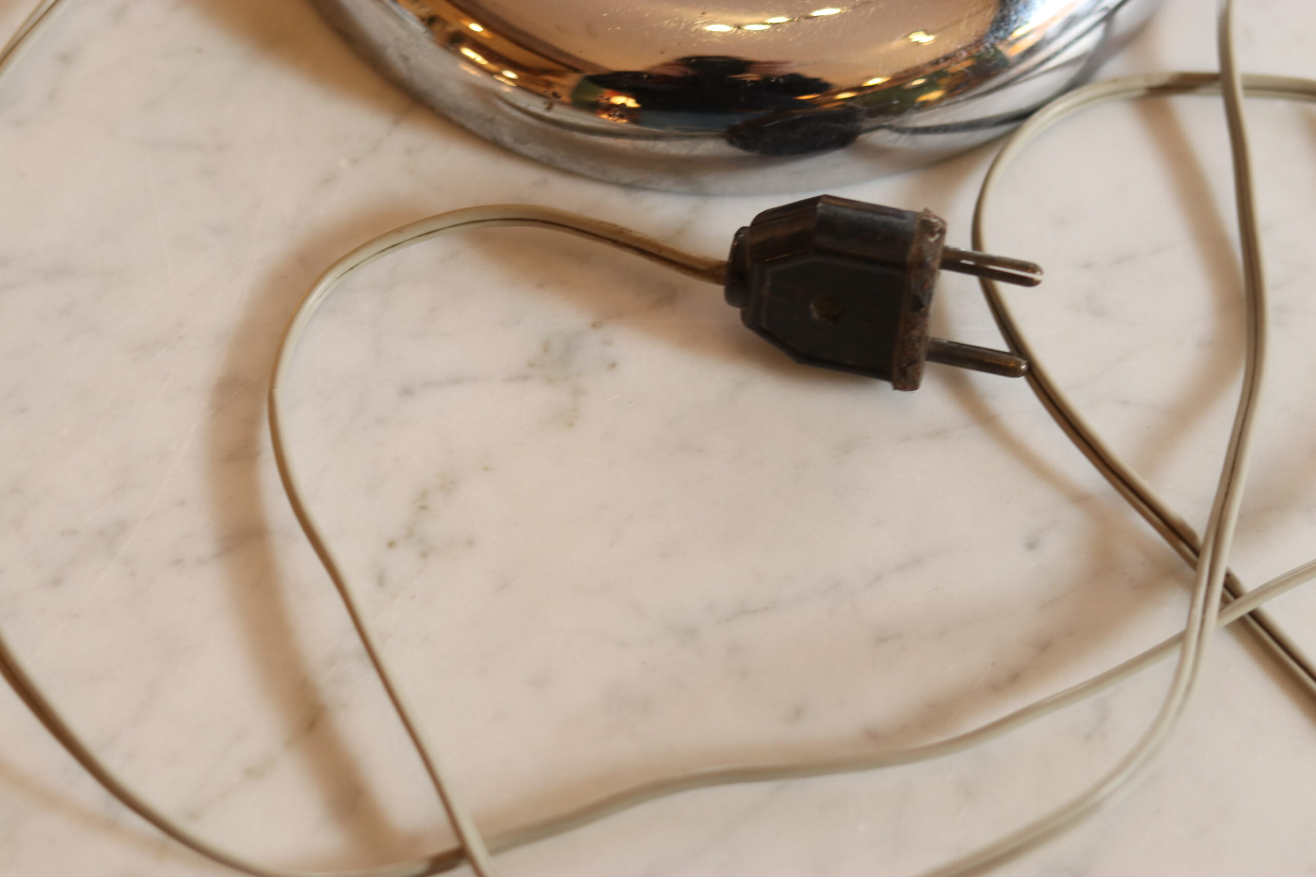 Structure en métal chromé, bras articulé et réflecteur orientable. Très bel état, électricité fonctionnelle.