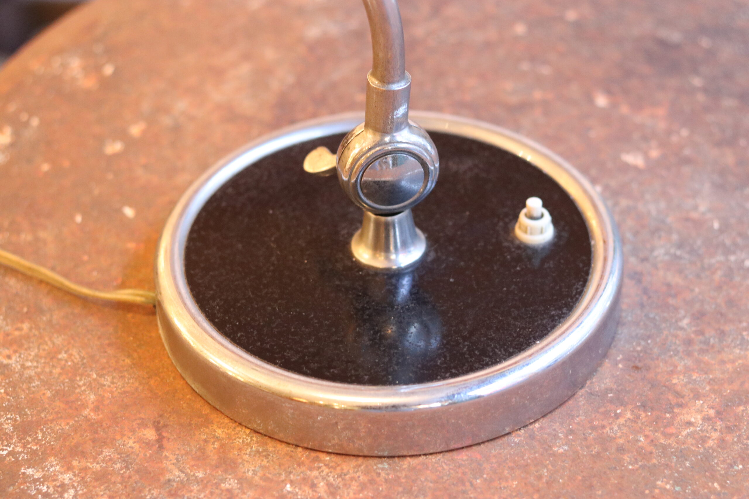 Elle se compose d’un piètement rond en métal laqué noir, d’un bras chromé élégamment incurvé et d’une pièce centrale en bakélite, typique des créations de Dell. L’abat-jour bombé — signe distinctif du modèle 6631 — est orientable, tout comme la rotule articulée au pied, permettant un éclairage parfaitement modulable.