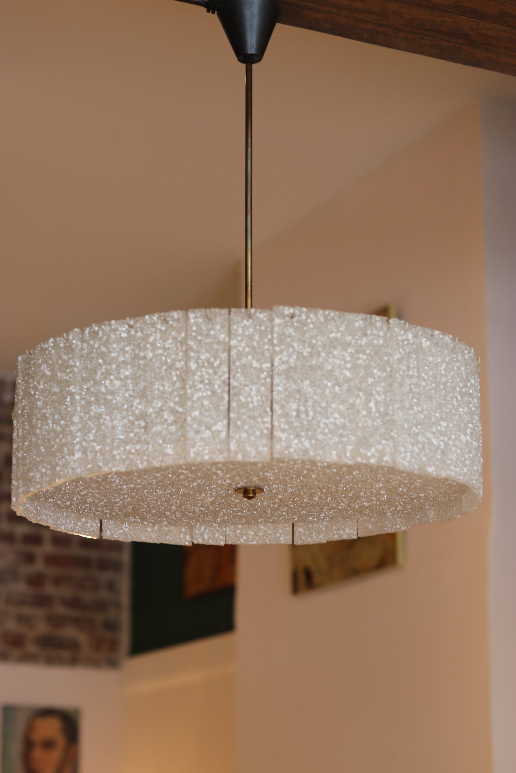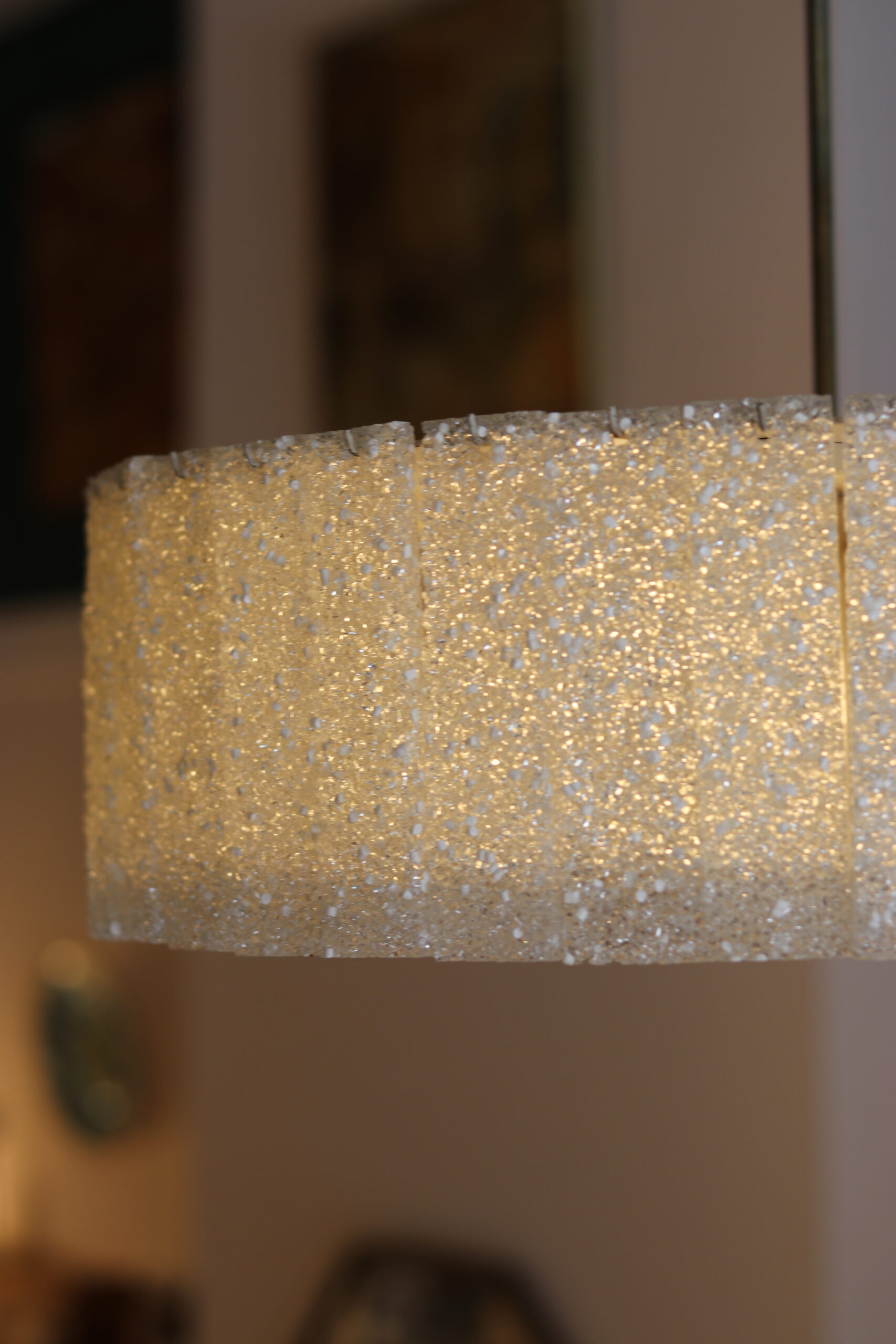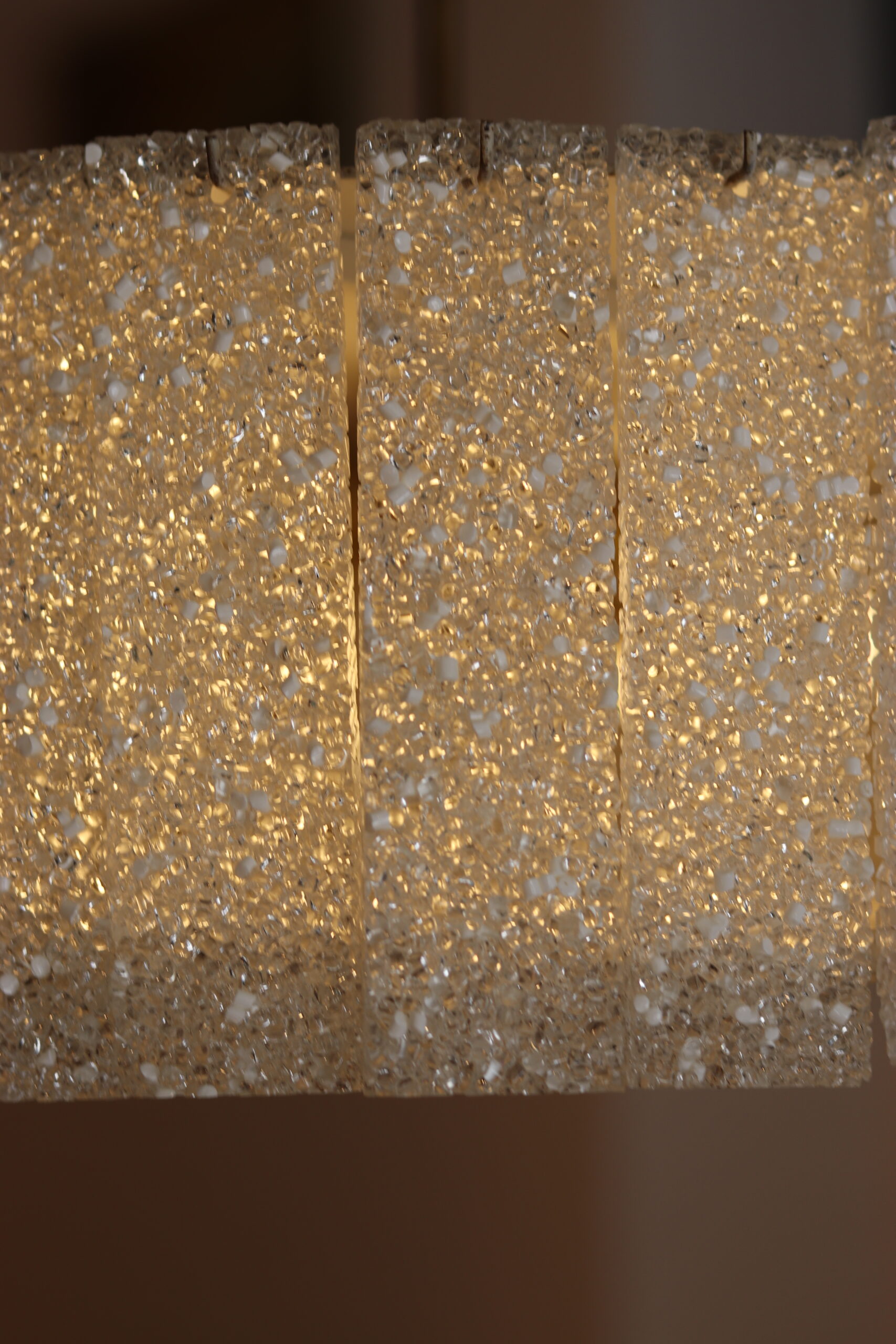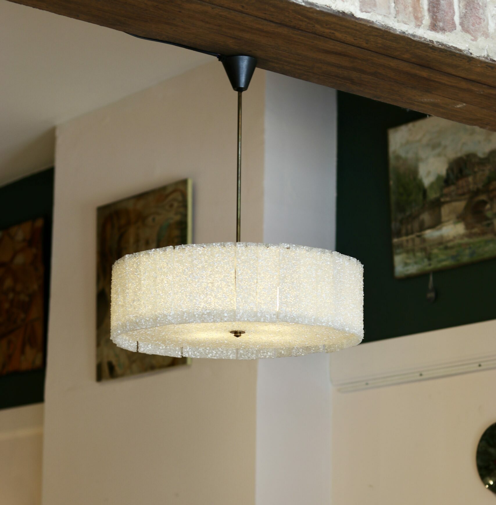 Lustre des années 1950 en perspex, matériau emblématique de l’après-guerre, ici travaillé sous forme de plaquettes texturées créant un effet granité proche du cristal ou du verre pilé. Cette matière capte et diffuse la lumière de manière chaleureuse, avec un rendu presque scintillant une fois allumé.