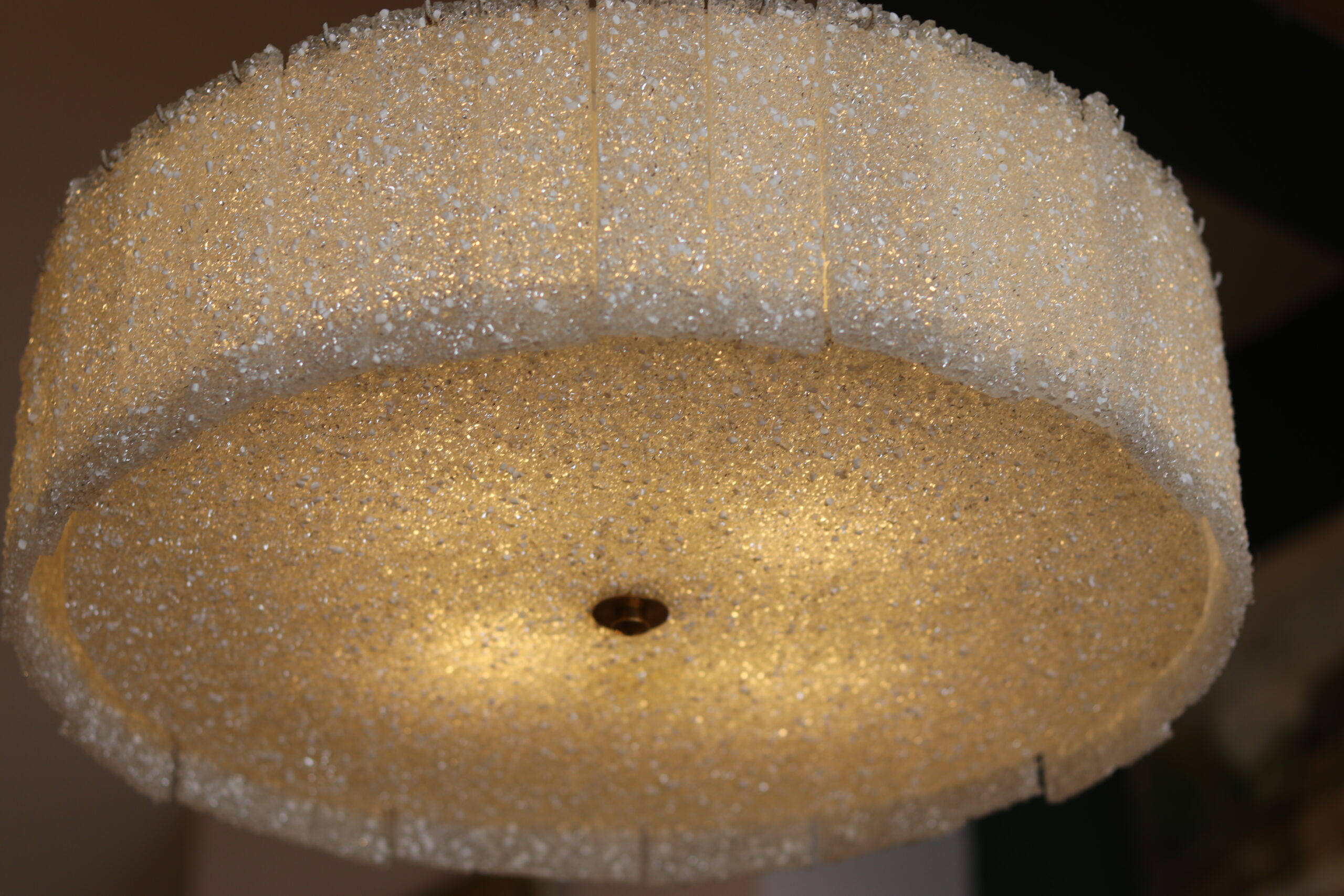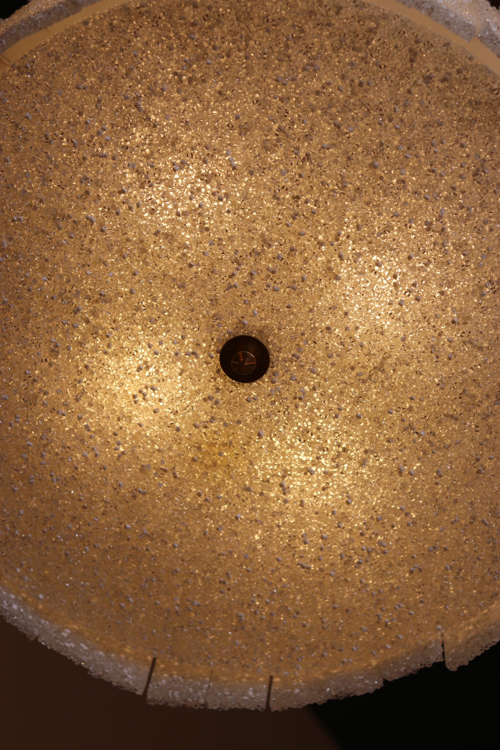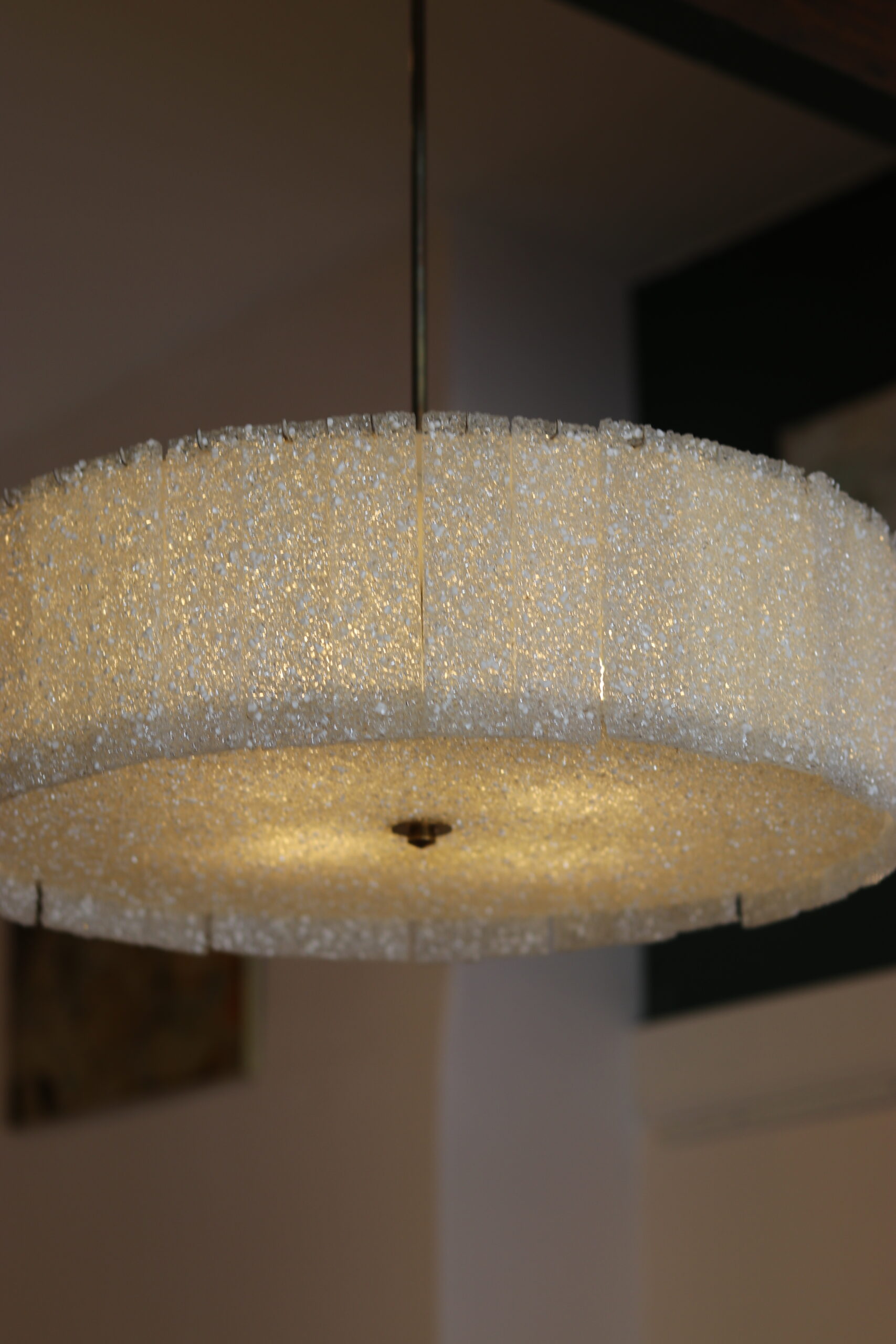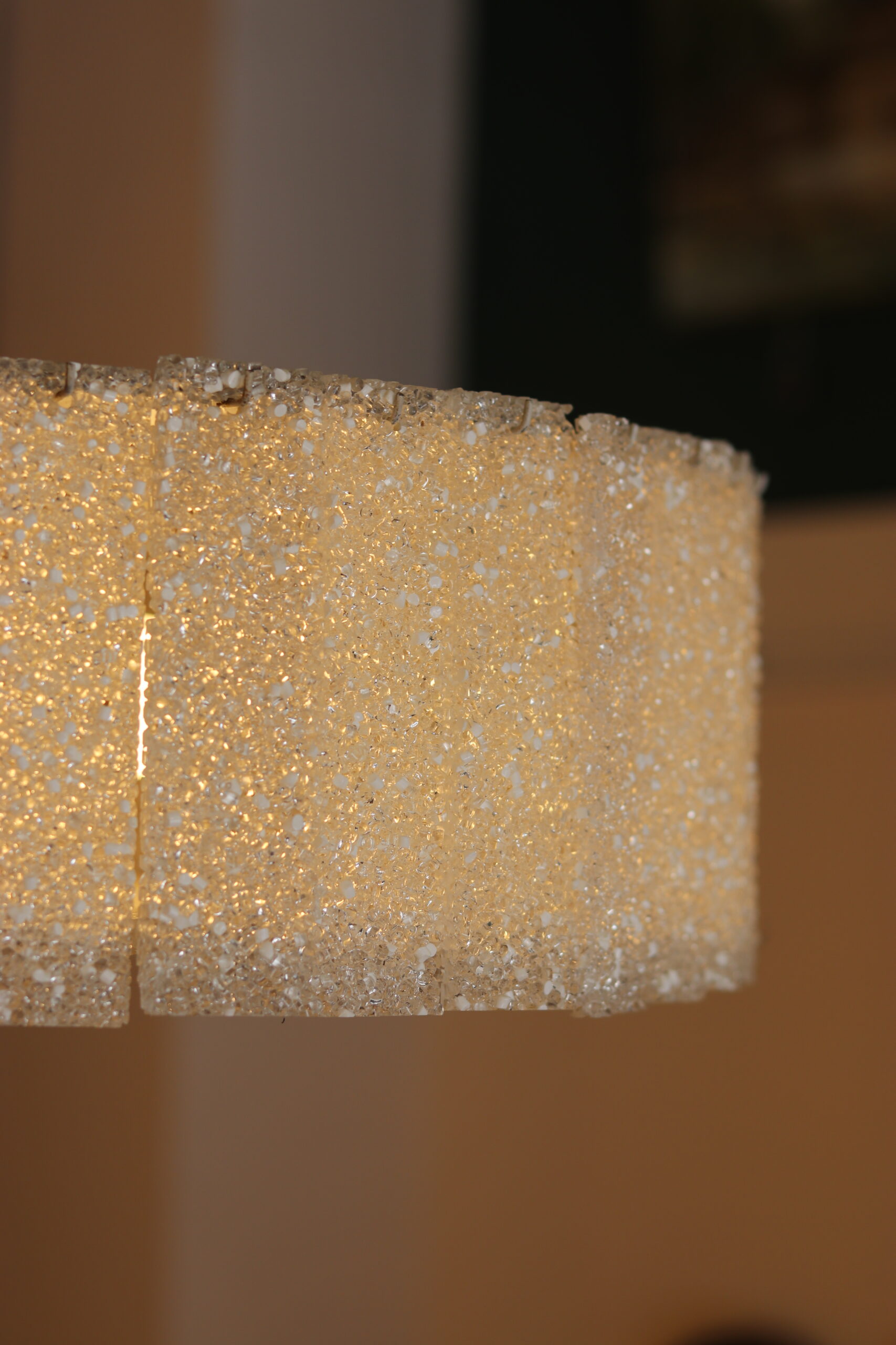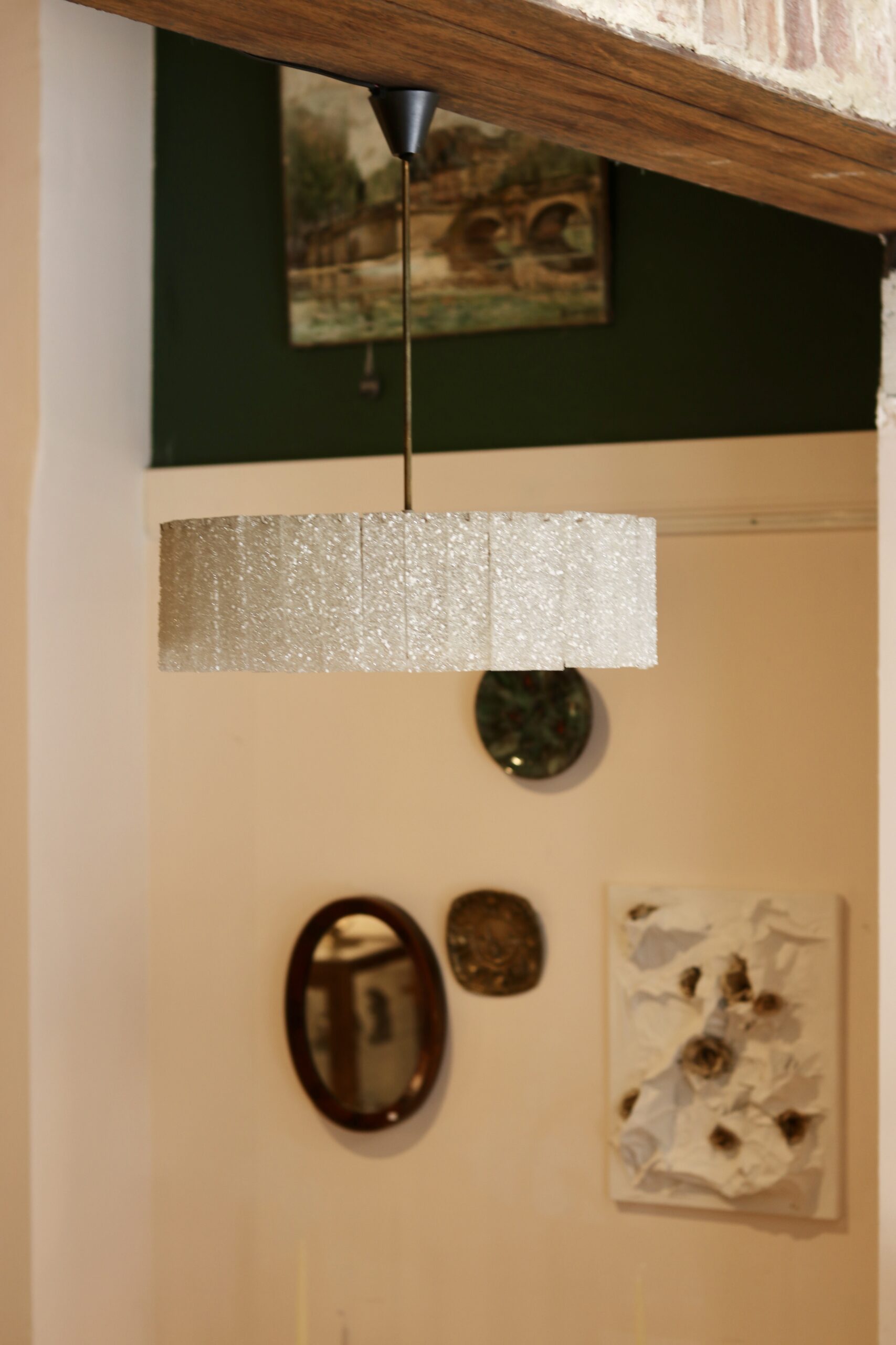 Lustre des années 1950 en perspex, matériau emblématique de l’après-guerre, ici travaillé sous forme de plaquettes texturées créant un effet granité proche du cristal ou du verre pilé. Cette matière capte et diffuse la lumière de manière chaleureuse, avec un rendu presque scintillant une fois allumé.