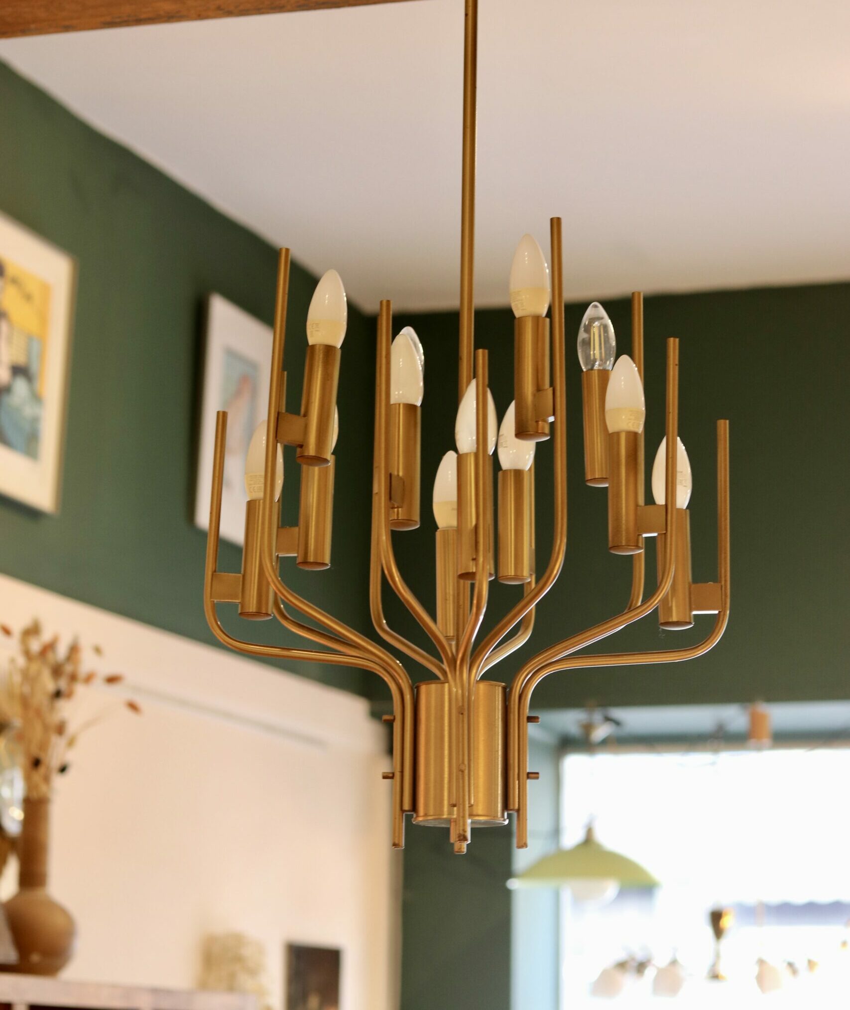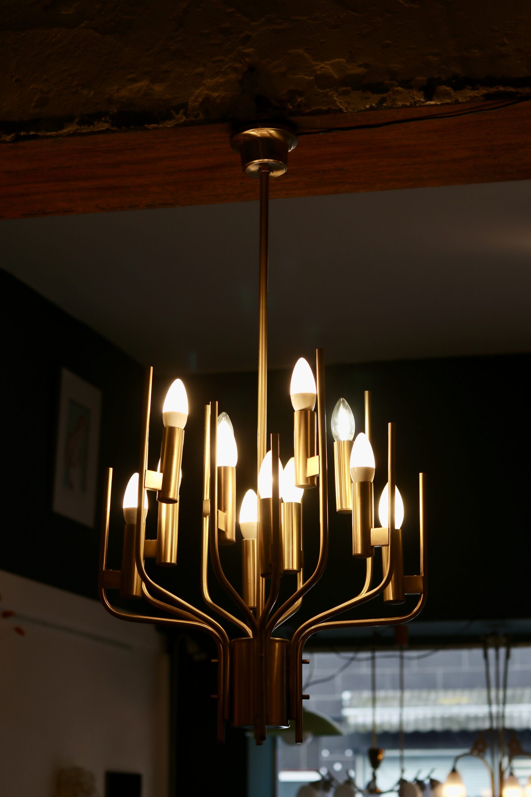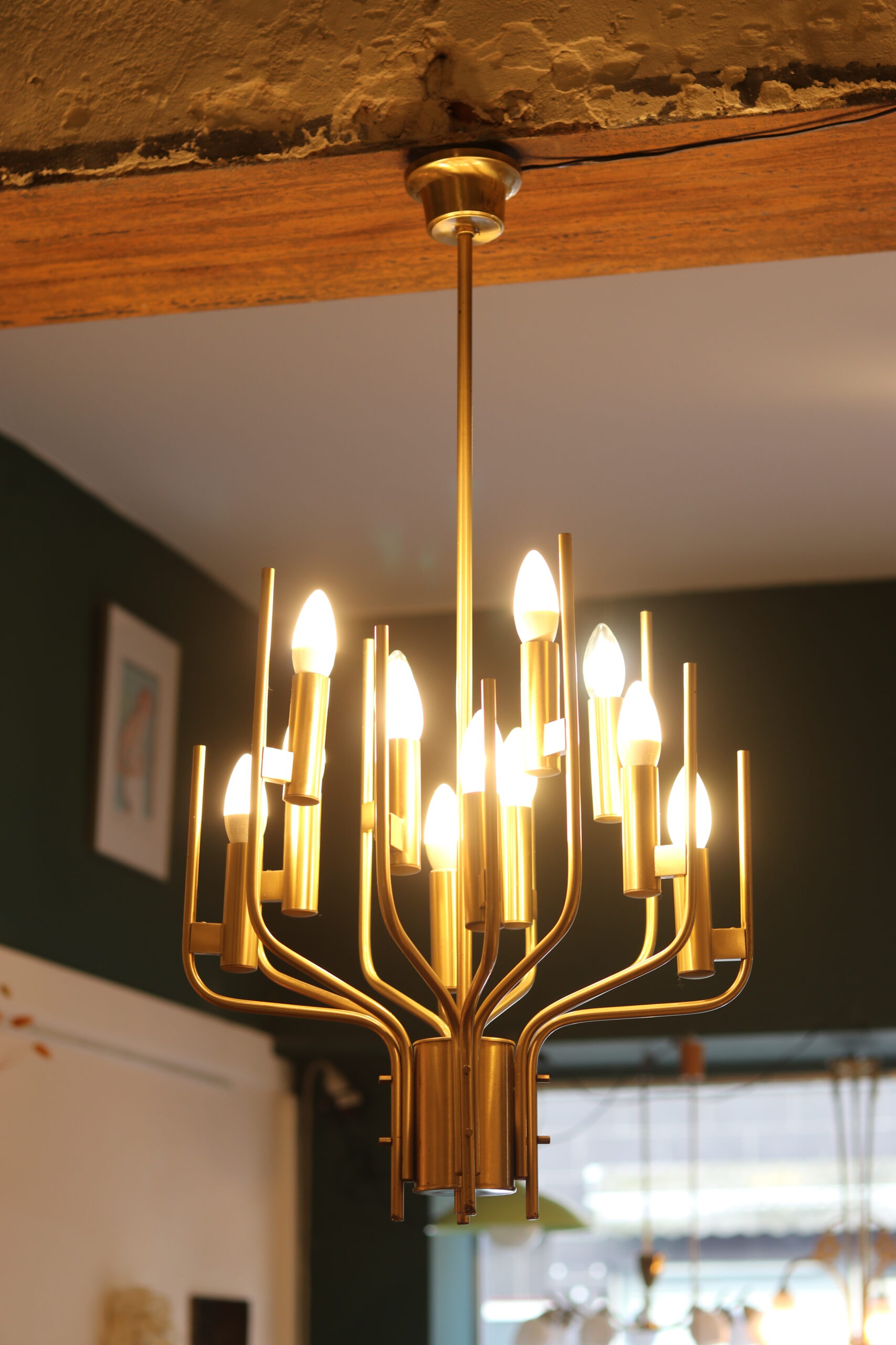 Ce lustre italien signé Gaetano Scolari incarne toute l’élégance du design des années 1970. Réalisé en laiton, il déploie une structure graphique et aérienne composée de douze bras lumineux.