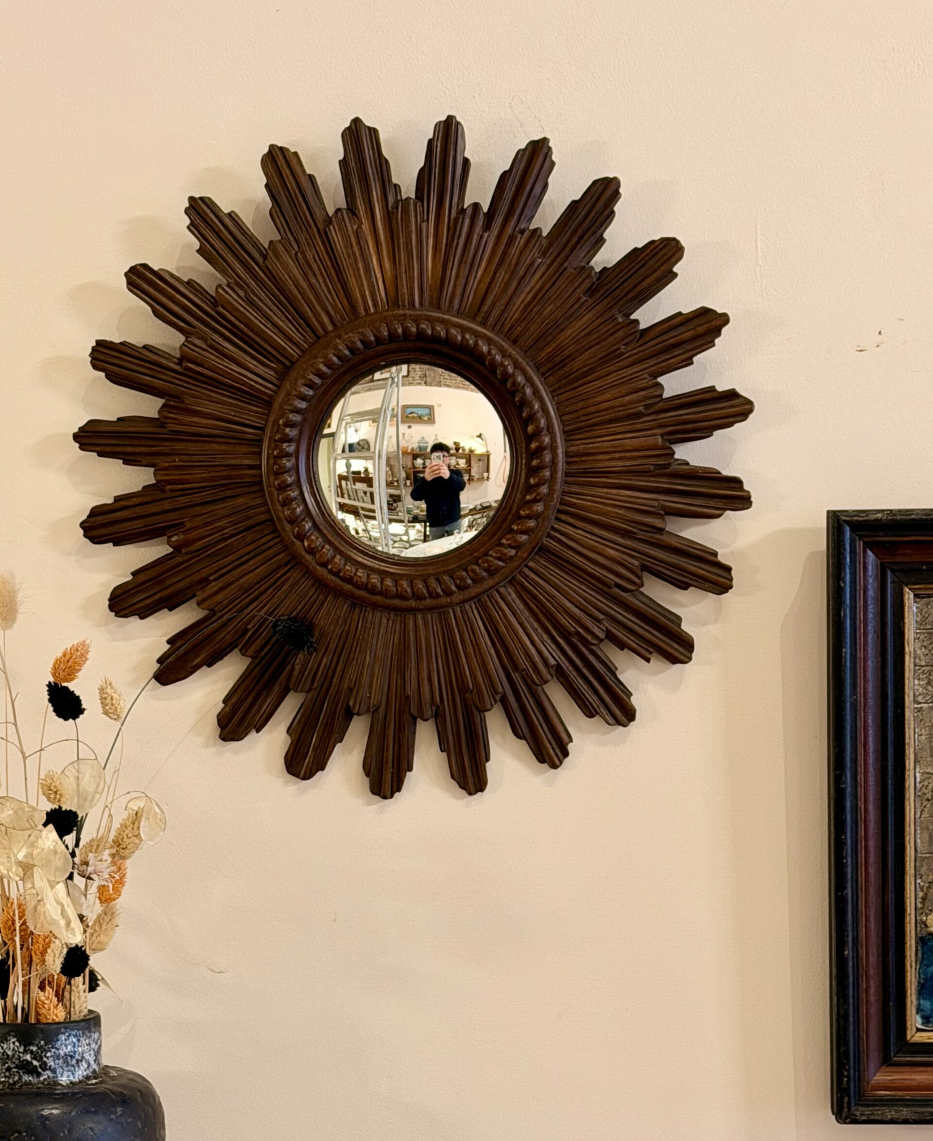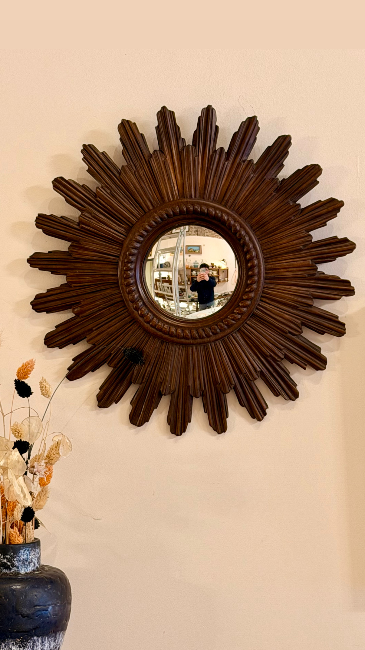 Miroir soleil vintage en résine imitant le bois sculpté, datant probablement des années 1960-70, caractérisé par son décor rayonnant en relief et sa belle patine chaleureuse.