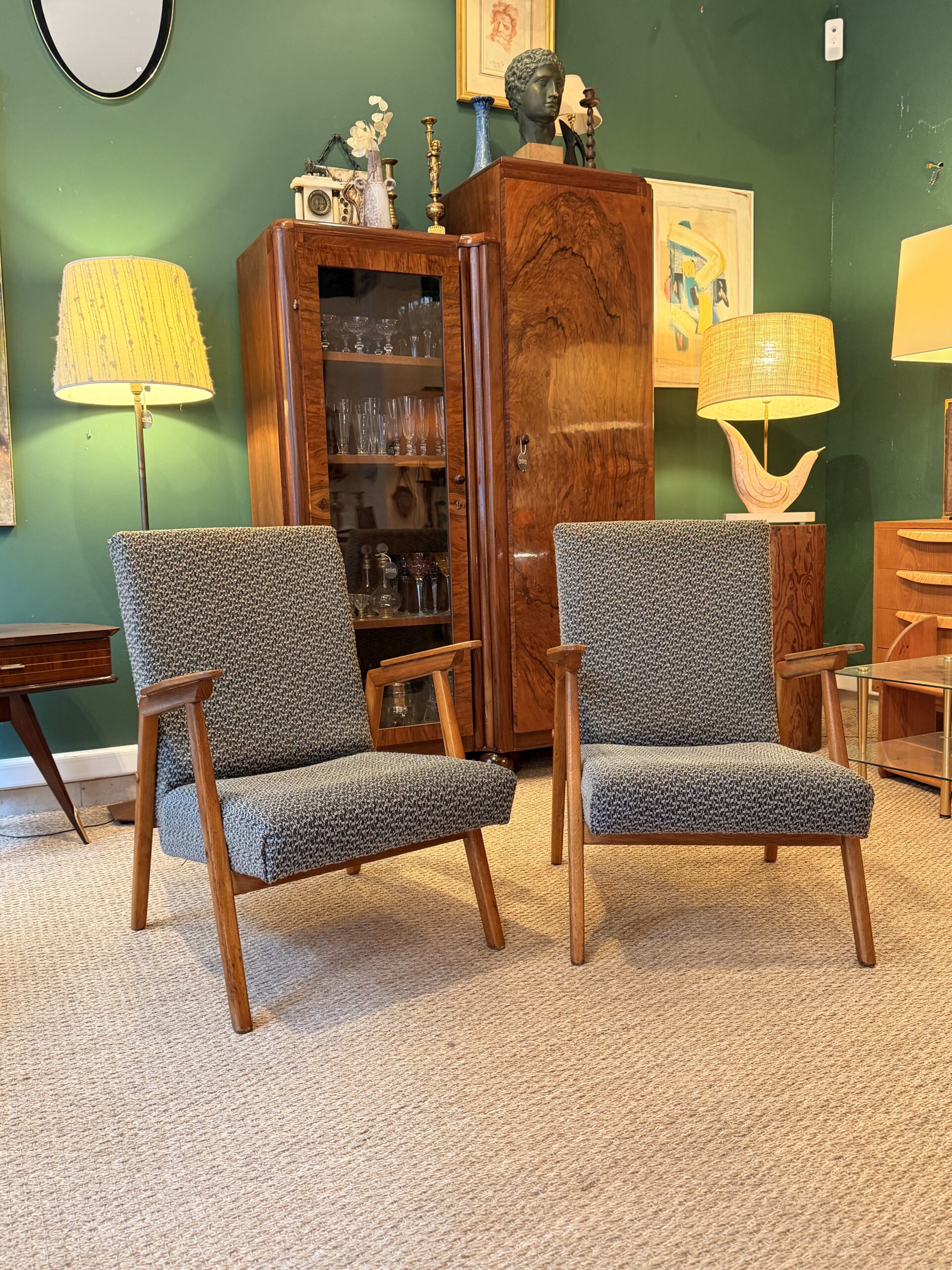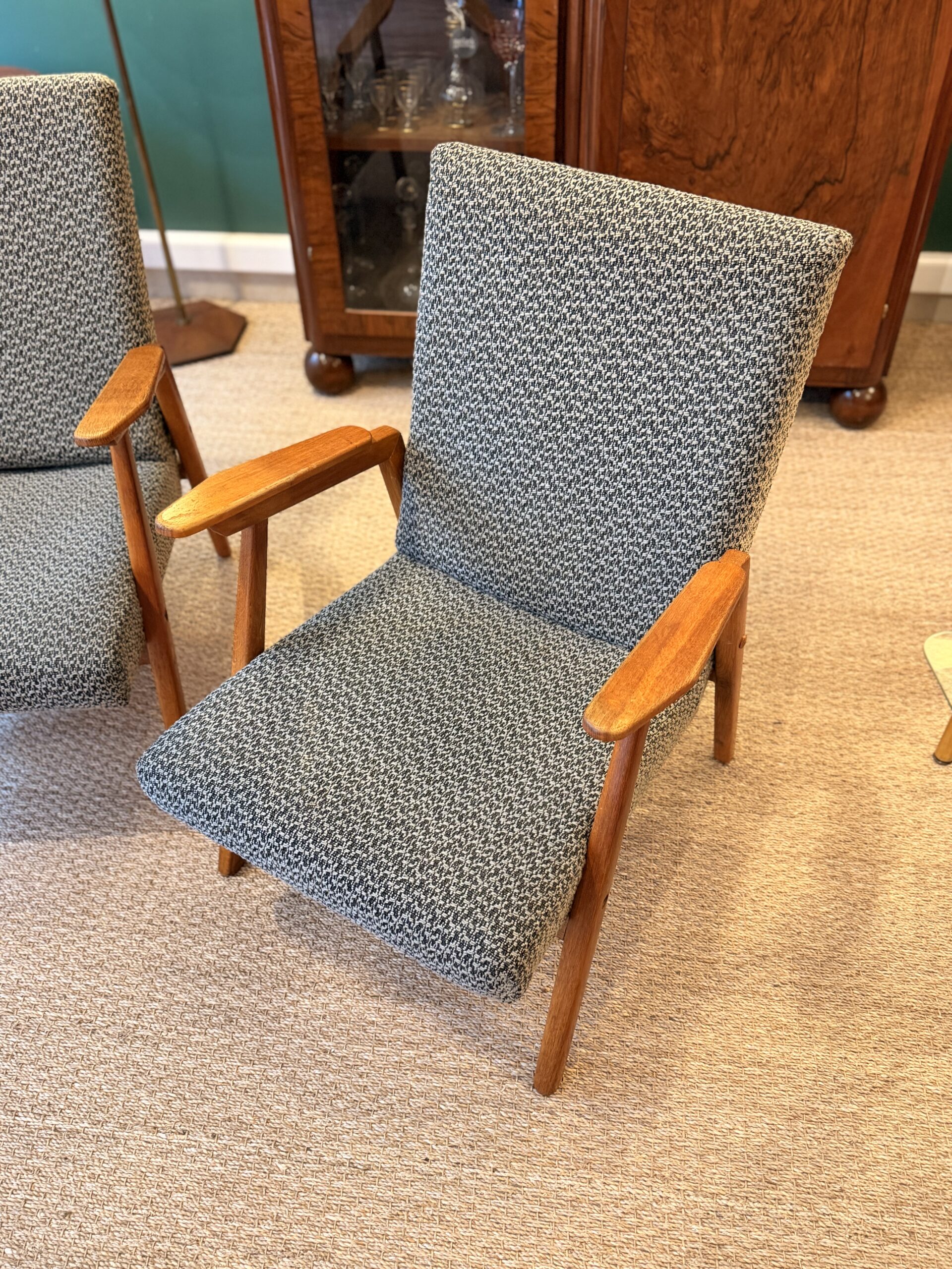 Paire de petits fauteuils vintage à structure en chêne massif, dotés d’une assise et d’un tissu d’origine. Leur ligne est élégante et équilibrée, avec de jolis accoudoirs anguleux qui apportent une vraie personnalité à l’ensemble.