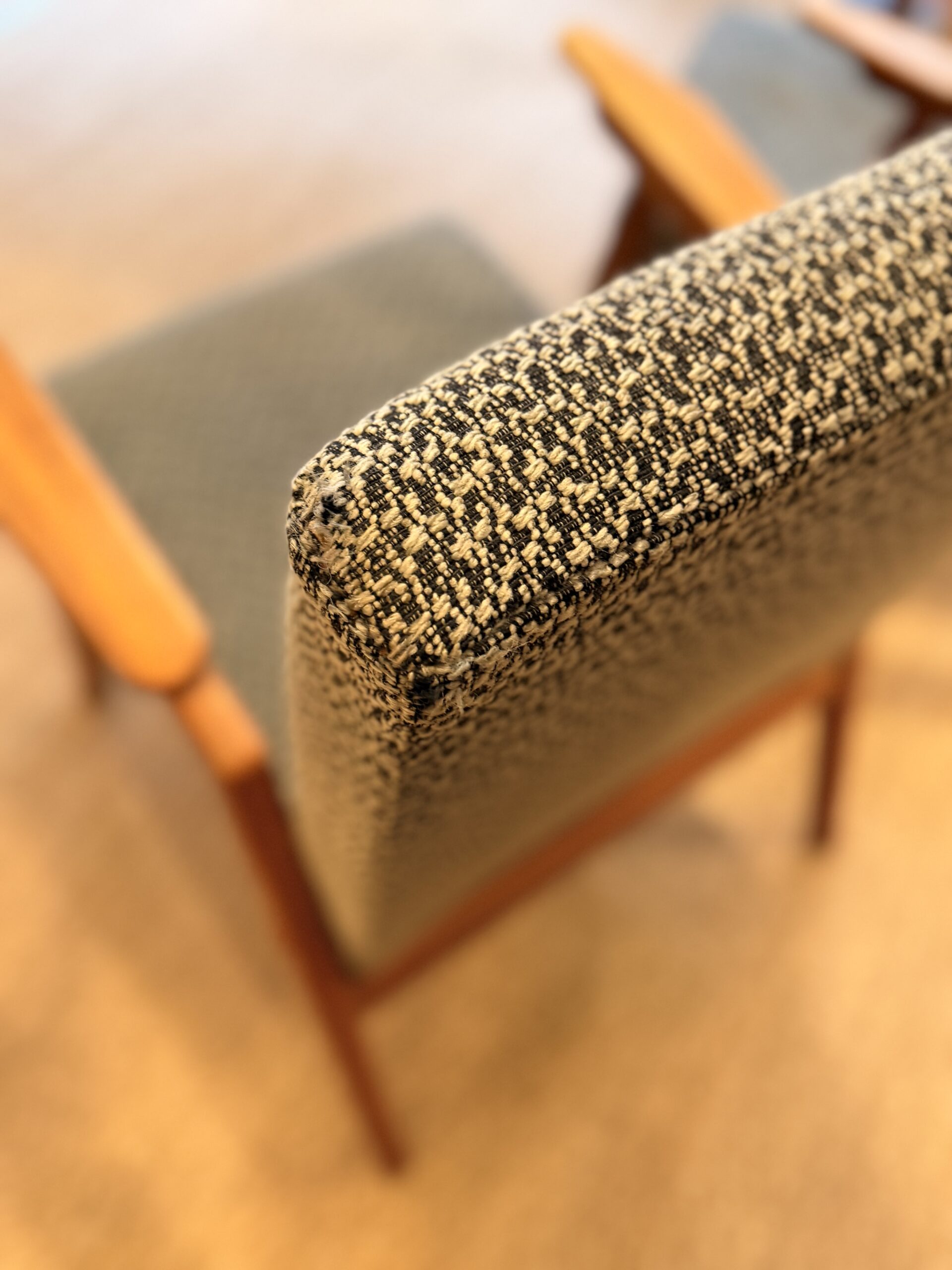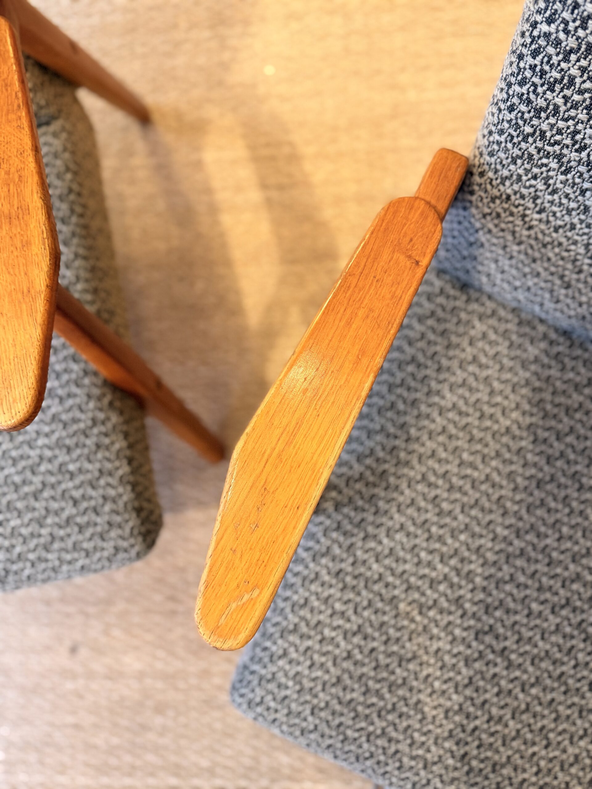 Le tissu d’origine est en bon état général, bien que l’on observe quelques faiblesses sur le haut du dossier. La structure présente une patine naturelle avec de légers manques de vernis et l’absence de certains caches-vis — des détails qui témoignent de leur authenticité et participent à leur charme.