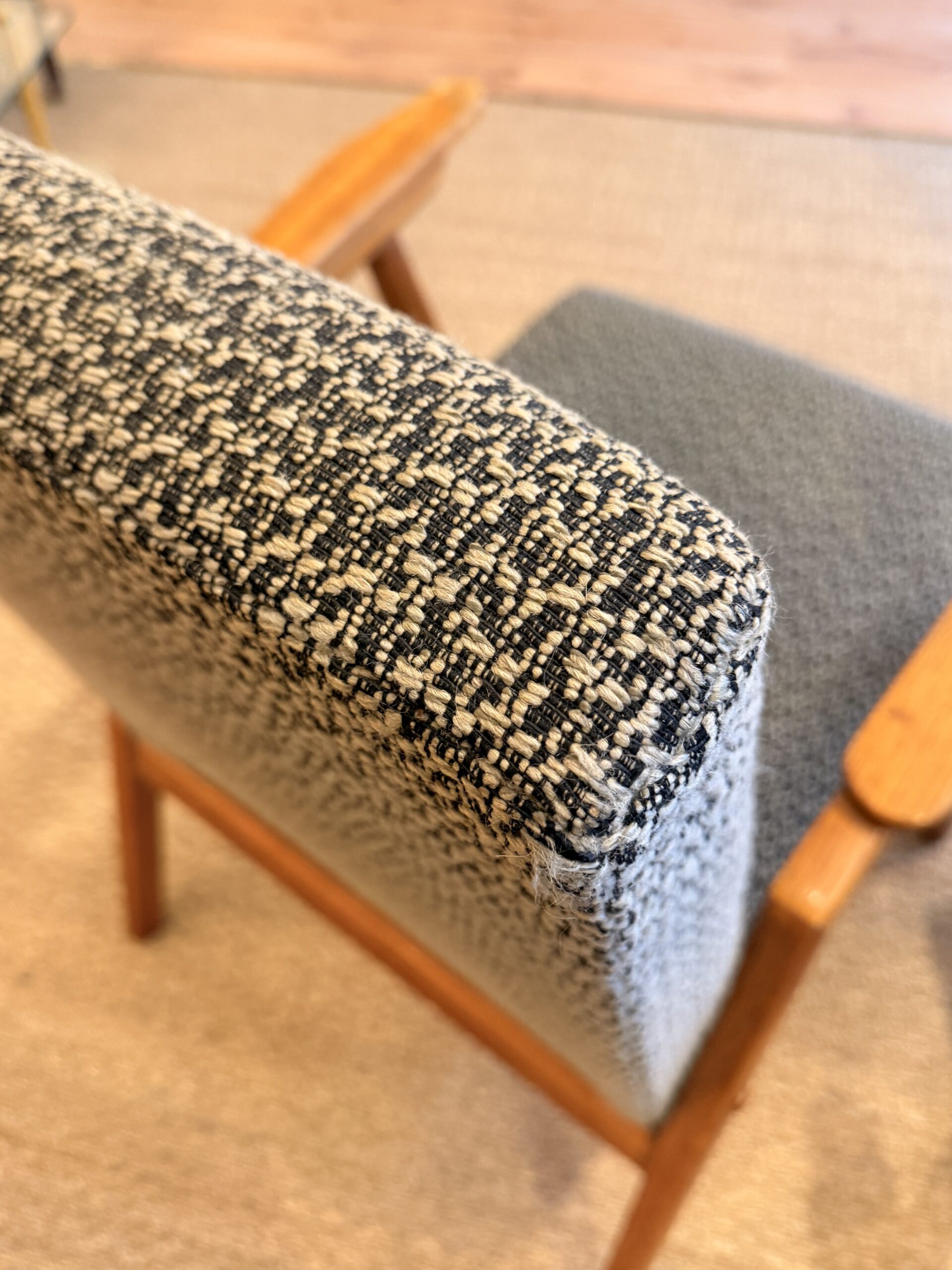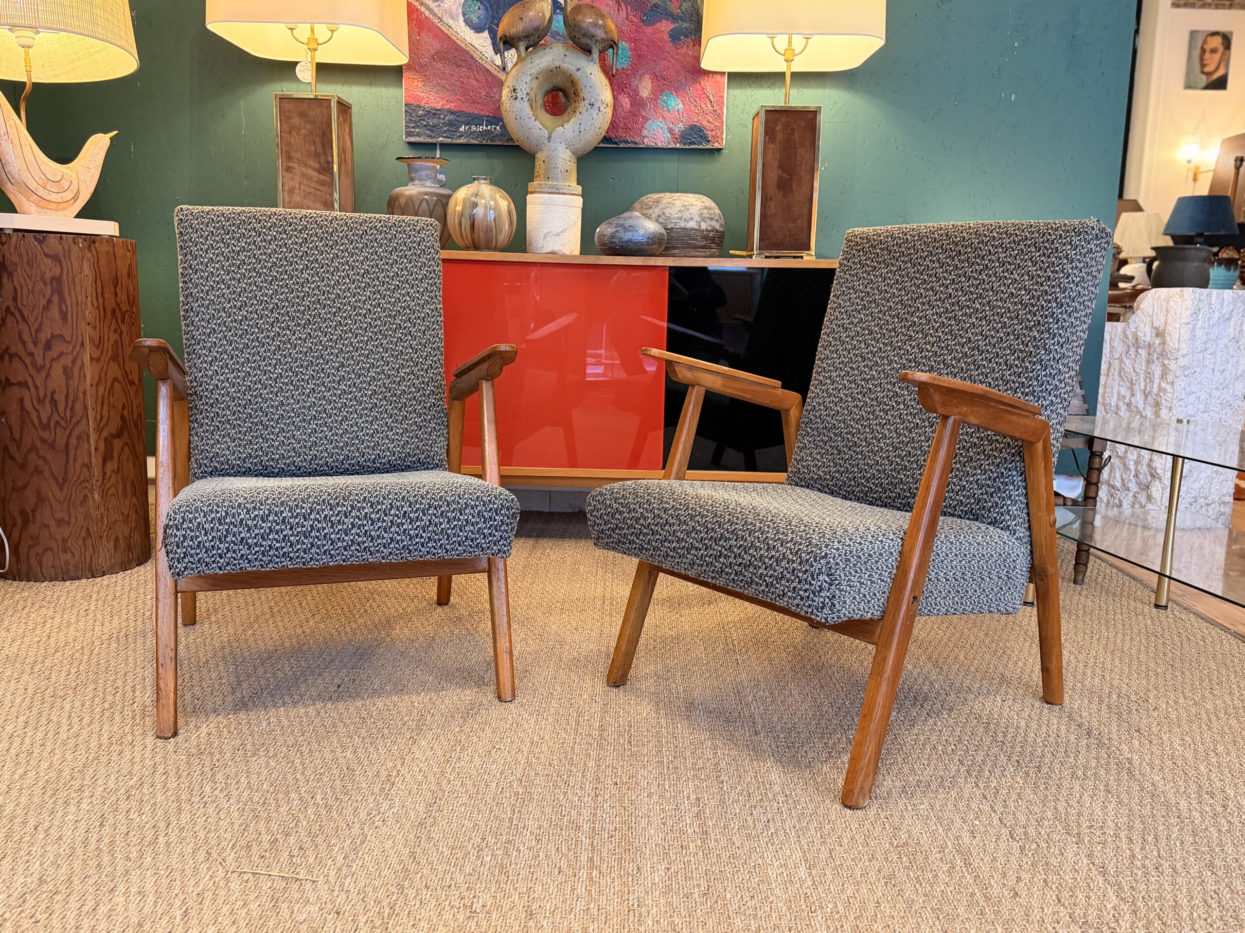 Paire de fauteuils vintage en chêne, tissu et assise d’origine