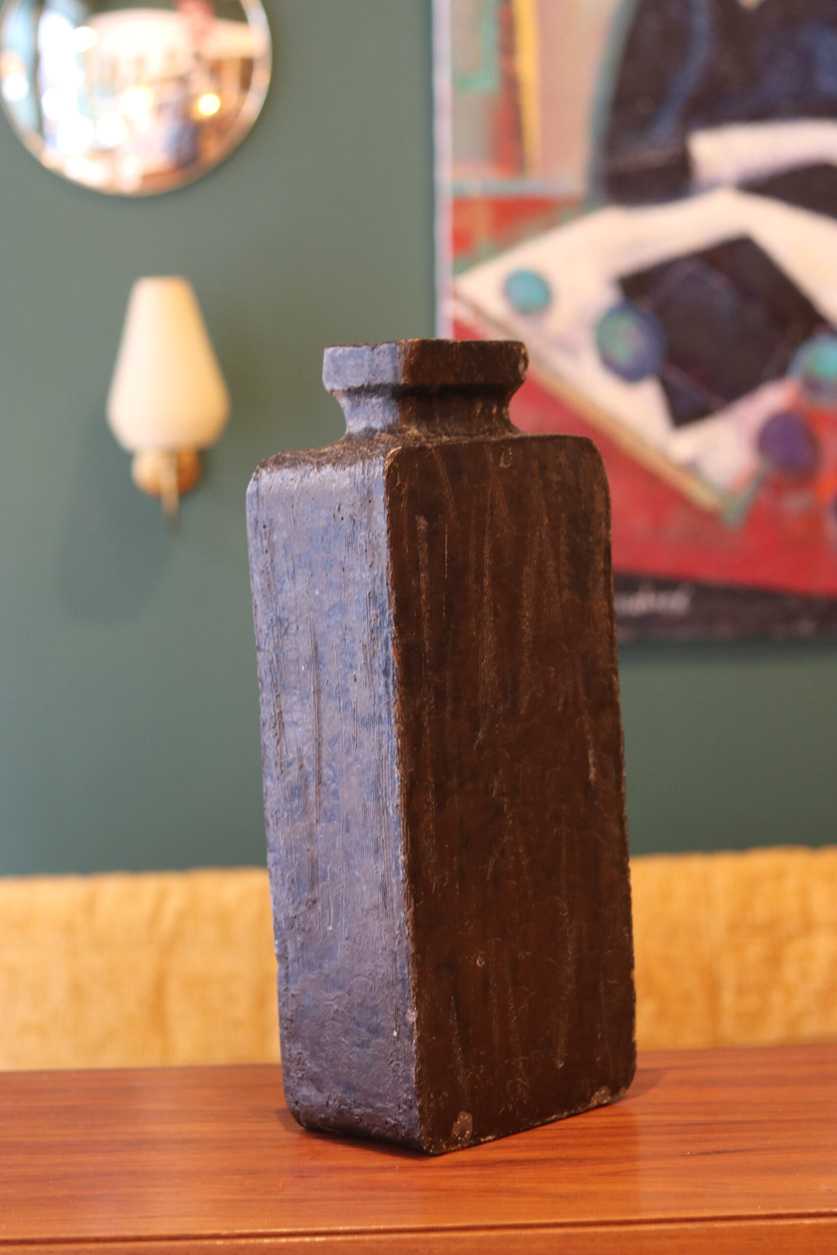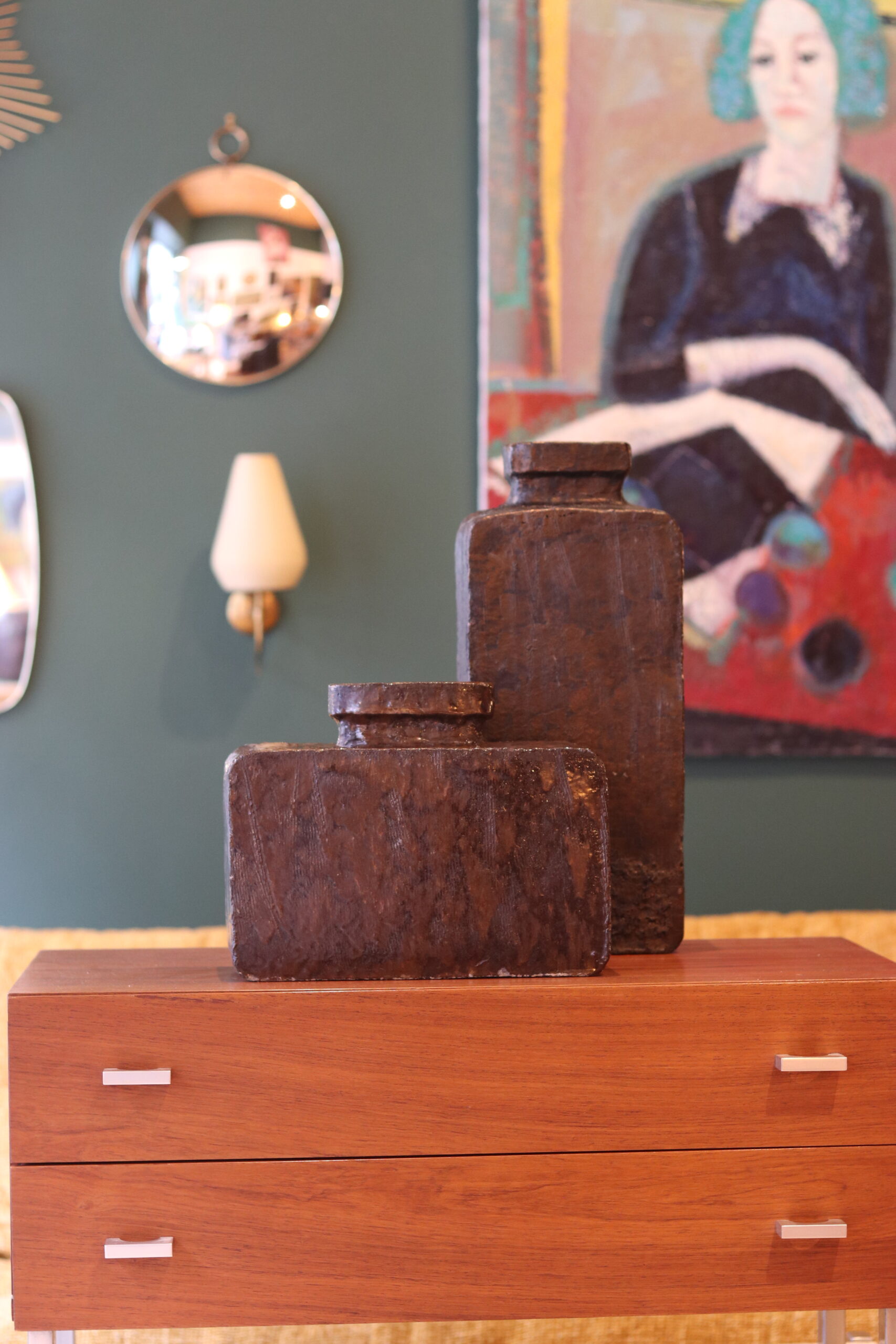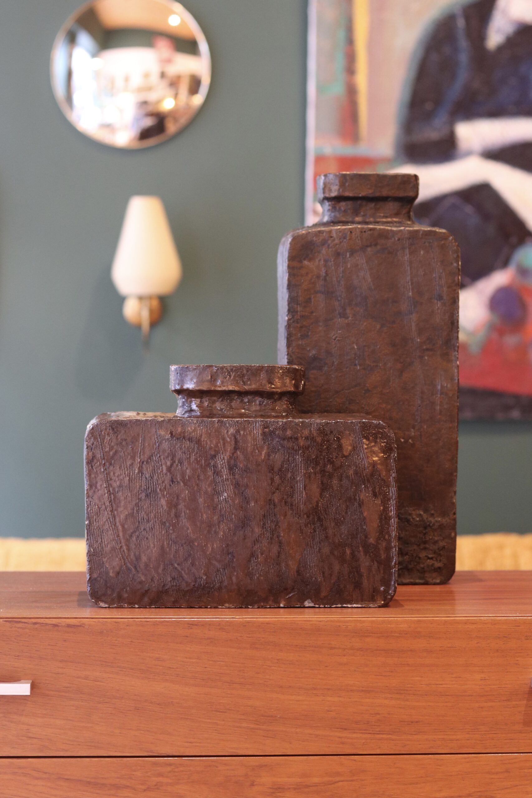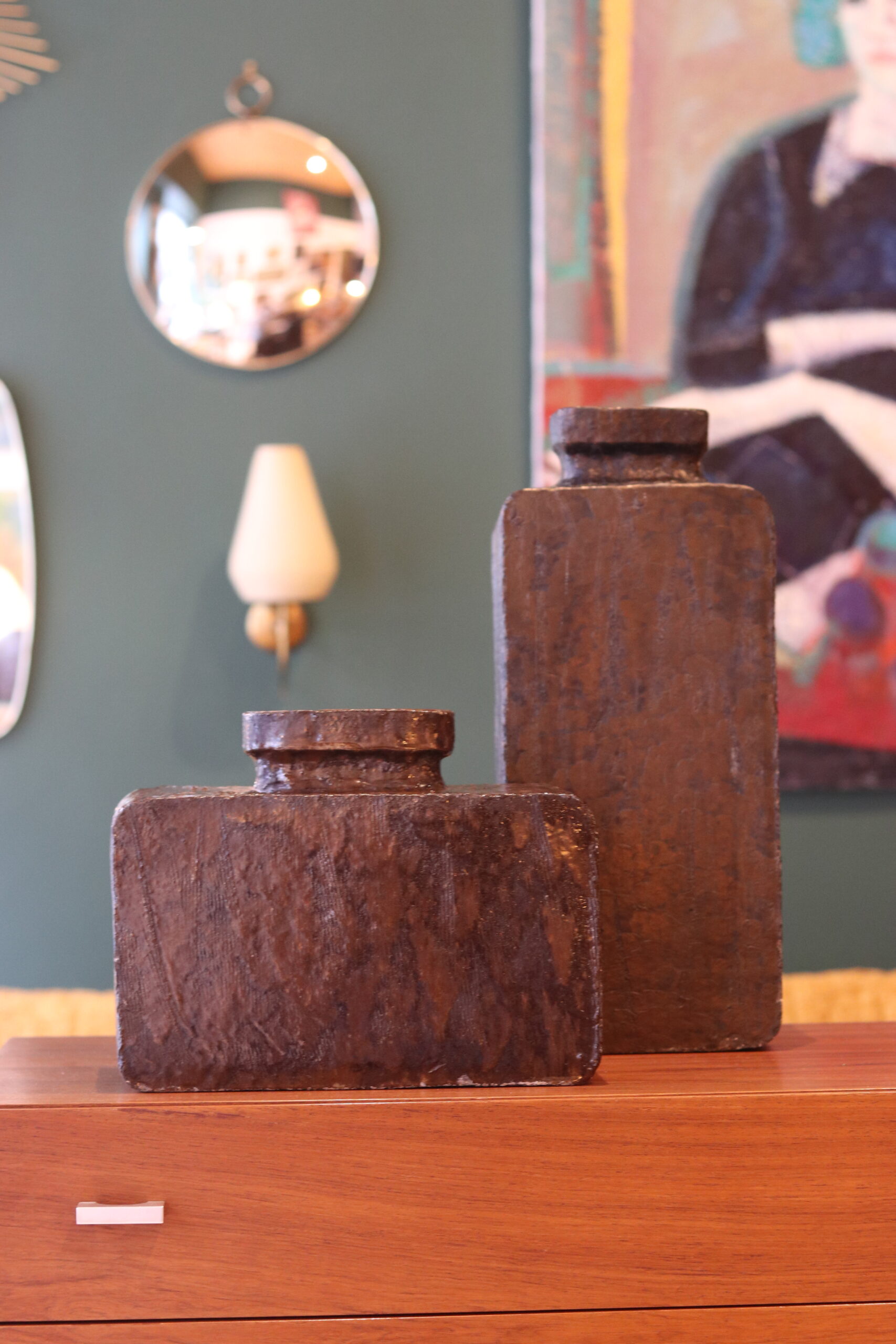 Imposante paire de vases en grès vernissé, signés JD, datant des années 1970. Leur forme géométrique et la matière brute évoquent les recherches de céramistes d’atelier de la période brutaliste.