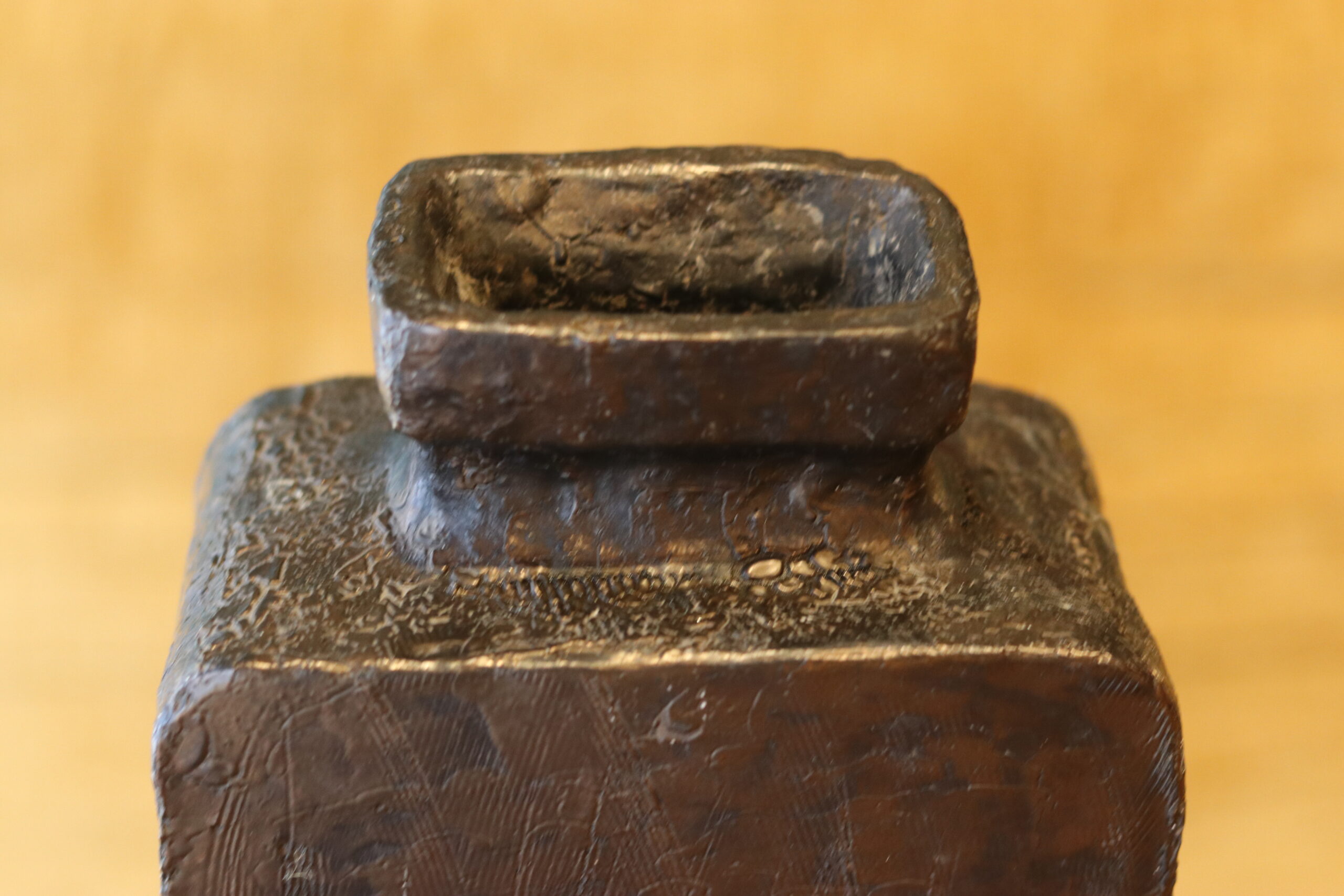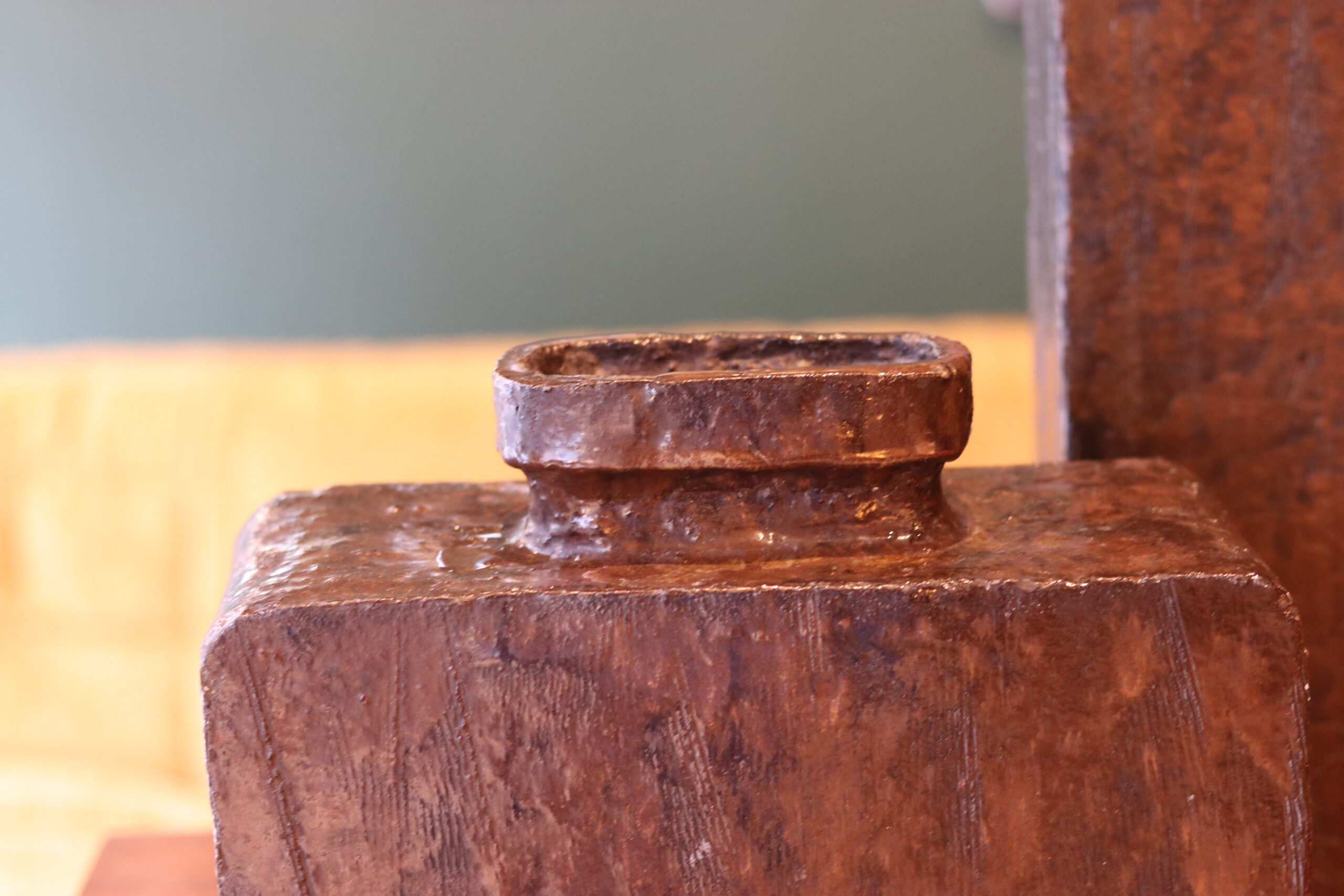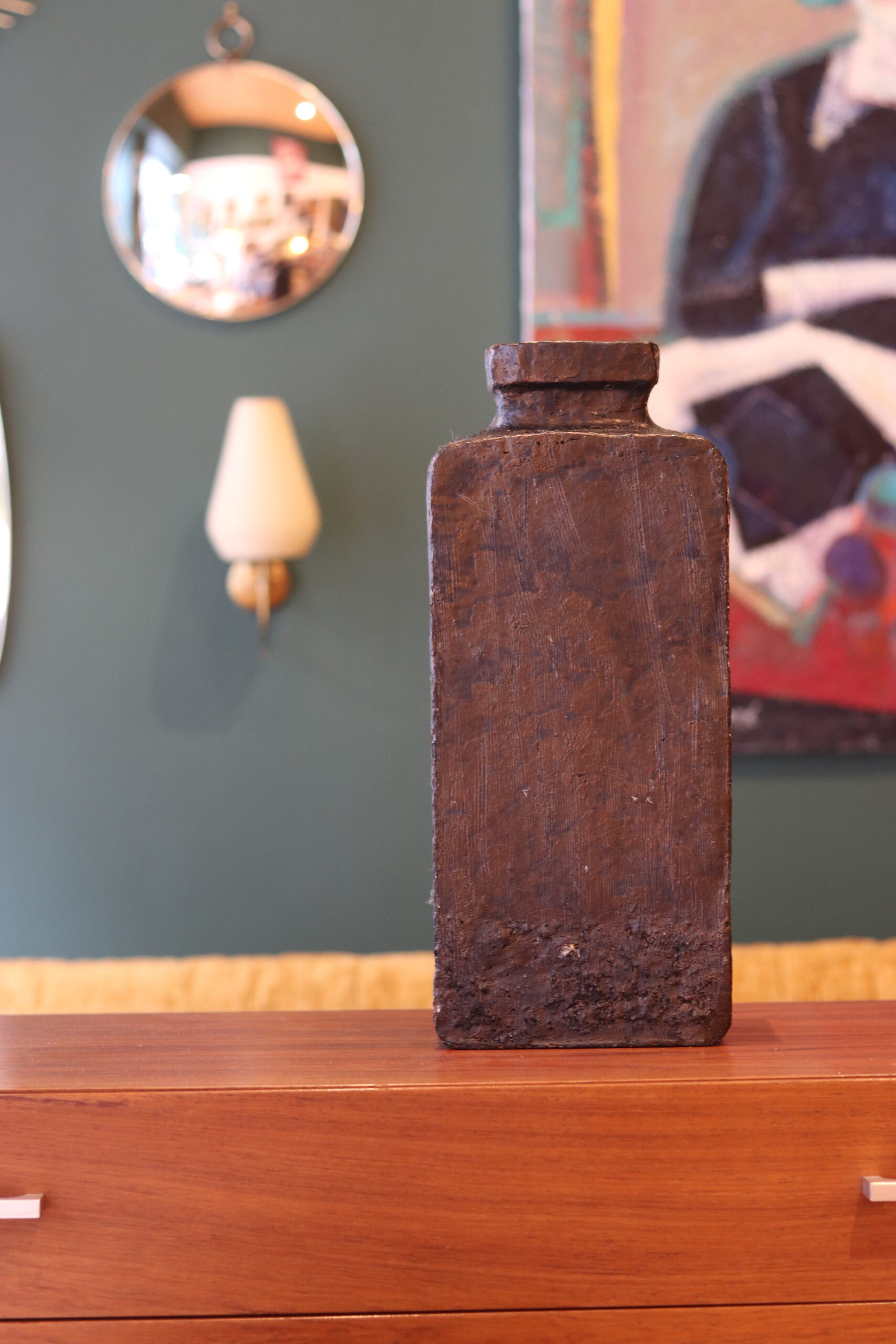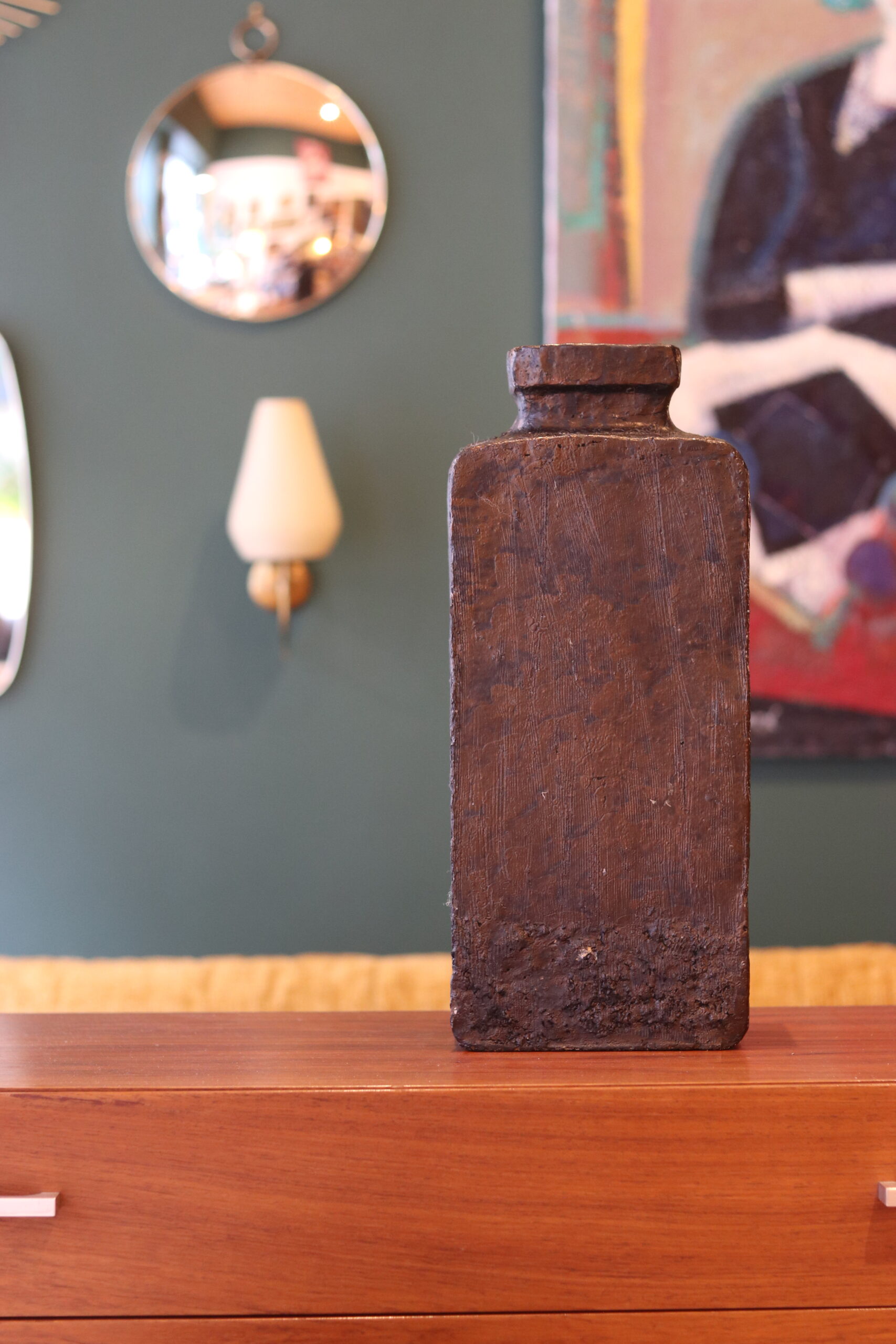 Imposante paire de vases en grès vernissé, signés JD, datant des années 1970. Leur forme géométrique et la matière brute évoquent les recherches de céramistes d’atelier de la période brutaliste.
