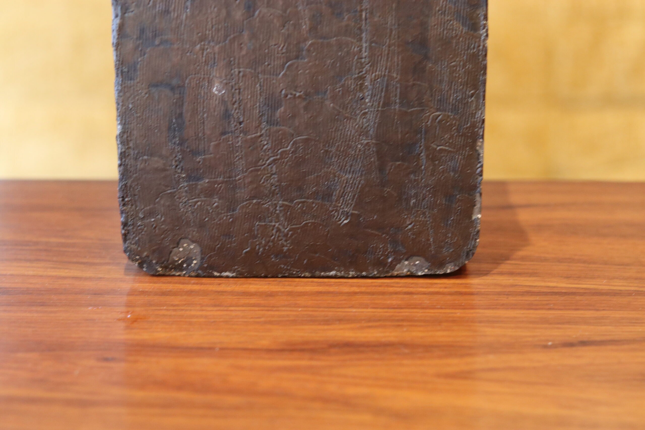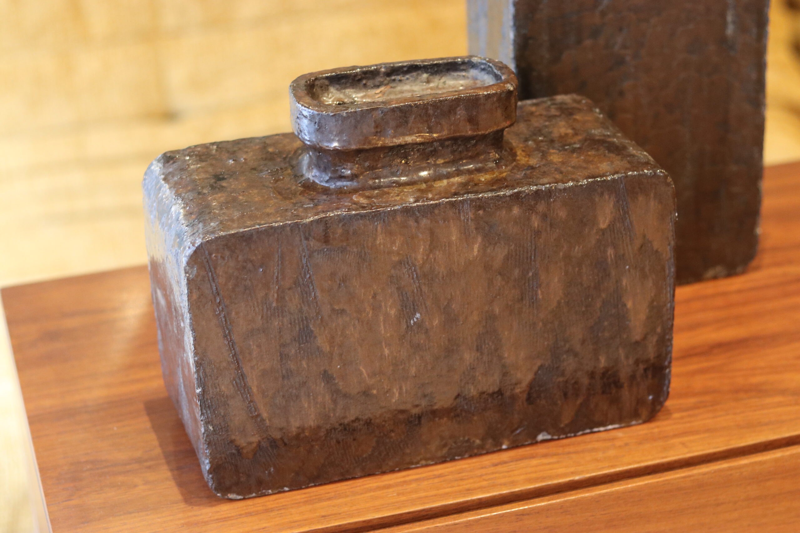 Le grand vase (H : 43 cm, L : 18 cm, P : 11 cm) présente une texture granuleuse et mate, tandis que le plus petit (H : 24 cm, L : 29,5 cm, P : 12 cm) offre un aspect plus lisse et légèrement vernissé, créant un dialogue subtil entre les deux surfaces.
