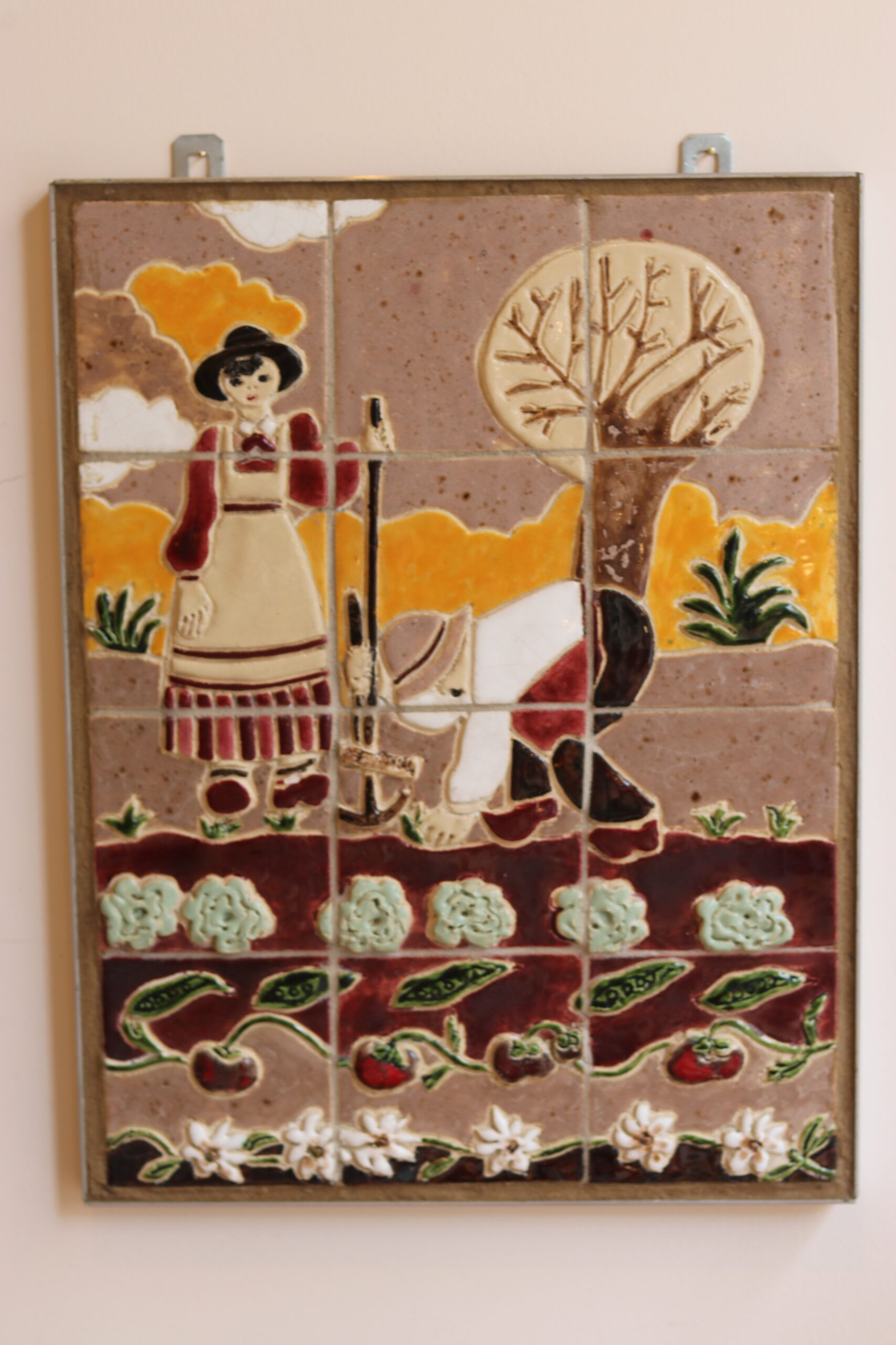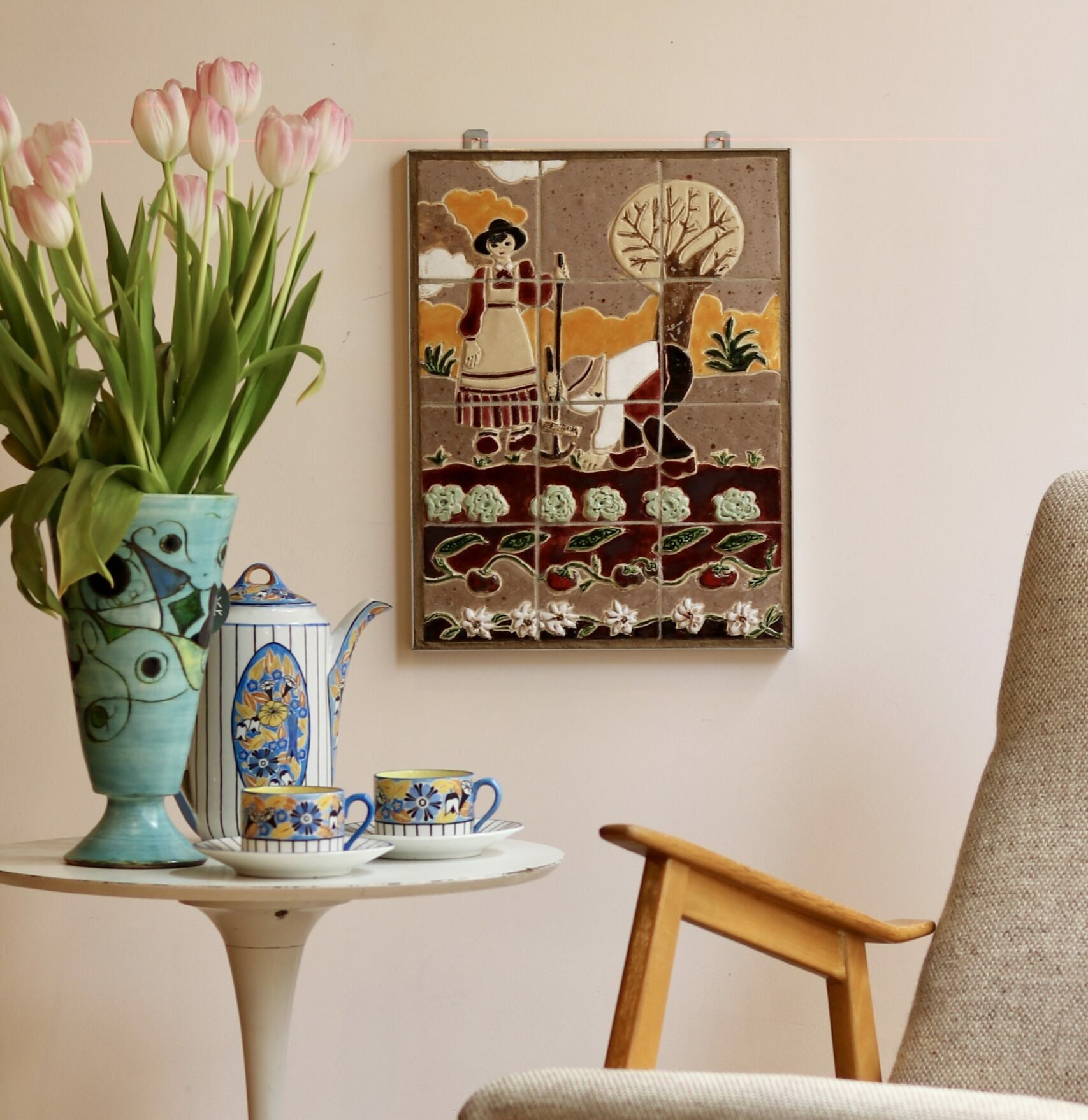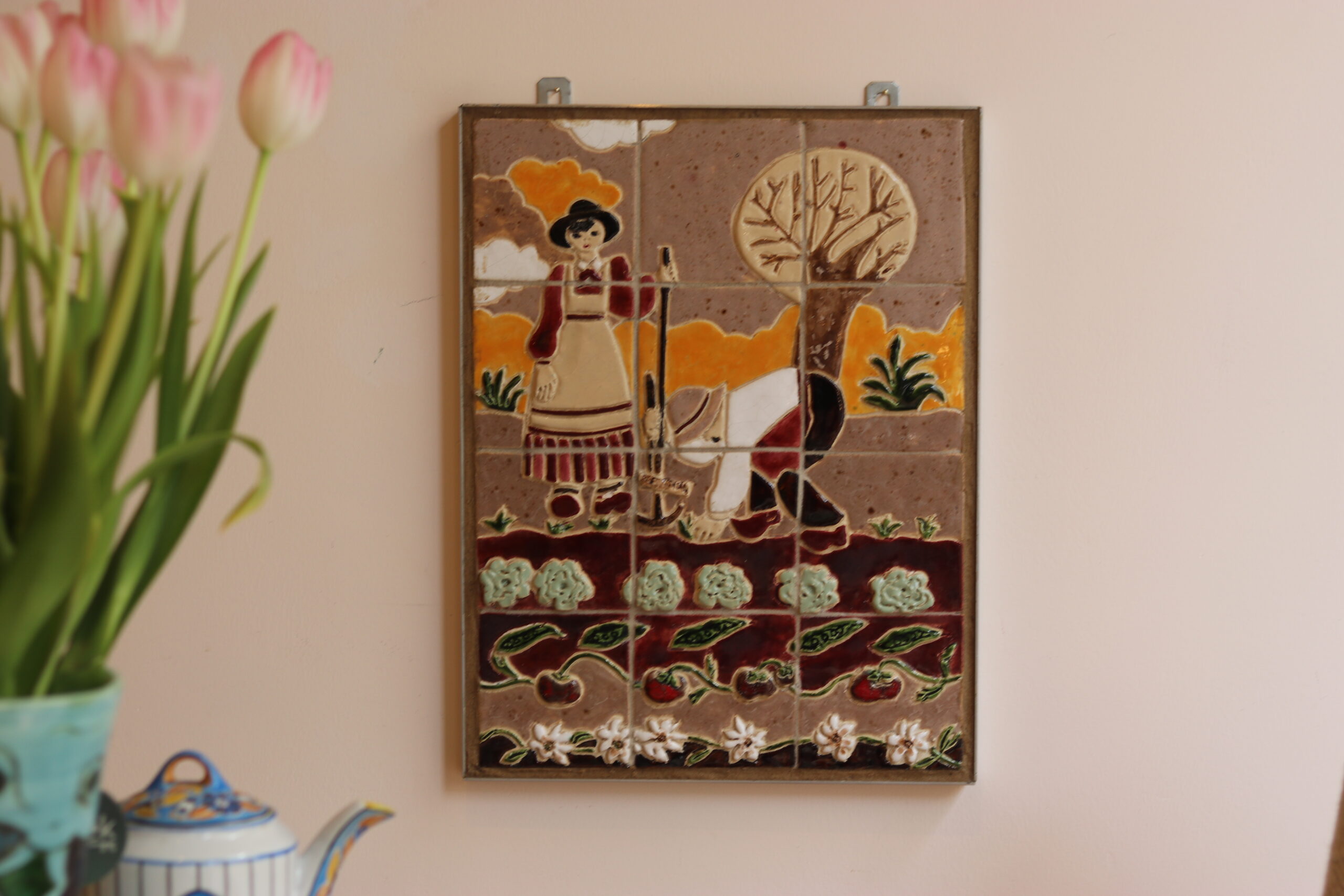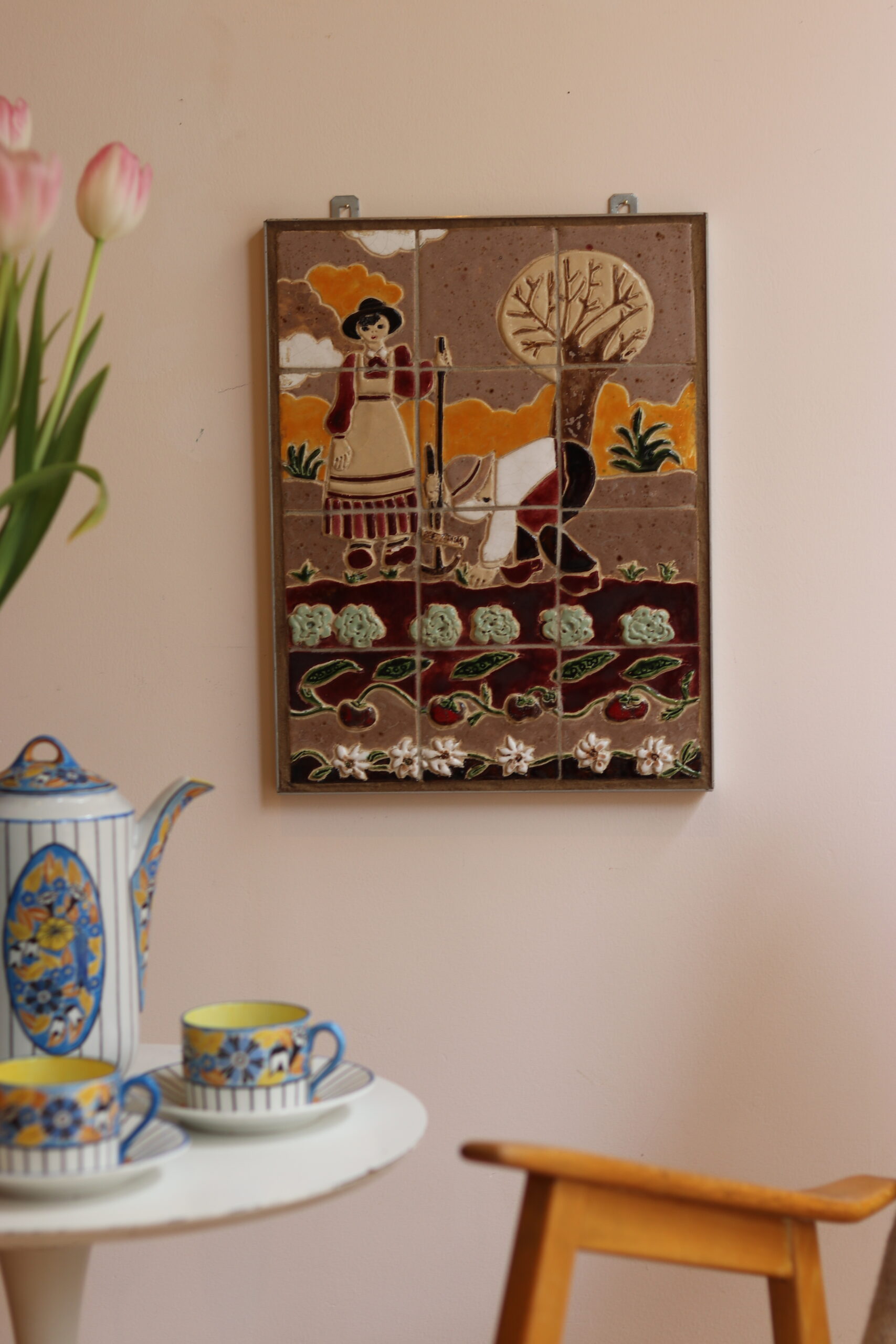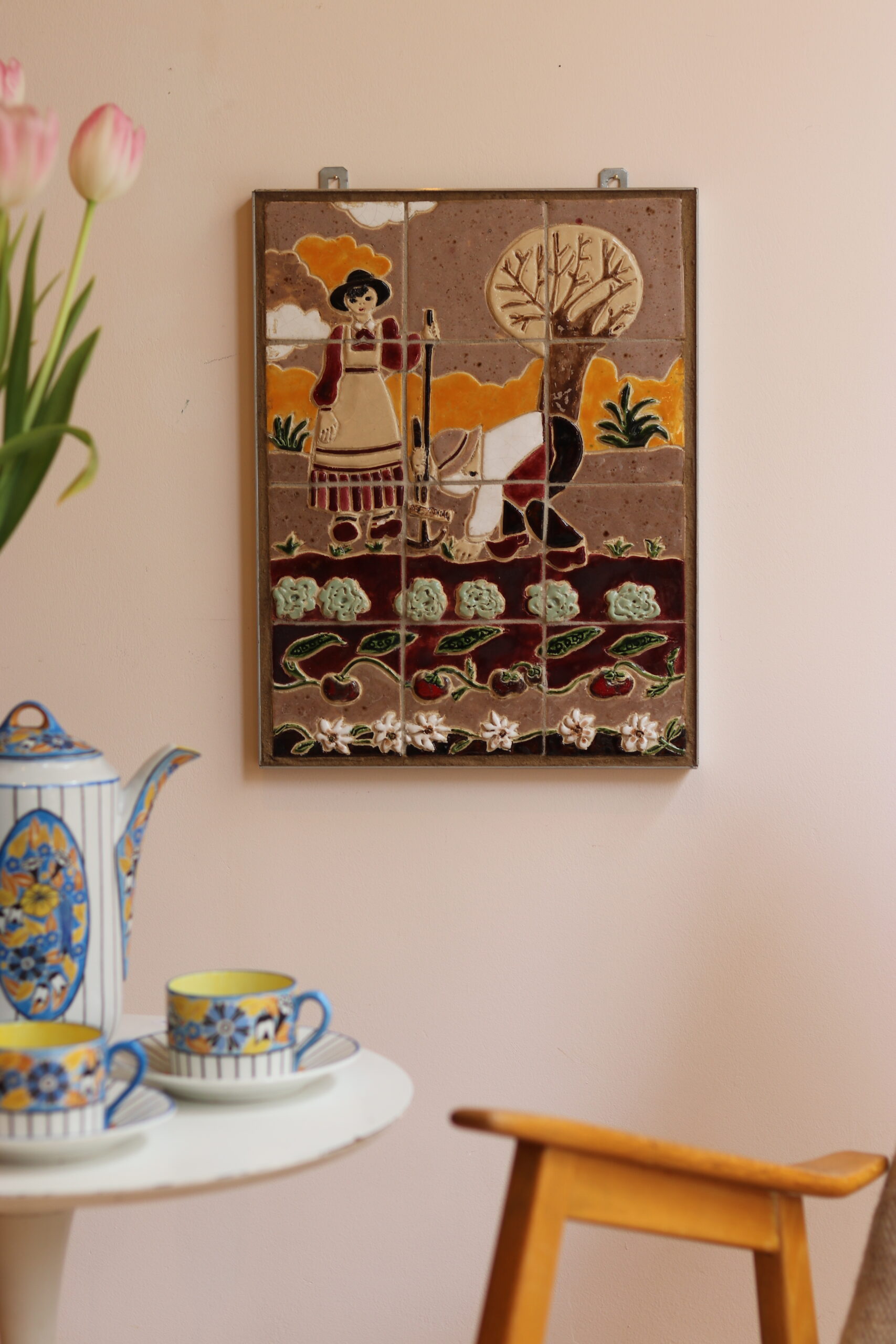 La scène représente un motif naïf et poétique, évoquant la vie rurale avec des personnages stylisés, traités dans une palette chaleureuse de tons terreux, ocre, vert et bordeaux. Le dessin, à la fois simple et expressif, est mis en valeur par le relief de l’émail et le découpage en carreaux.
