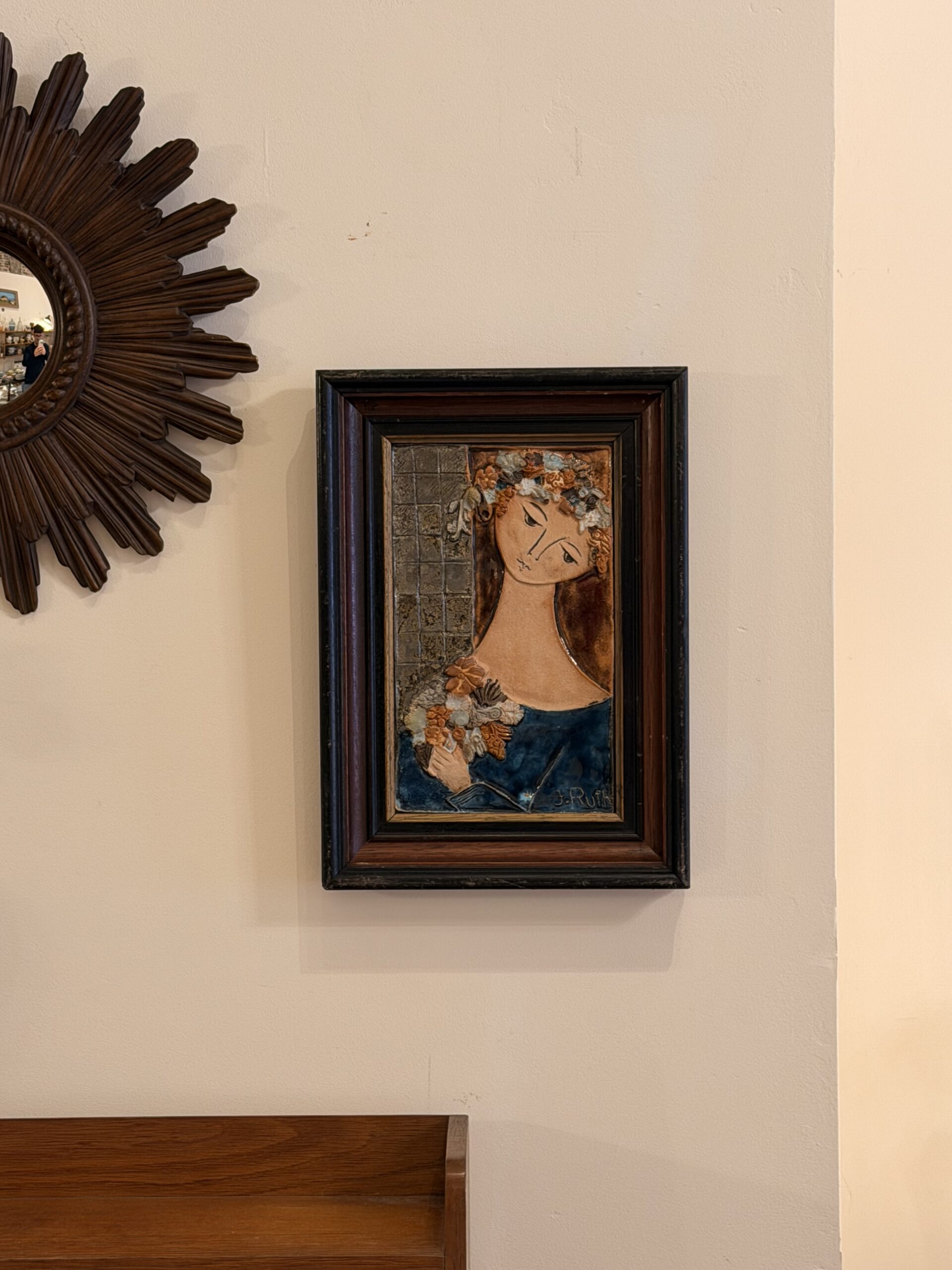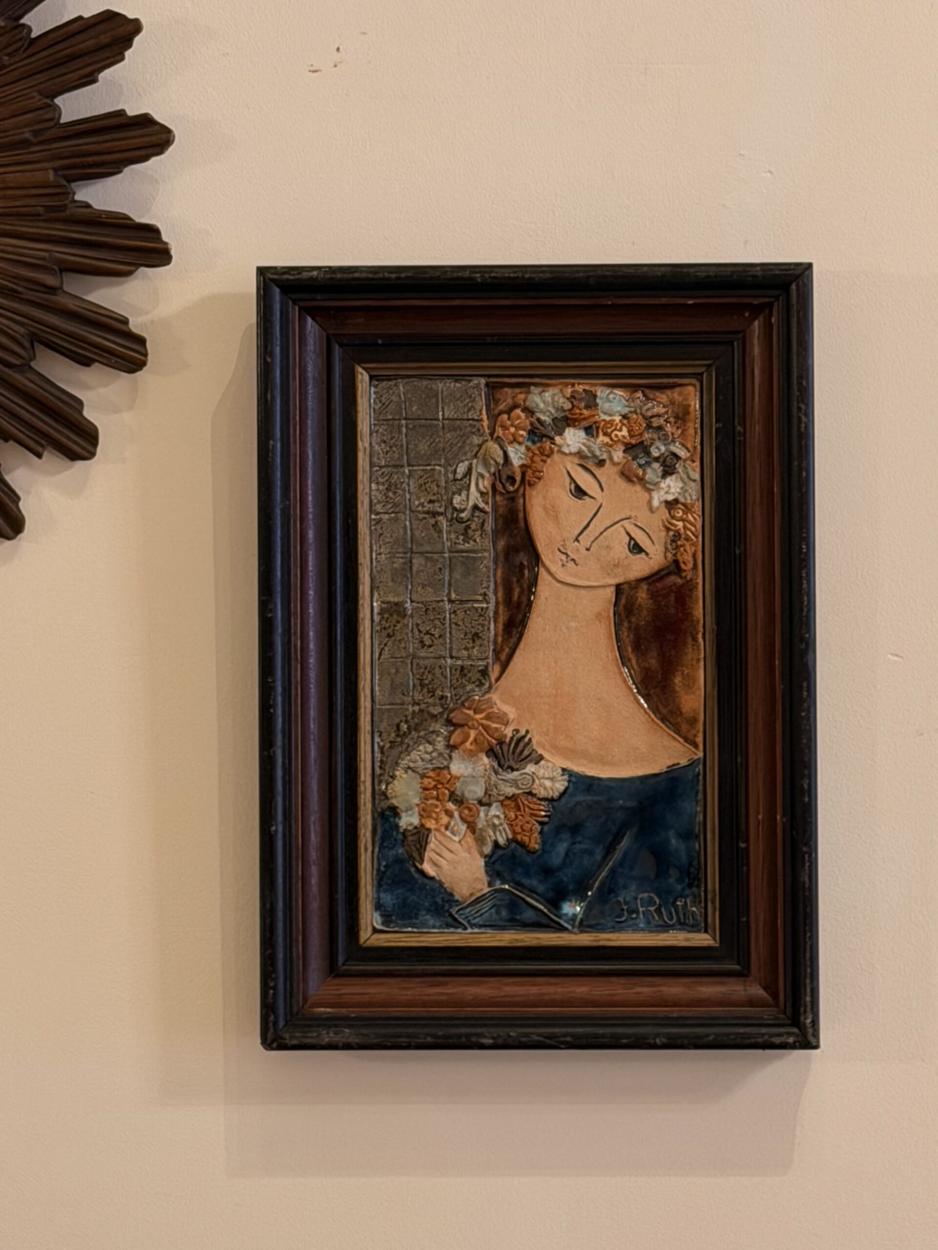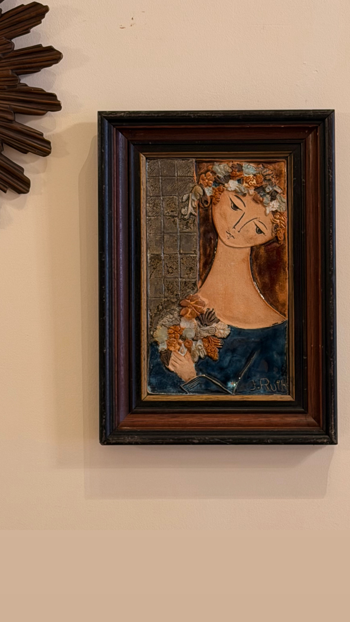 anneau mural en céramique émaillée signé Ruth Faktor (née en 1937), représentant un délicat portrait féminin au style stylisé et expressif. La composition met en scène une figure élancée, au visage incliné et entourée de fleurs, dans une palette chaleureuse mêlant bruns, bleus et nuances naturelles.