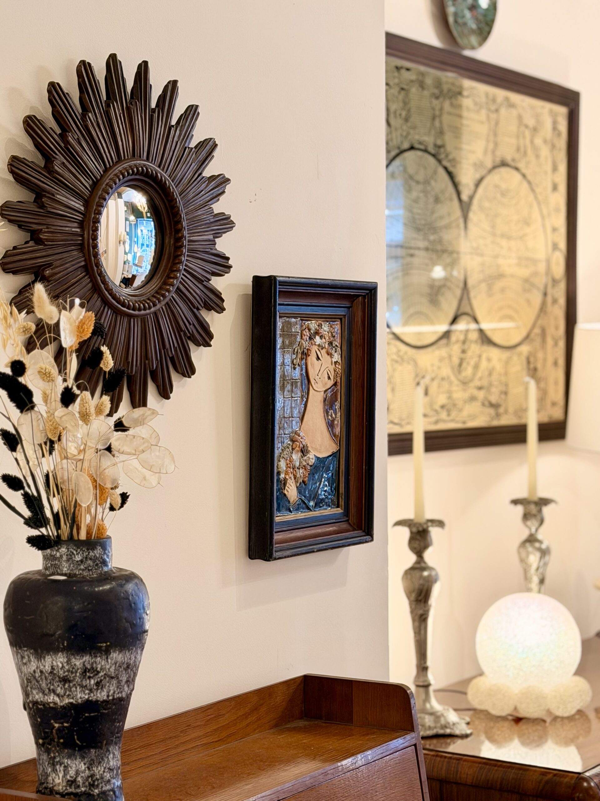 Le travail de la céramique en relief apporte texture et profondeur à l’ensemble, renforçant le caractère artisanal et artistique de la pièce. Le fond structuré et les détails floraux témoignent d’un véritable sens décoratif, typique des productions céramiques de la seconde moitié du XXe siècle.