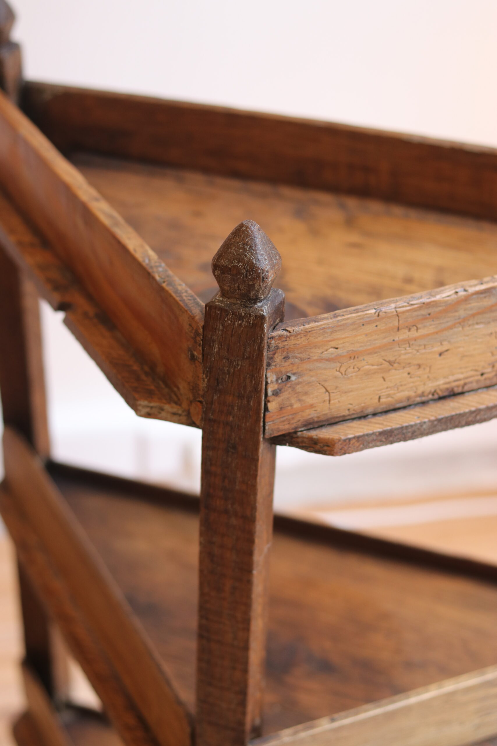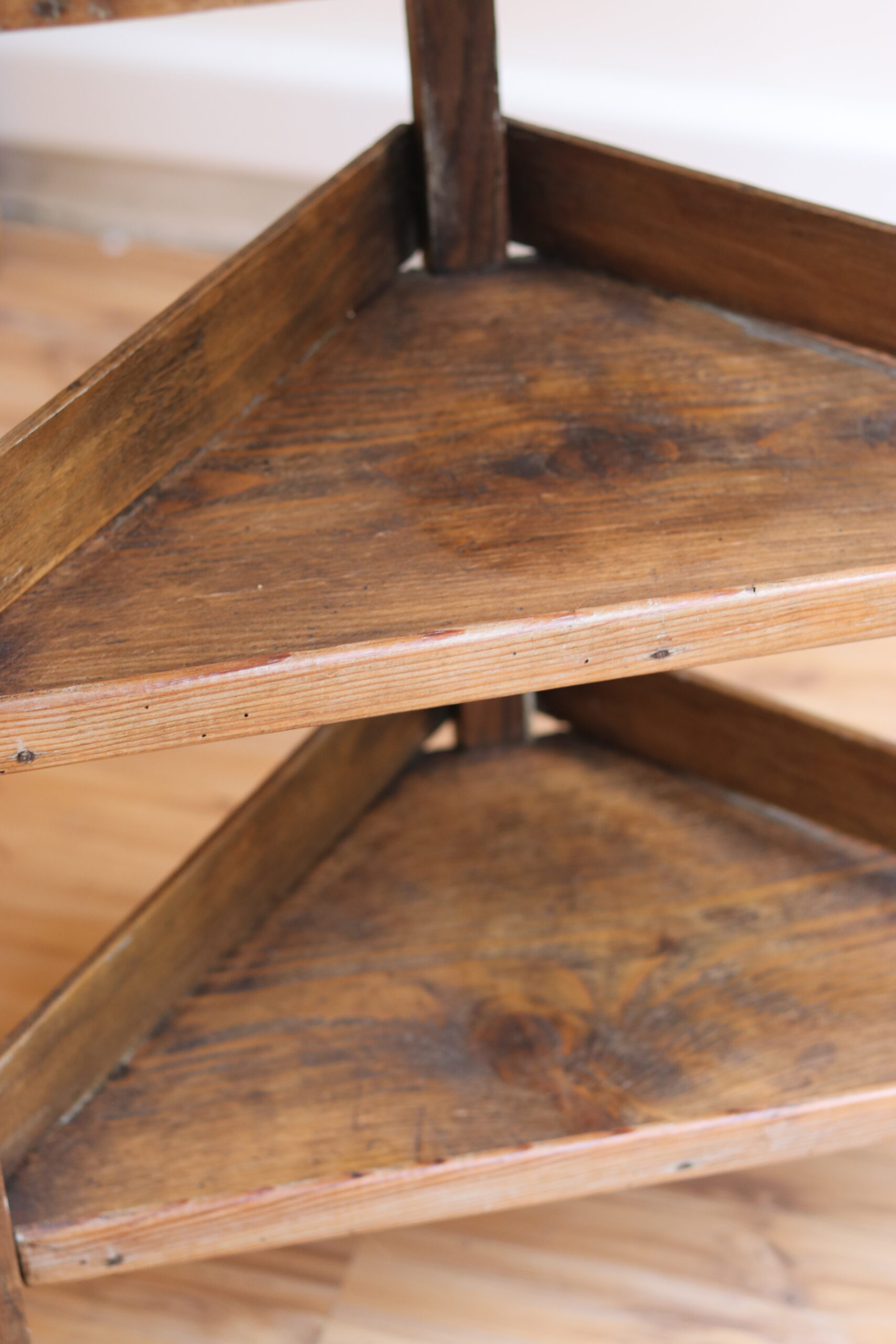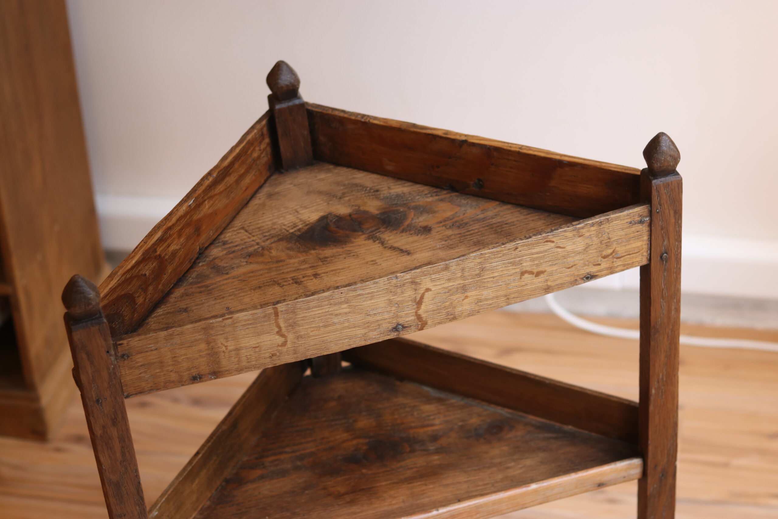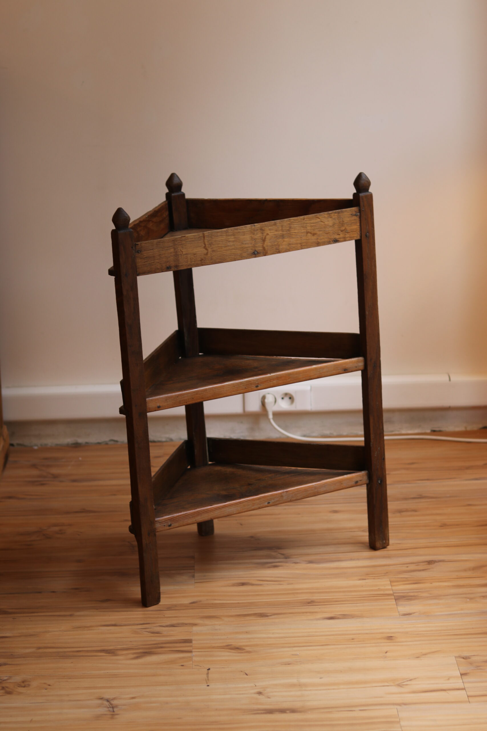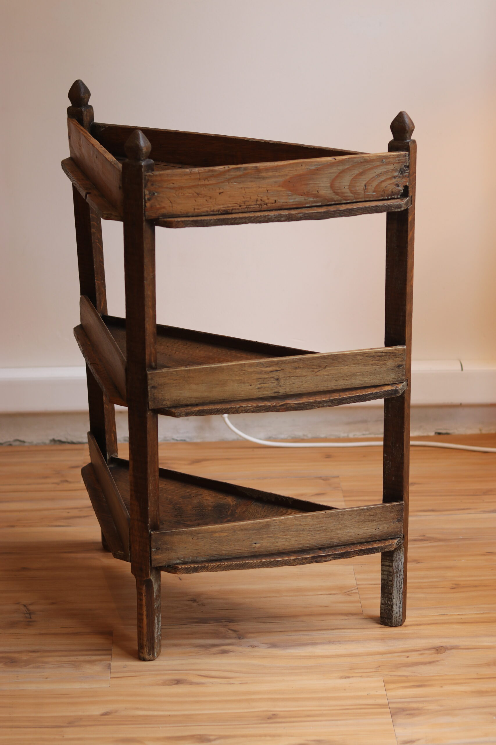 Petit meuble d’angle en chêne, travail populaire bourguignon XIXe, trois plateaux triangulaires à rebords et jolis montants sculptés. Très décoratif, brut et authentique.