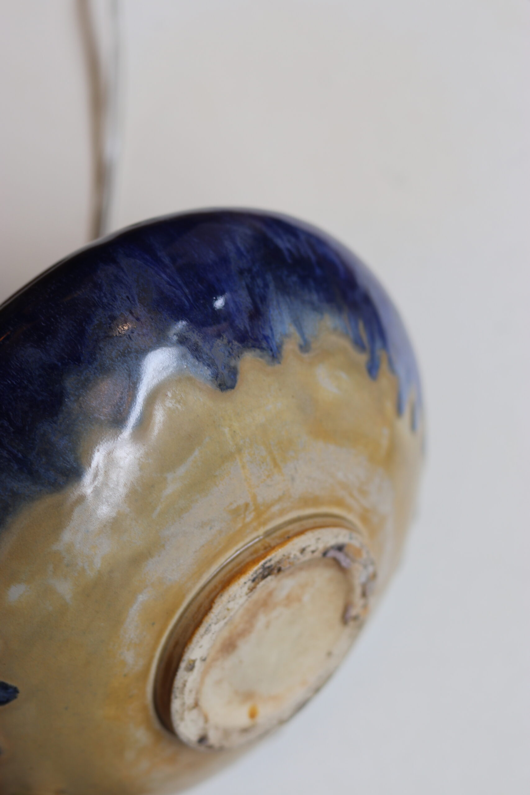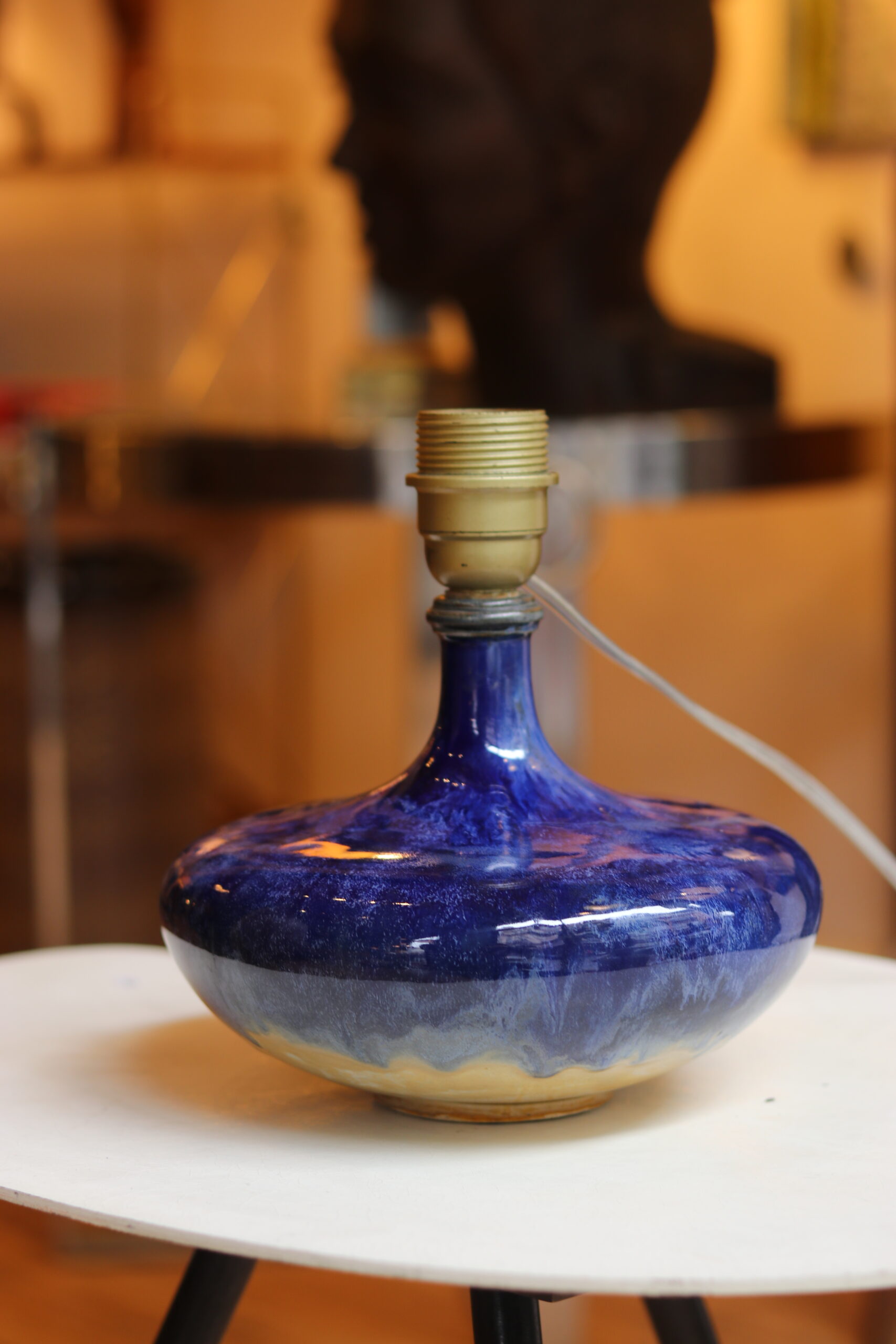 Pied de lampe en grès émaillé bleu, travail des années 50. Forme galbée avec col évasé. Dimensions : H 16 cm x Ø 20 cm. Bon état, vendu sans abat-jour