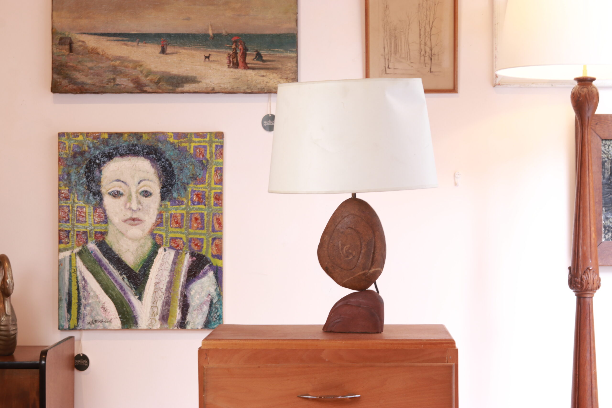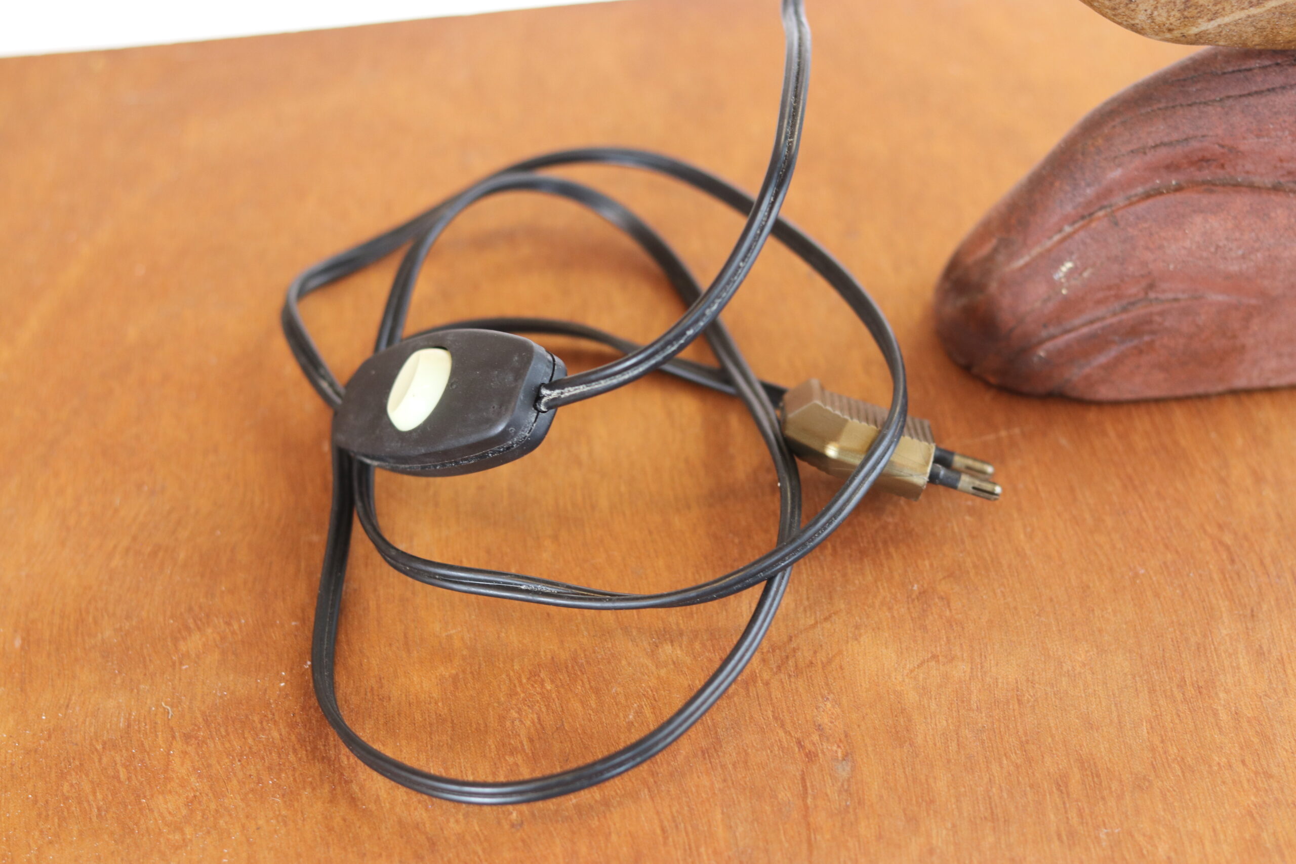 Pied de lampe en pierre sculptée, évoquant deux galets superposés aux tons brun chaud et rouge terre cuite. Travail des années 1970. L’abat-jour présenté n’est pas celui d’origine ; il est cabossé mais pourra être fourni gratuitement si souhaité.