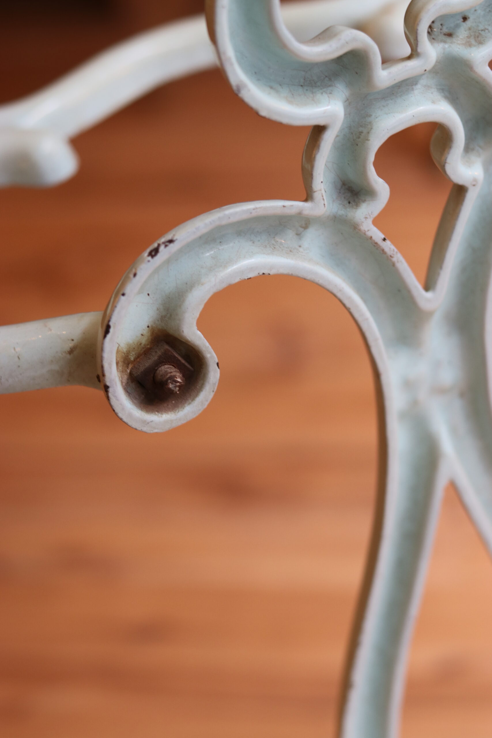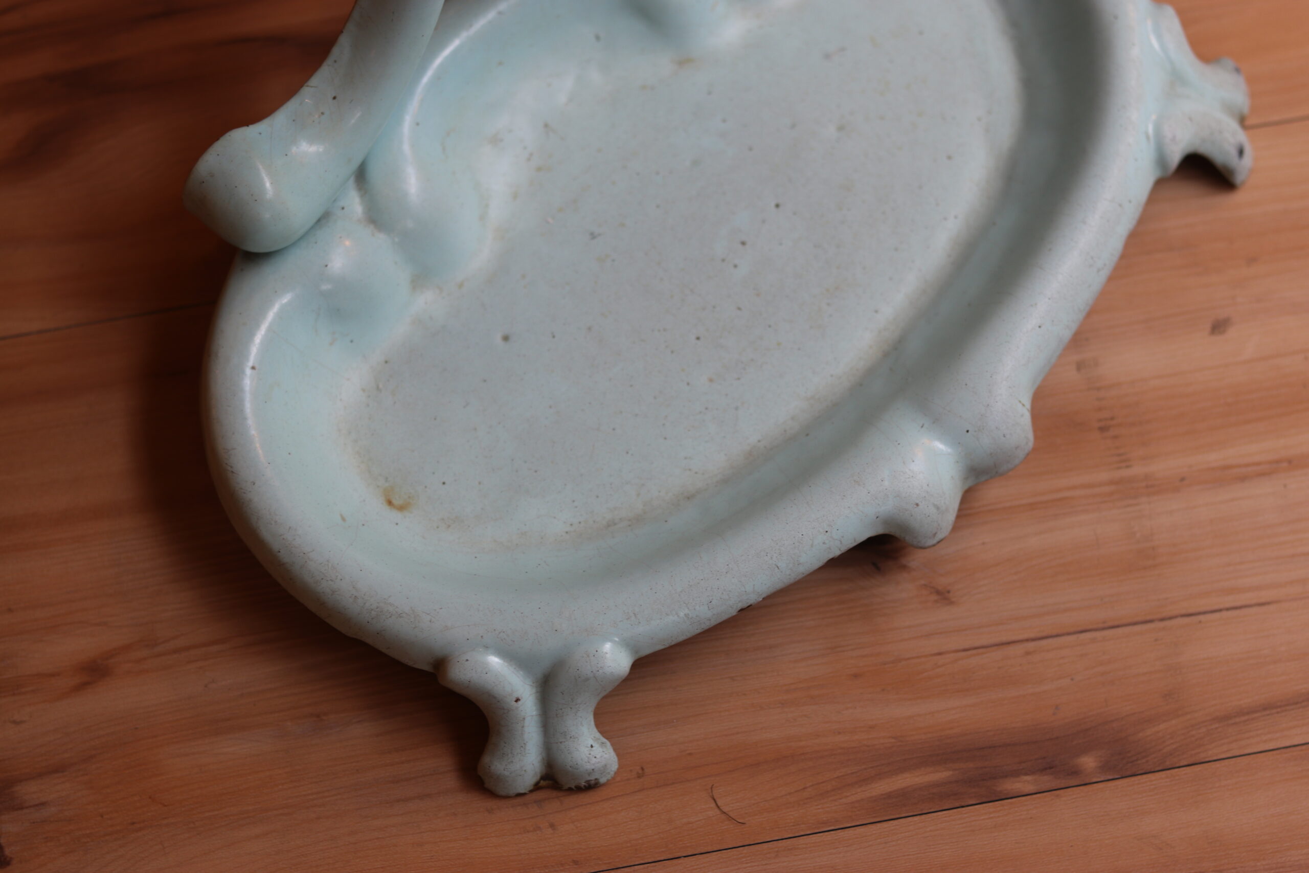 L’ensemble est en bon état général, l’émail présentant seulement quelques petites marques liées au temps, sans fragiliser la pièce. Le réceptacle inférieur, également en fonte émaillée, complète harmonieusement la composition.
