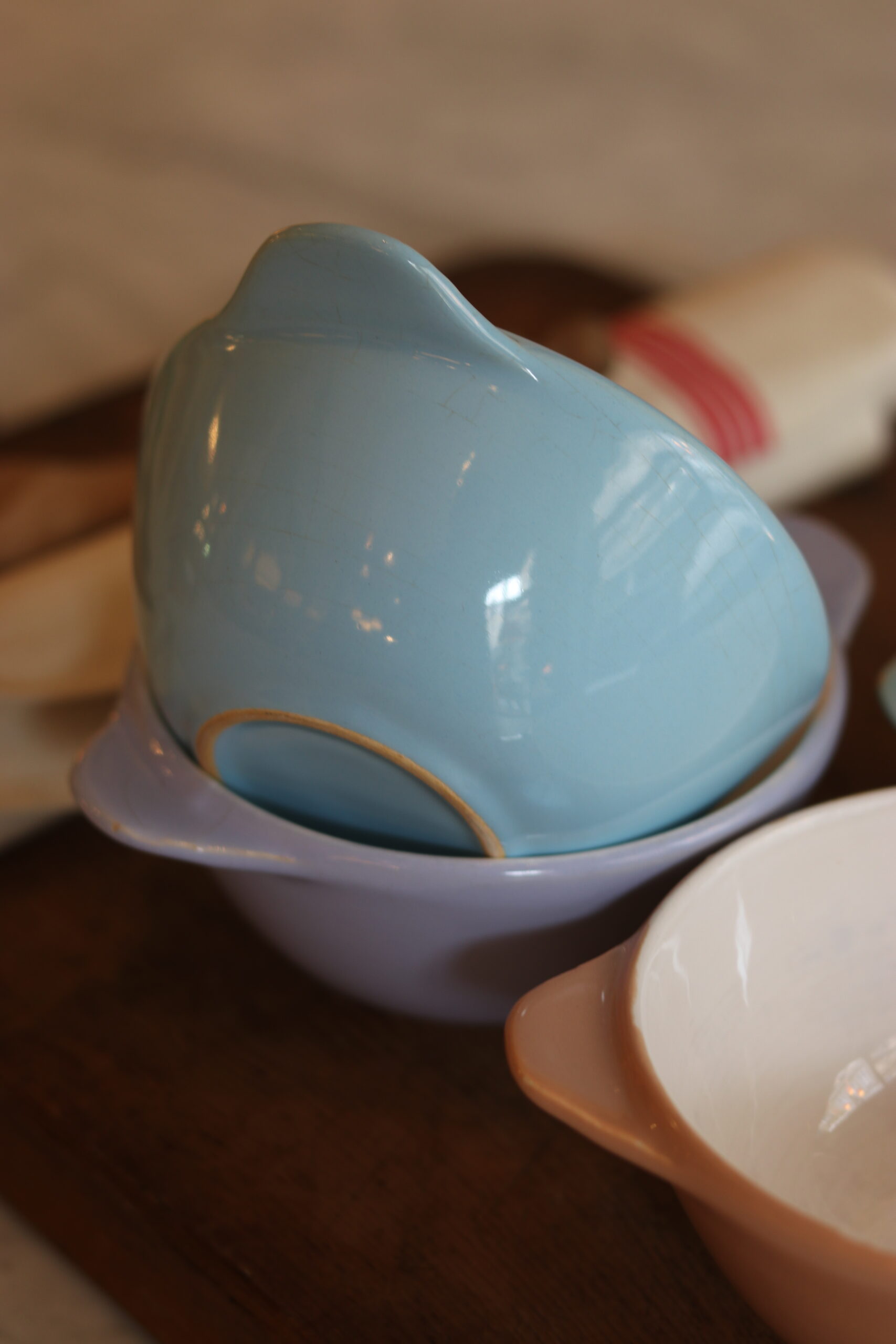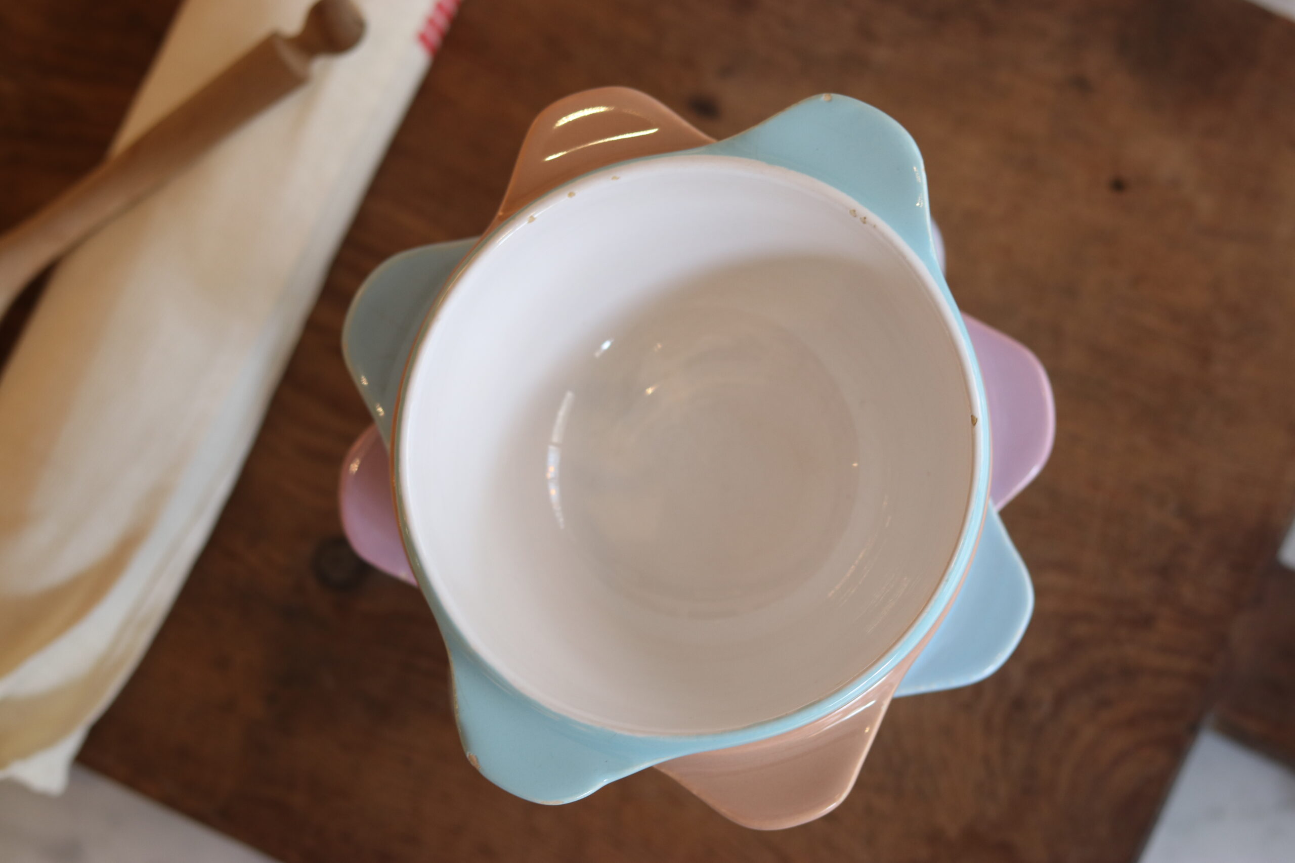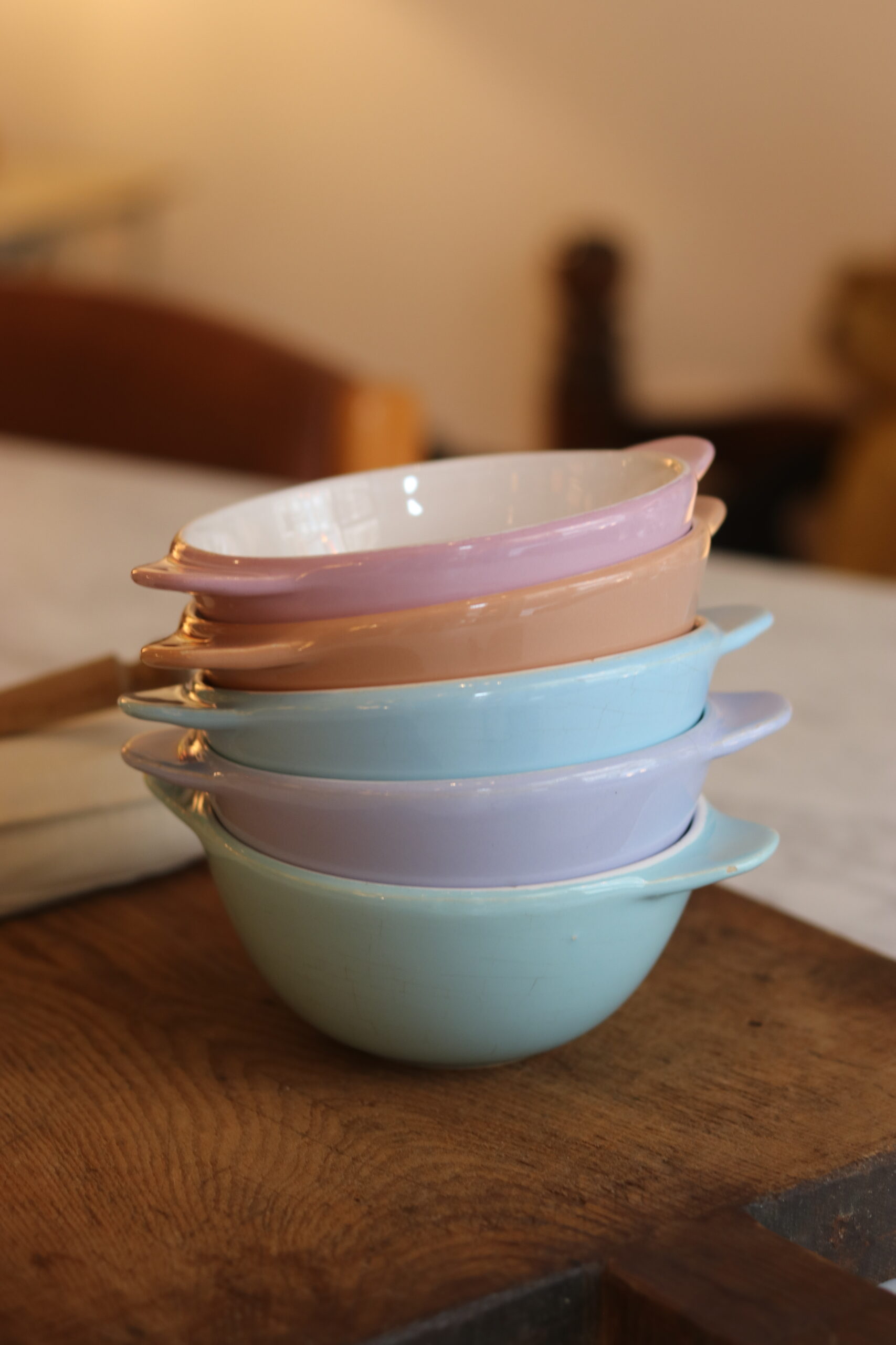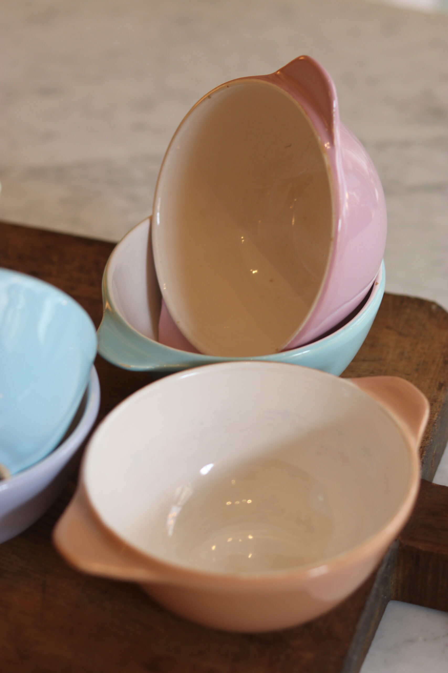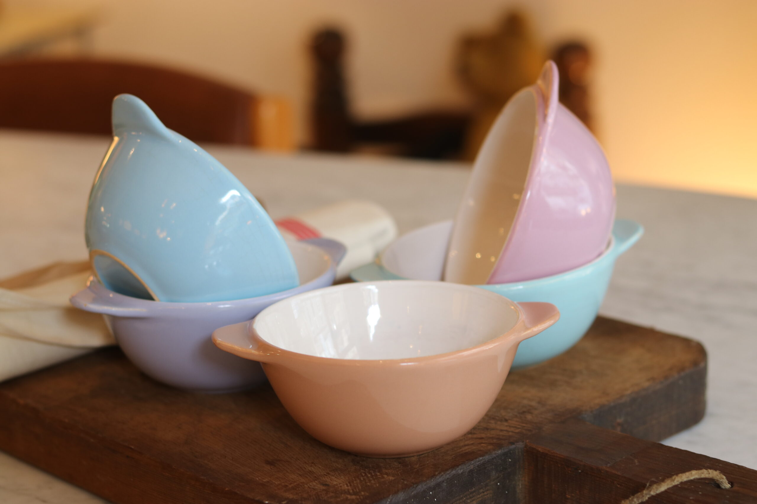 Charmante suite de cinq bols à oreilles en faïence émaillée datant des années 50. Leurs teintes pastel — rose poudré, bleu ciel, vert d’eau et mauve délicat — évoquent immédiatement l’esthétique douce et optimiste de l’après-guerre.