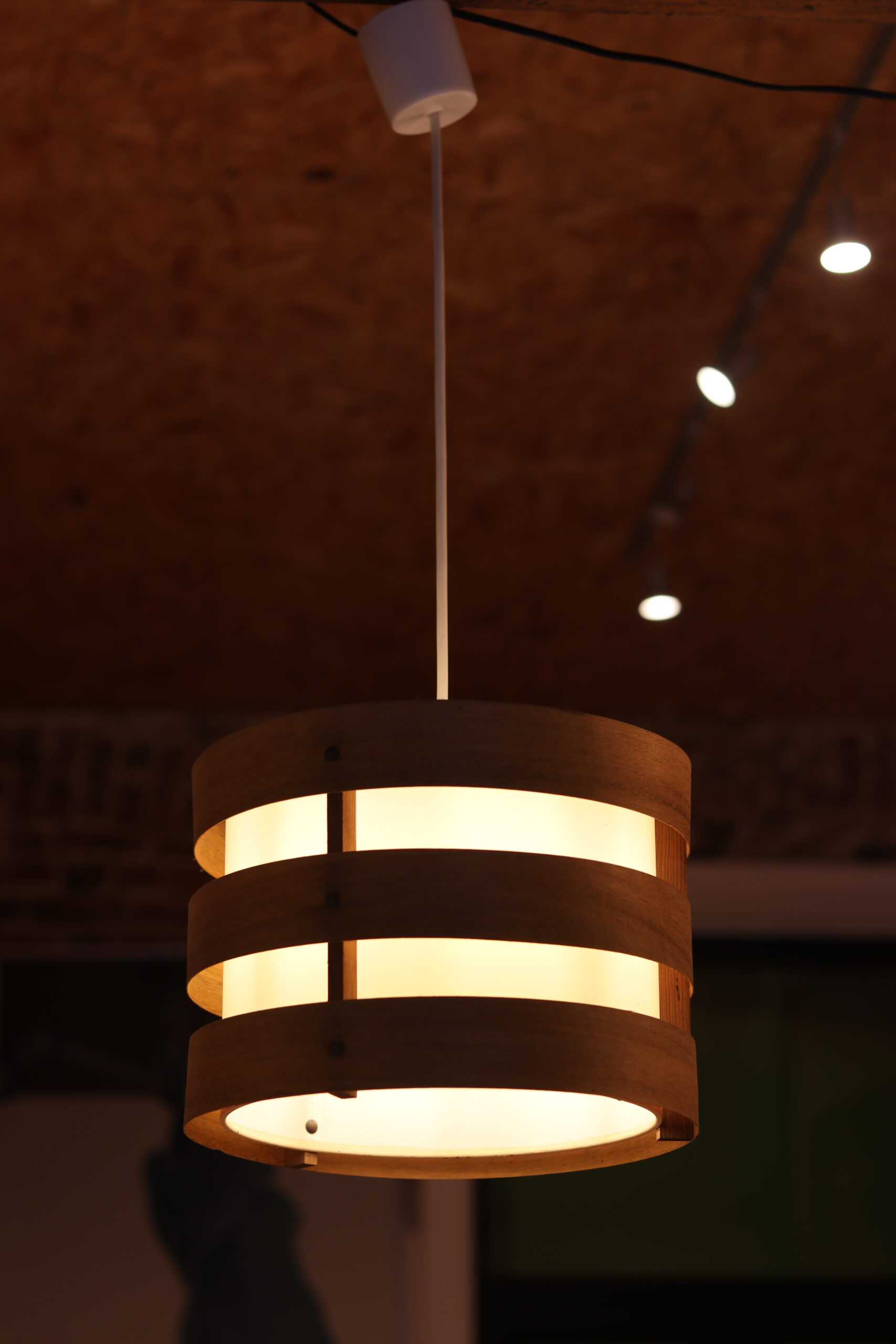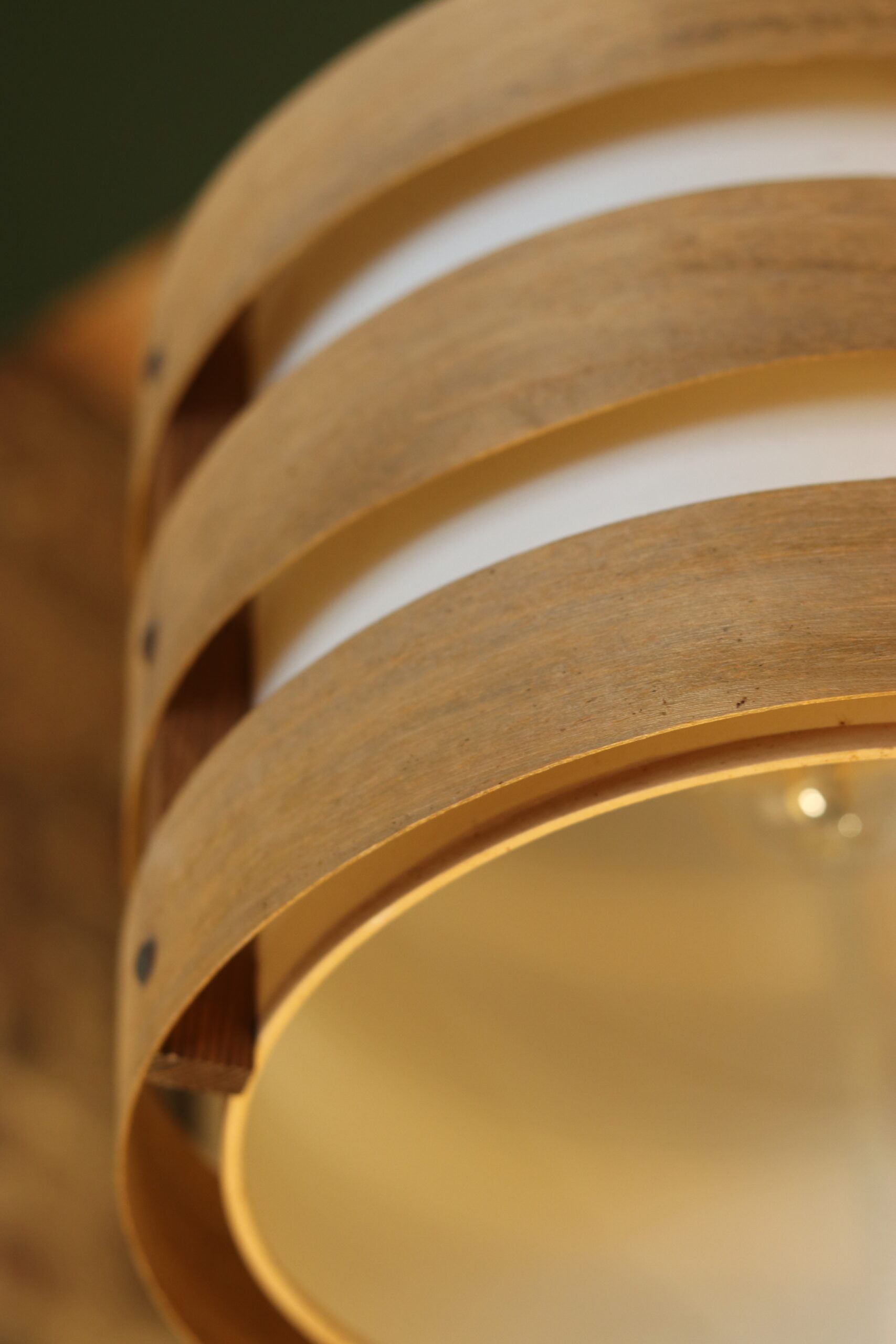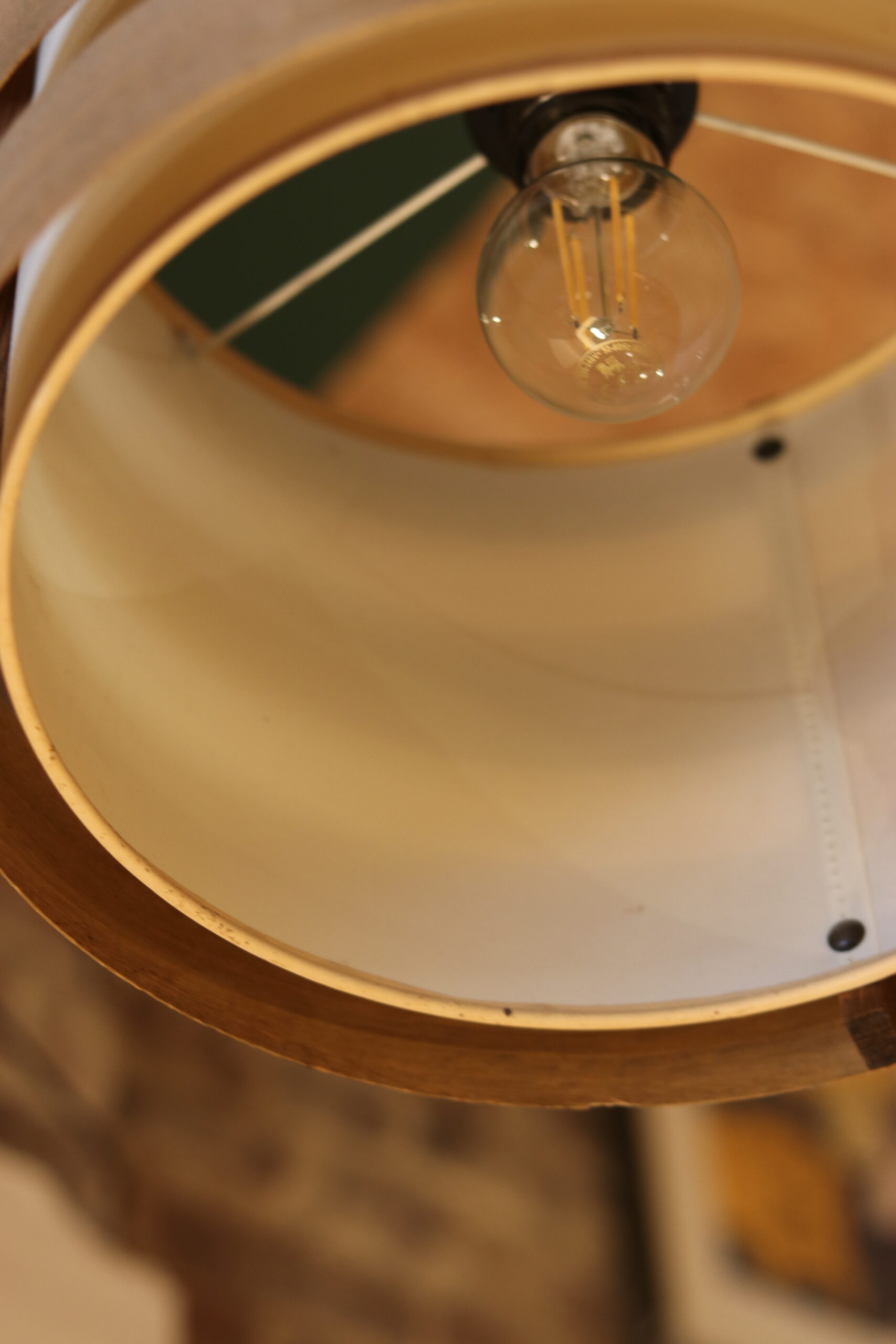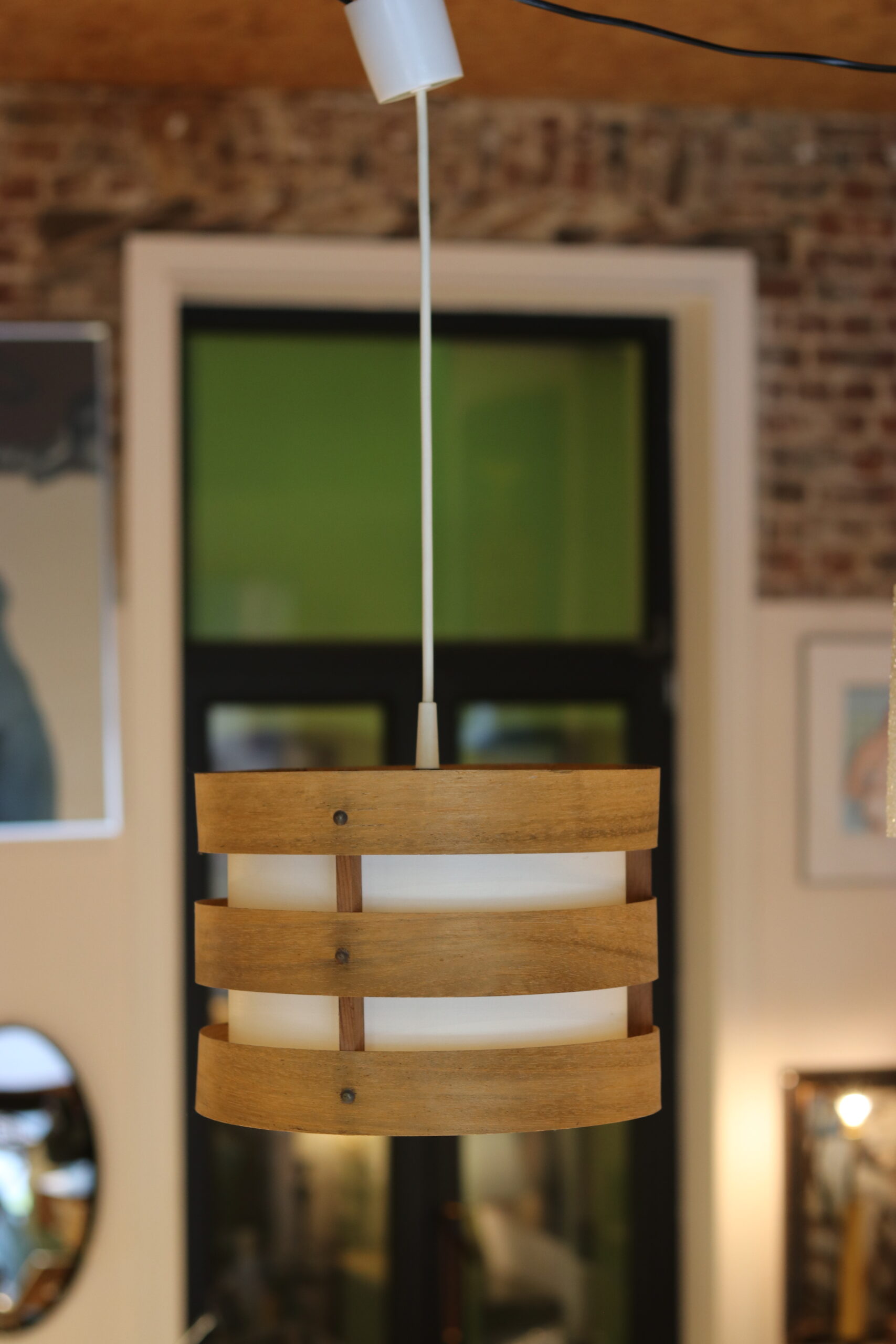 Suspension vintage Linus Bopp (Allemagne, 1960/70), bois cintré et abat-jour textile blanc.