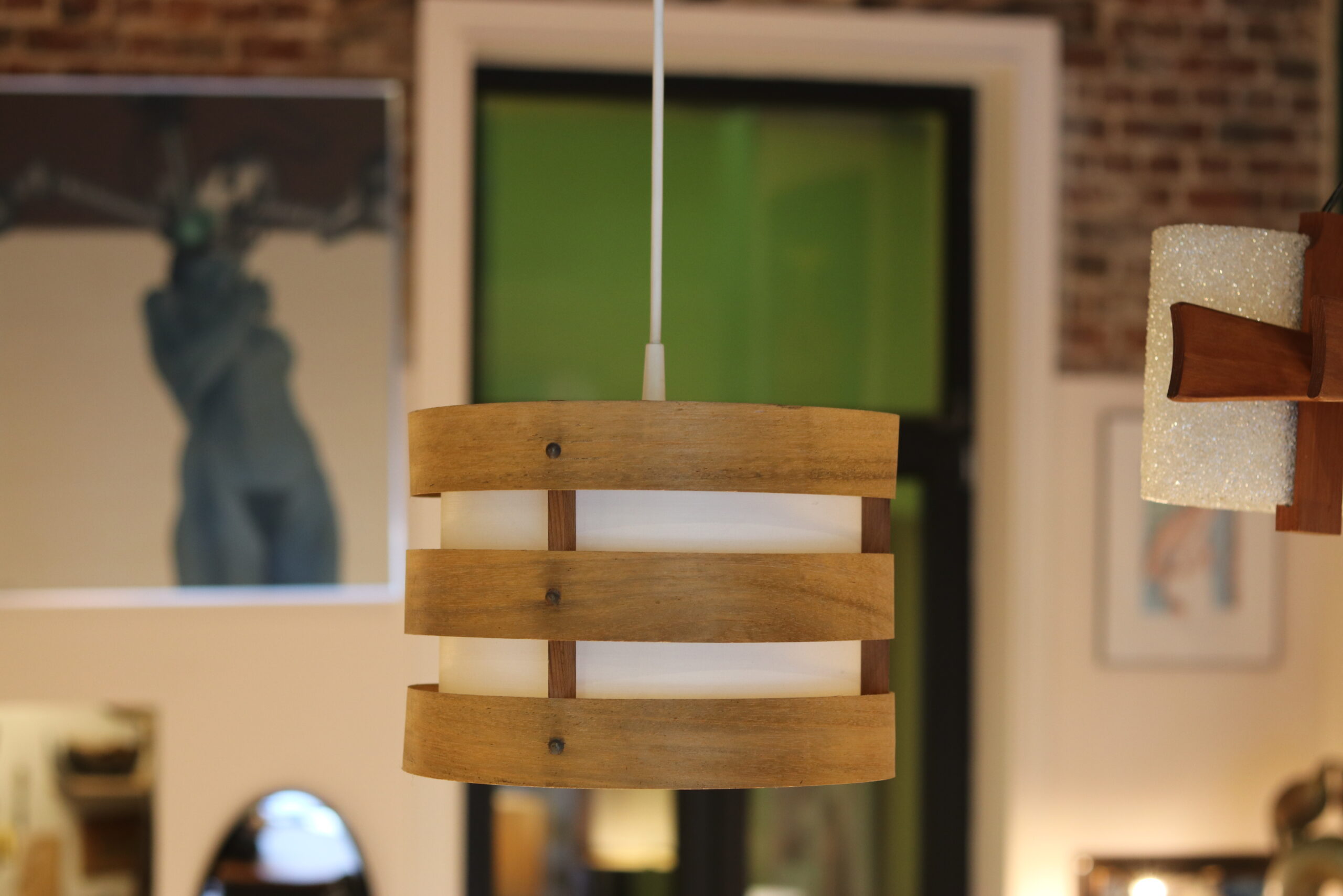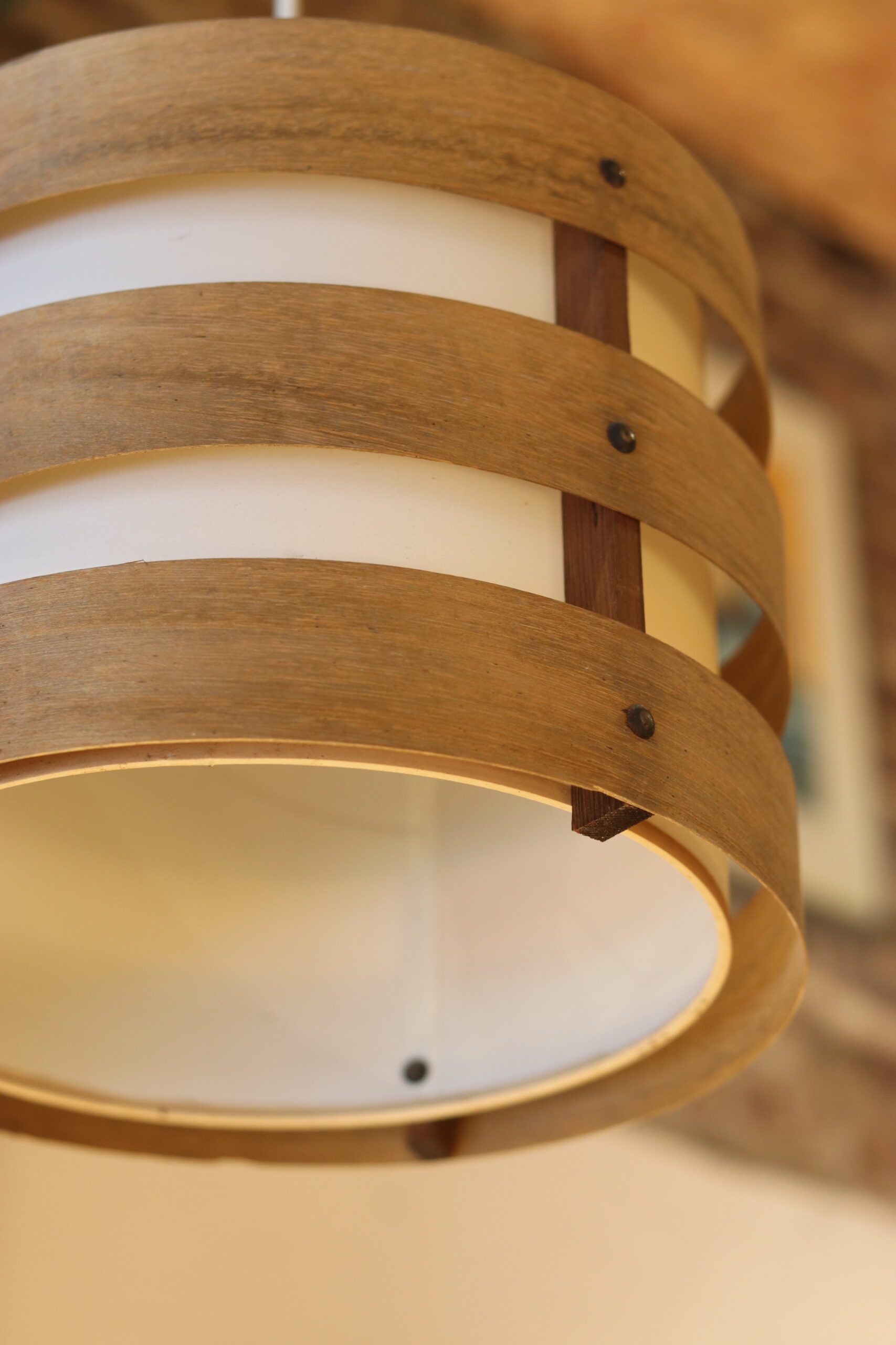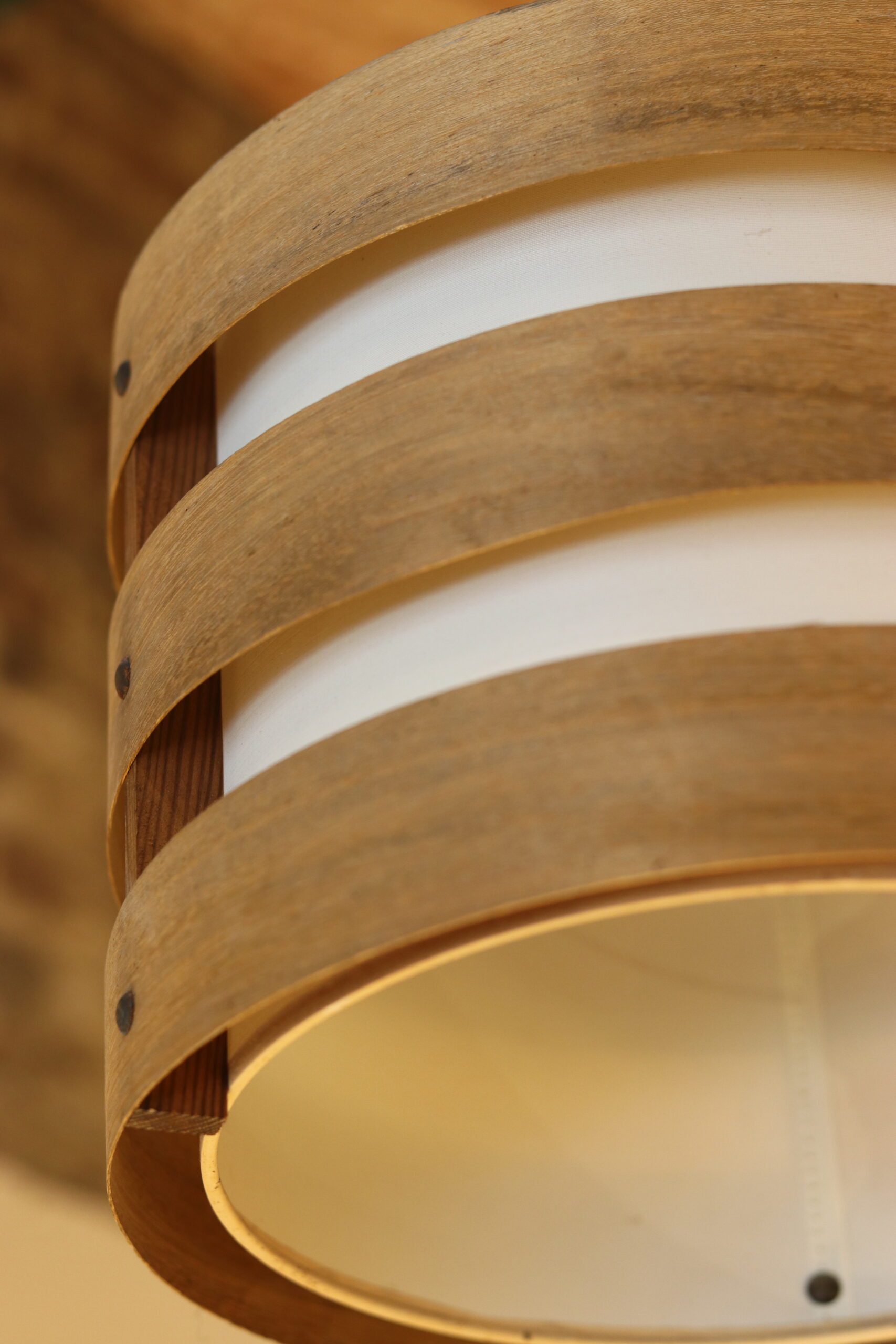Suspension vintage Linus Bopp (Allemagne, 1960/70), bois cintré et abat-jour textile blanc.