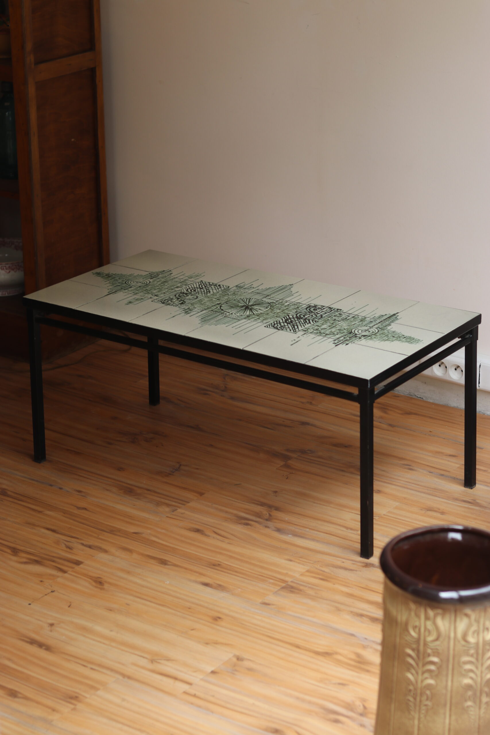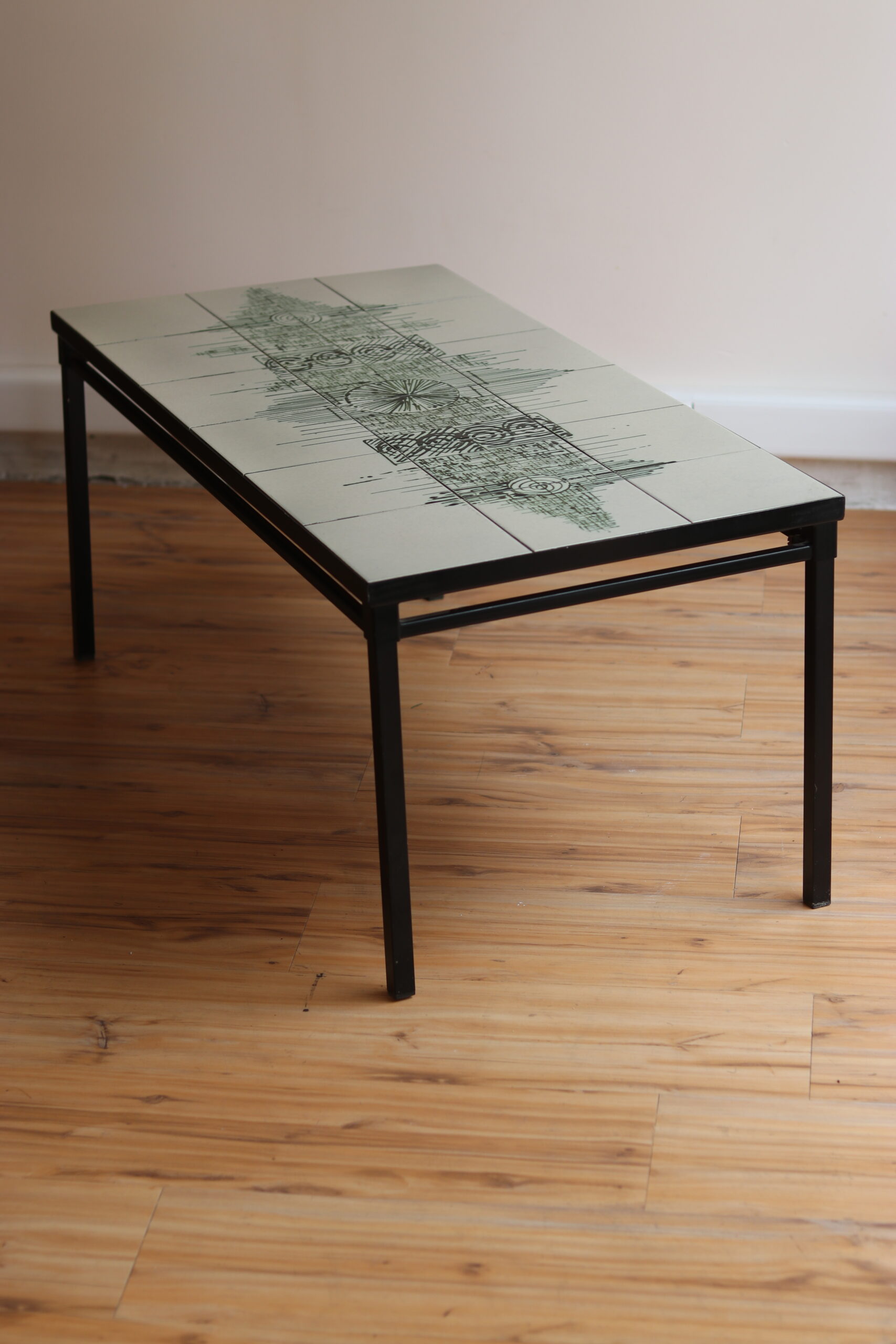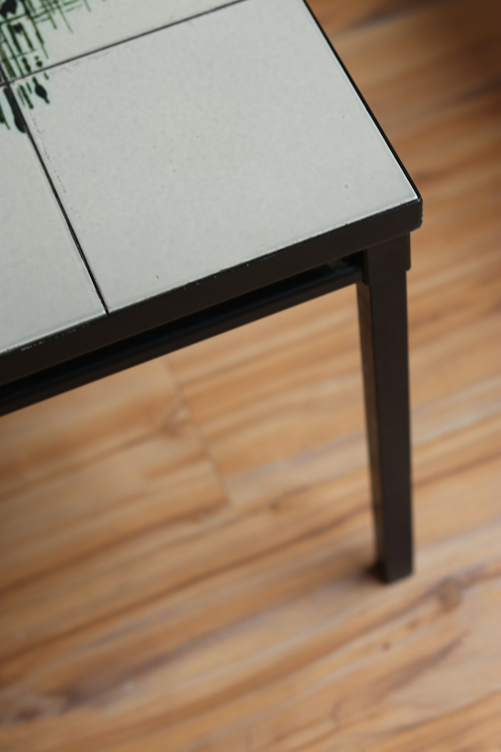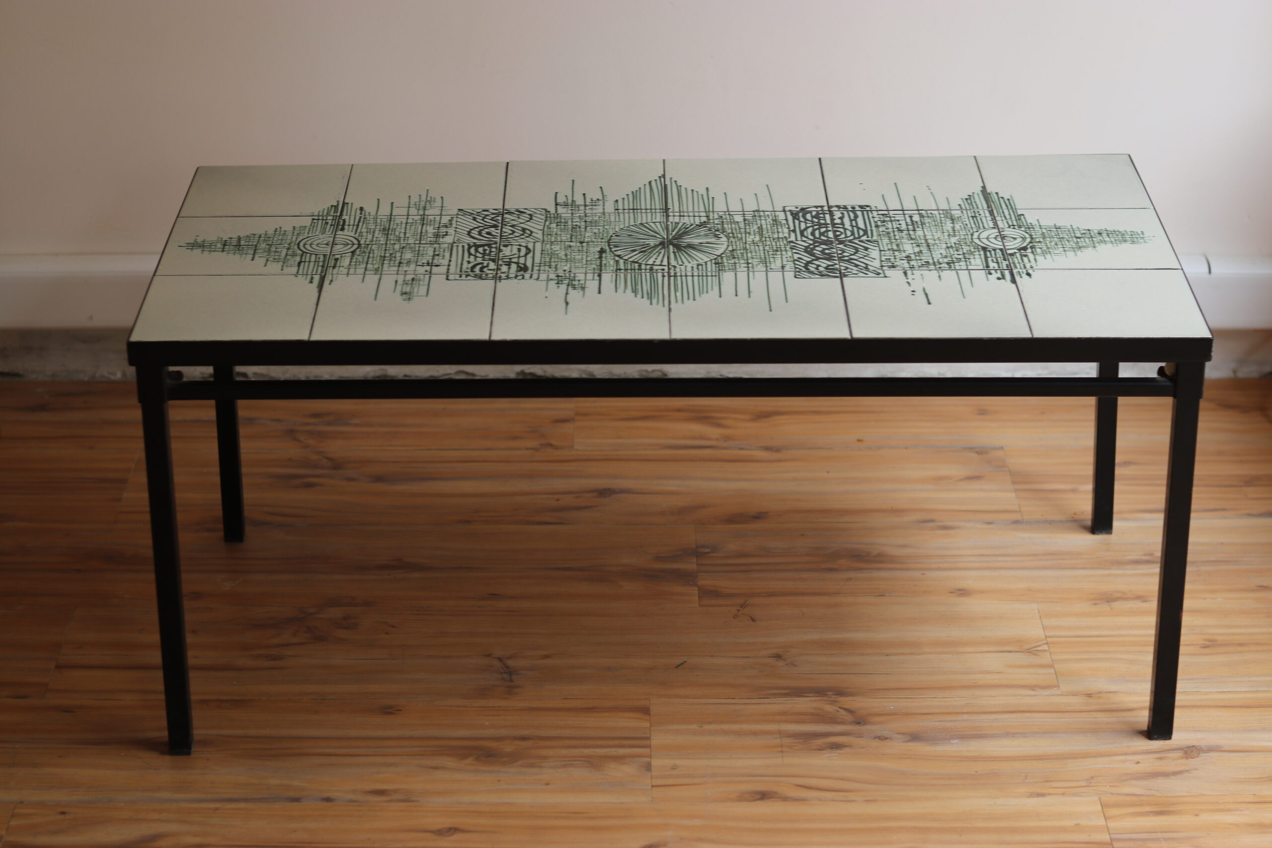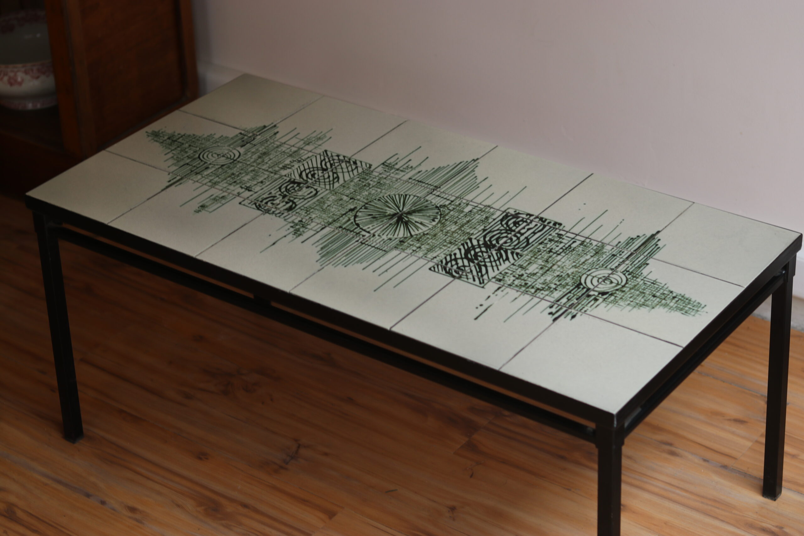 Élégante table basse vintage au design graphique, associant une structure en métal laqué noir à un plateau composé de carreaux de céramique. Les motifs géométriques verts sur fond beige apportent un rythme visuel subtil et typique des productions des années 1950-60.