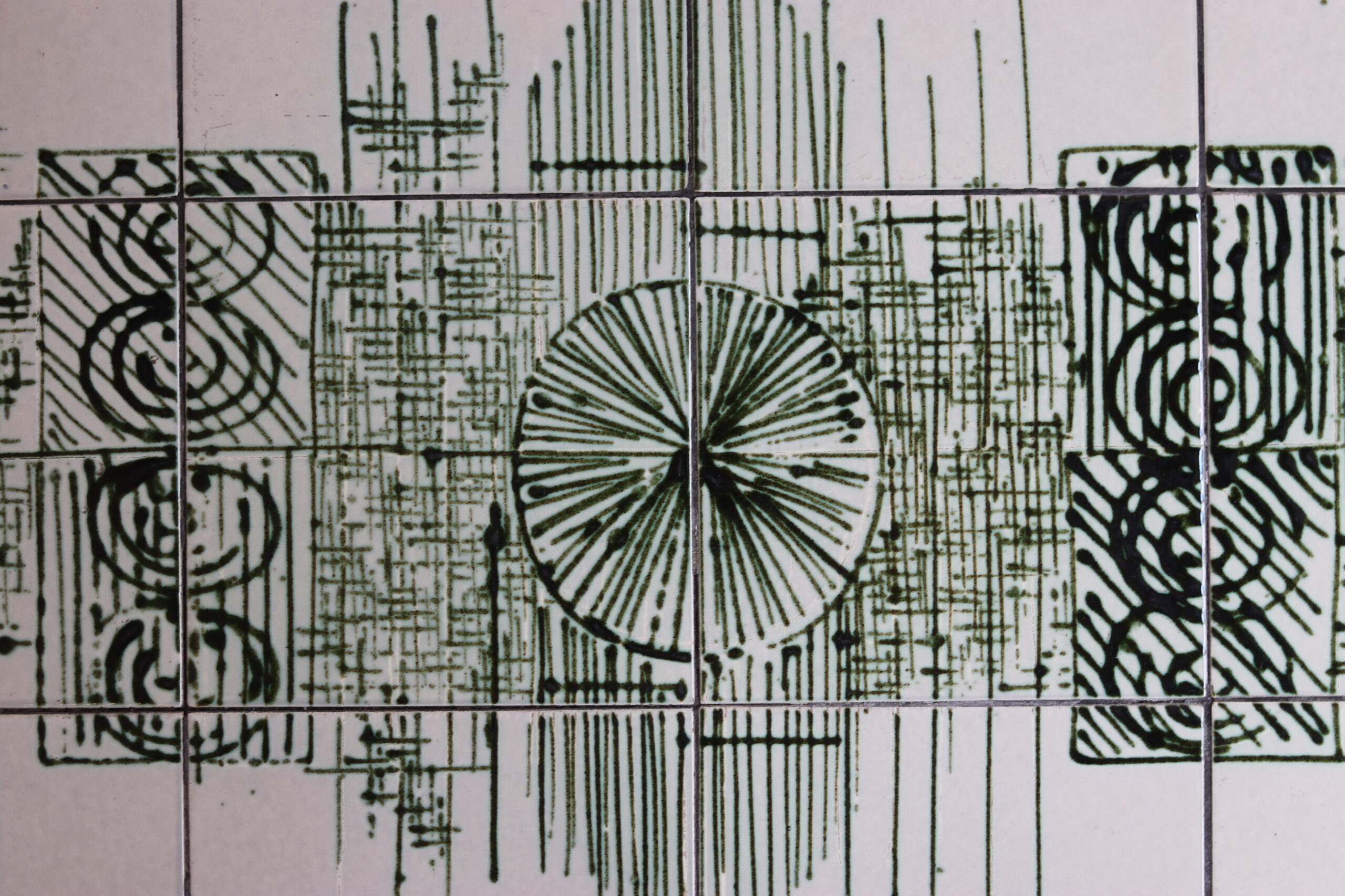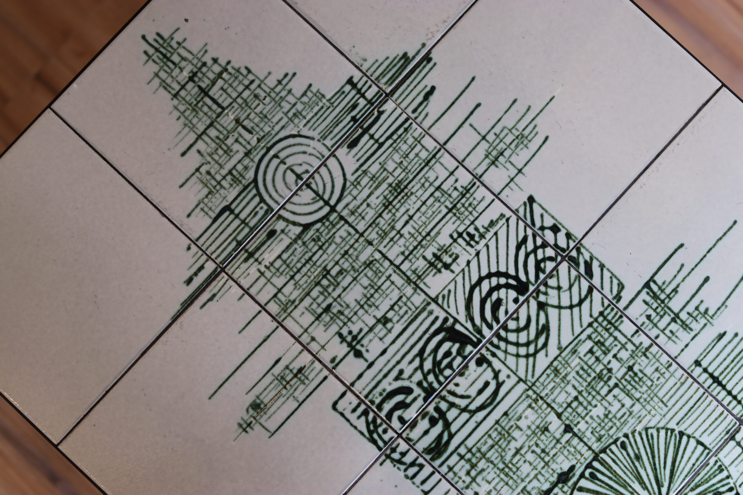 Le contraste entre la finesse du piètement et la richesse décorative du plateau en fait une pièce à la fois légère et expressive. Les carreaux présentent un décor abstrait structuré, presque architectural, qui attire le regard sans alourdir l’ensemble.