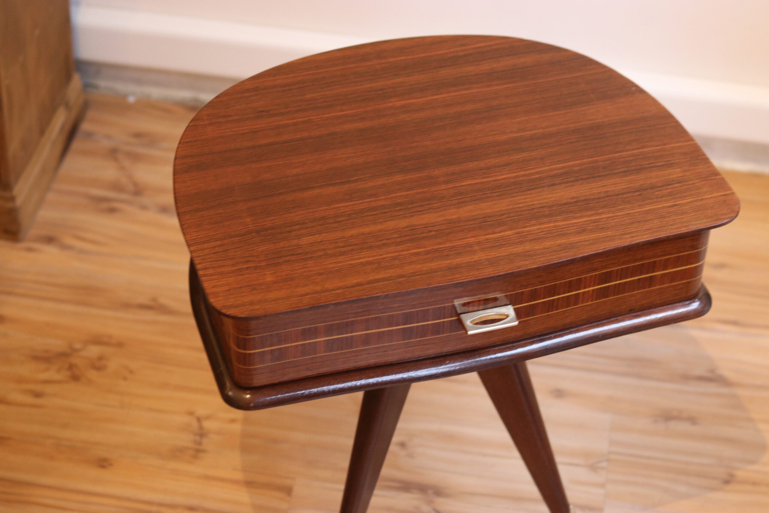 Table d’appoint 1950 en acajou et laiton, tripode avec in tiroir. A noter, une fente du placage sur le dessus.