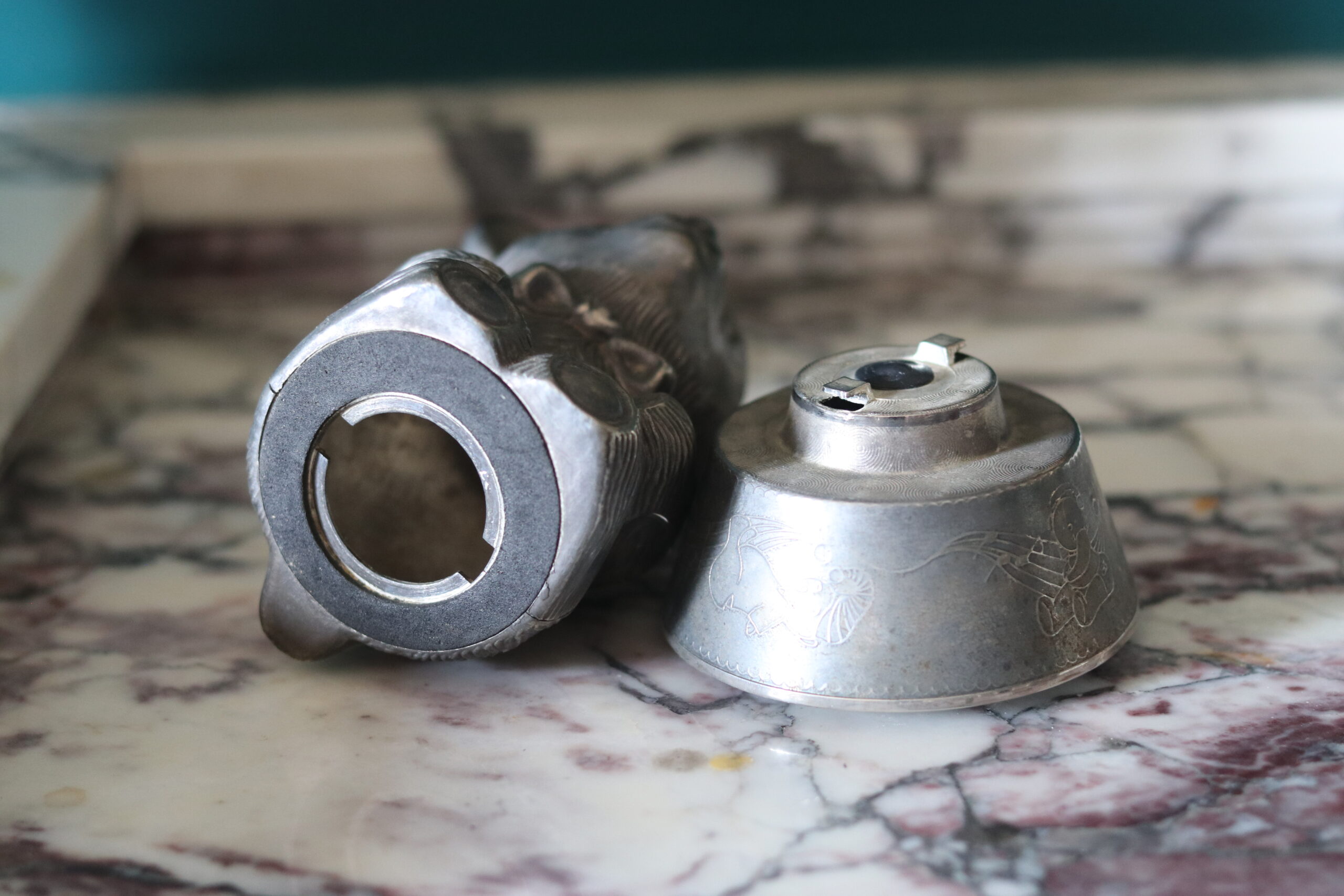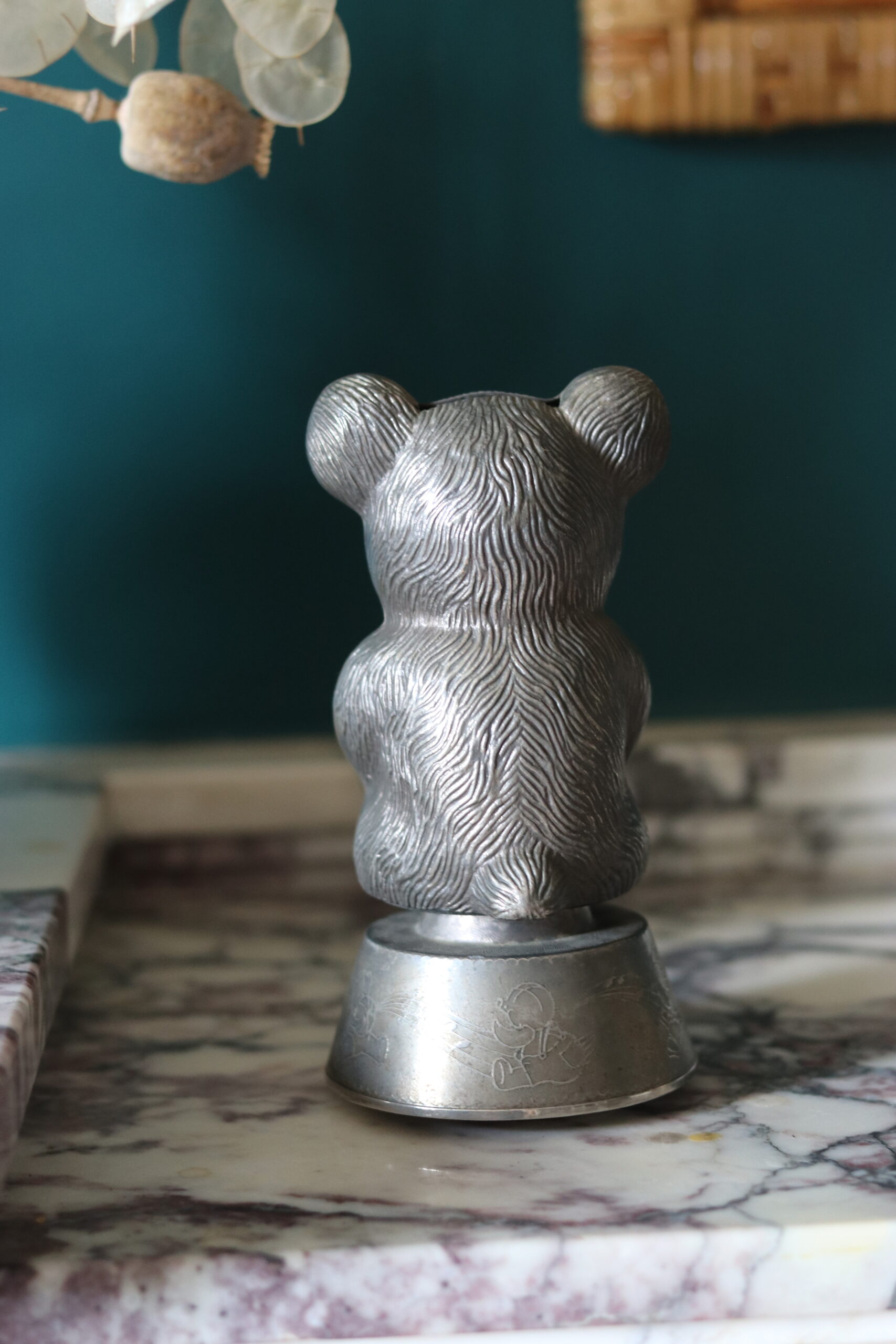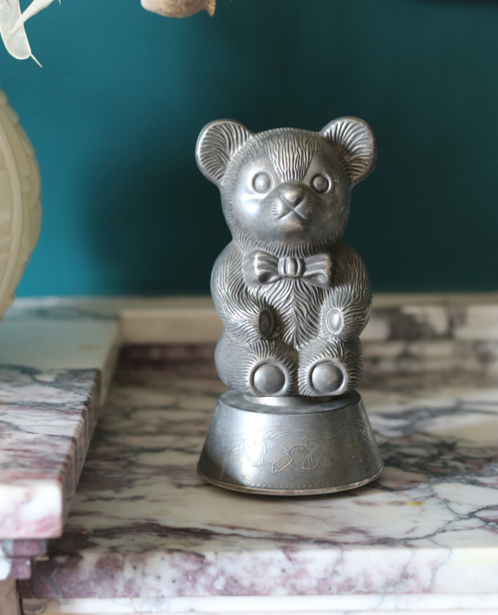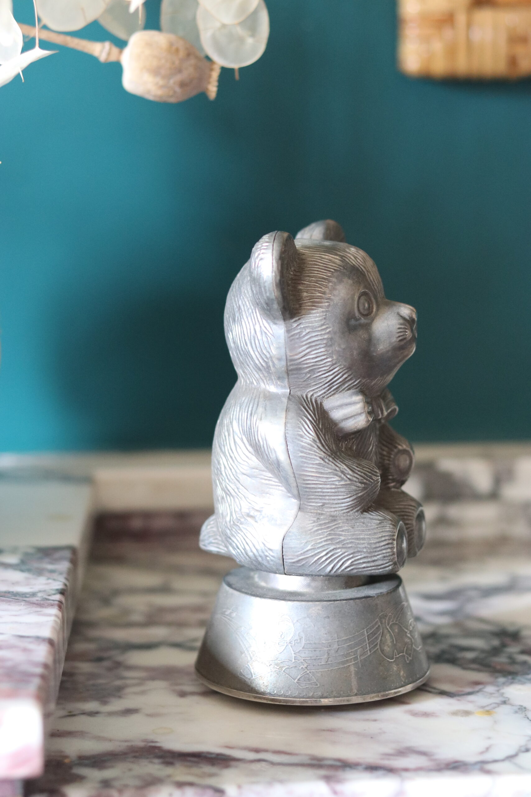 Charmante tirelire musicale vintage en métal coulé, figurant un ourson assis orné d’un nœud papillon. Datant des années 1960-70, probablement d’origine japonaise ou allemande, elle associe fonction ludique et décorative : l’insertion d’une pièce déclenche une petite mélodie. Le mécanisme fonctionne encore, bien que le son soit imparfait avec le temps. Avec ses motifs gravés naïfs et son design attendrissant, elle constitue une belle pièce de collection, idéale pour les amateurs d’objets rétro et de curiosités mécaniques.