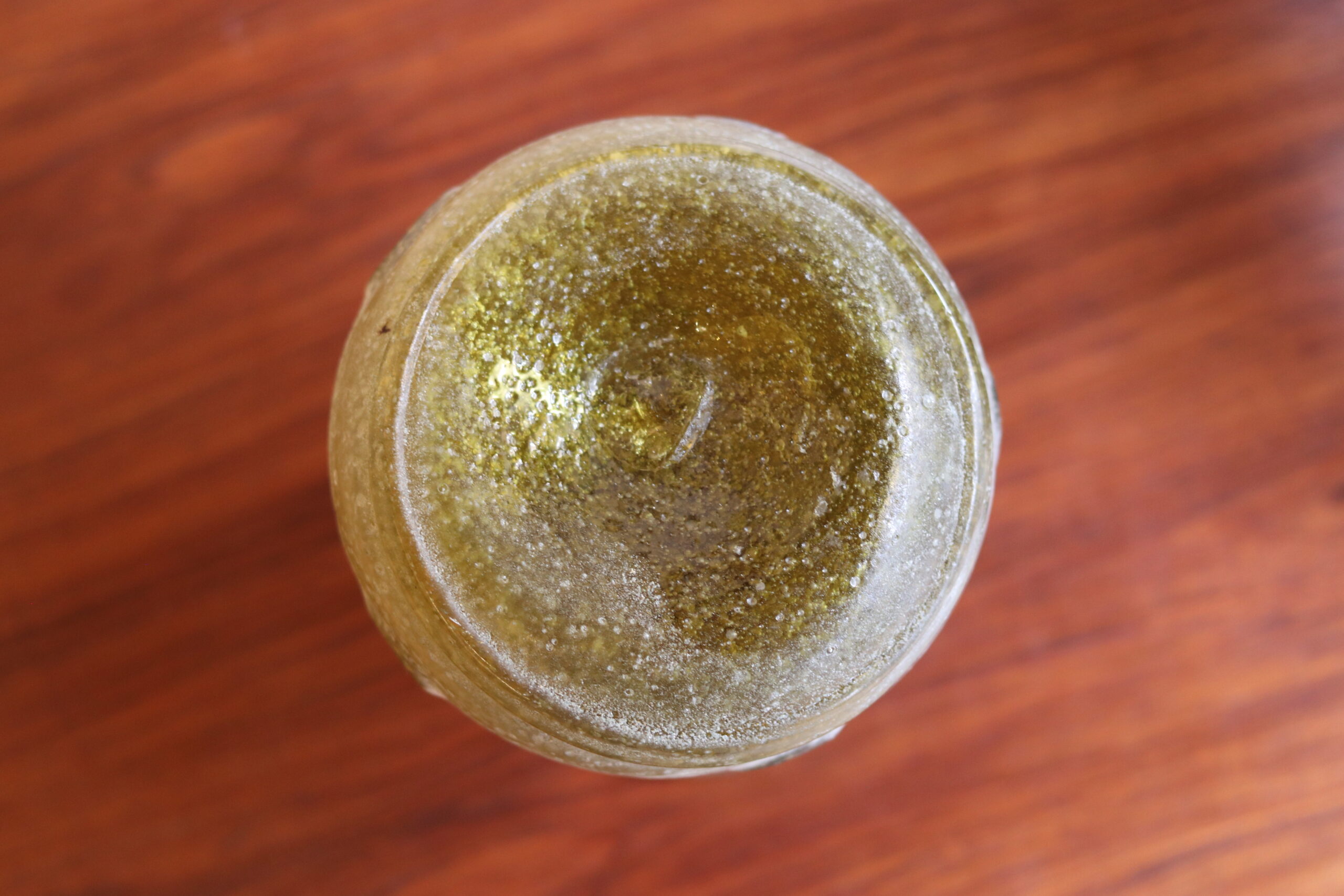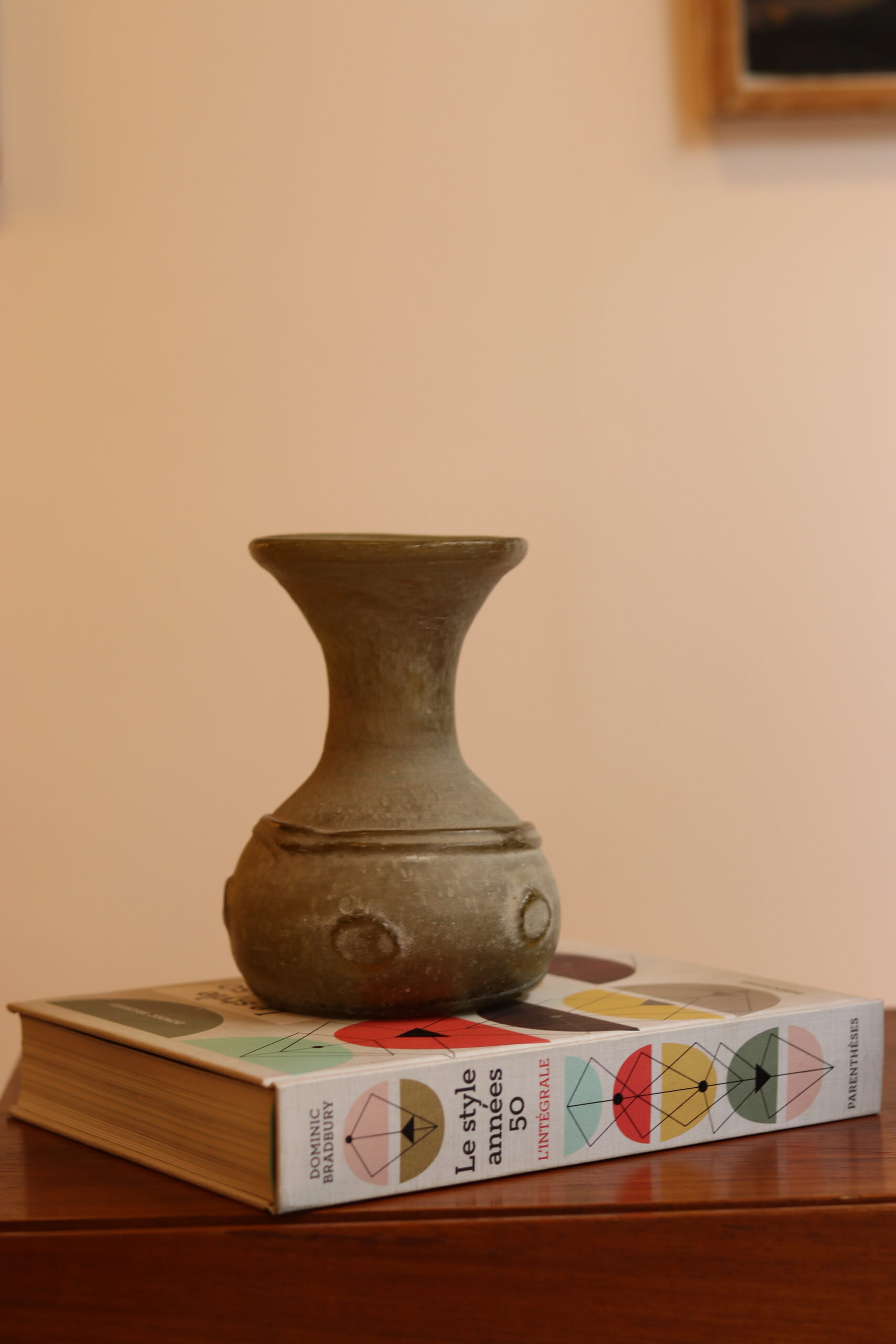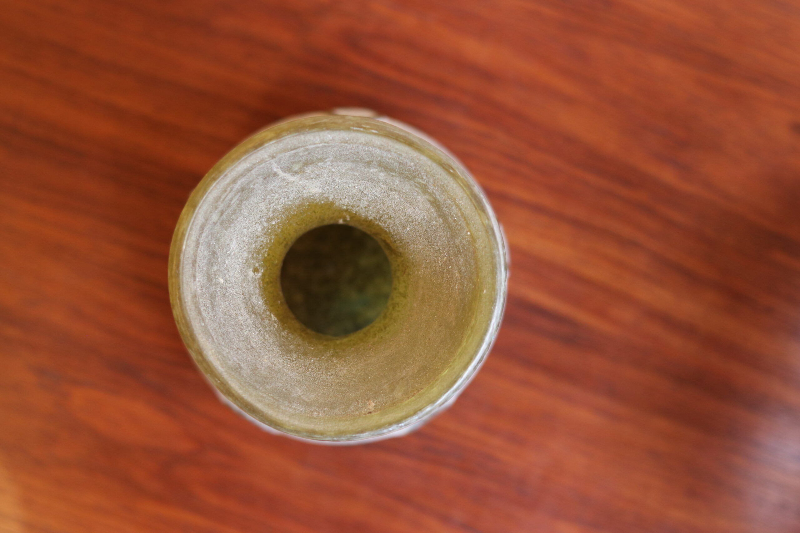 Vase en verre soufflé « scavo », Italie vers 1950. Cette technique particulière consiste à appliquer des poudres minérales et des acides sur le verre afin de lui donner l’aspect patiné et corrodé des pièces antiques. Dimensions : H 18 x 13 cm